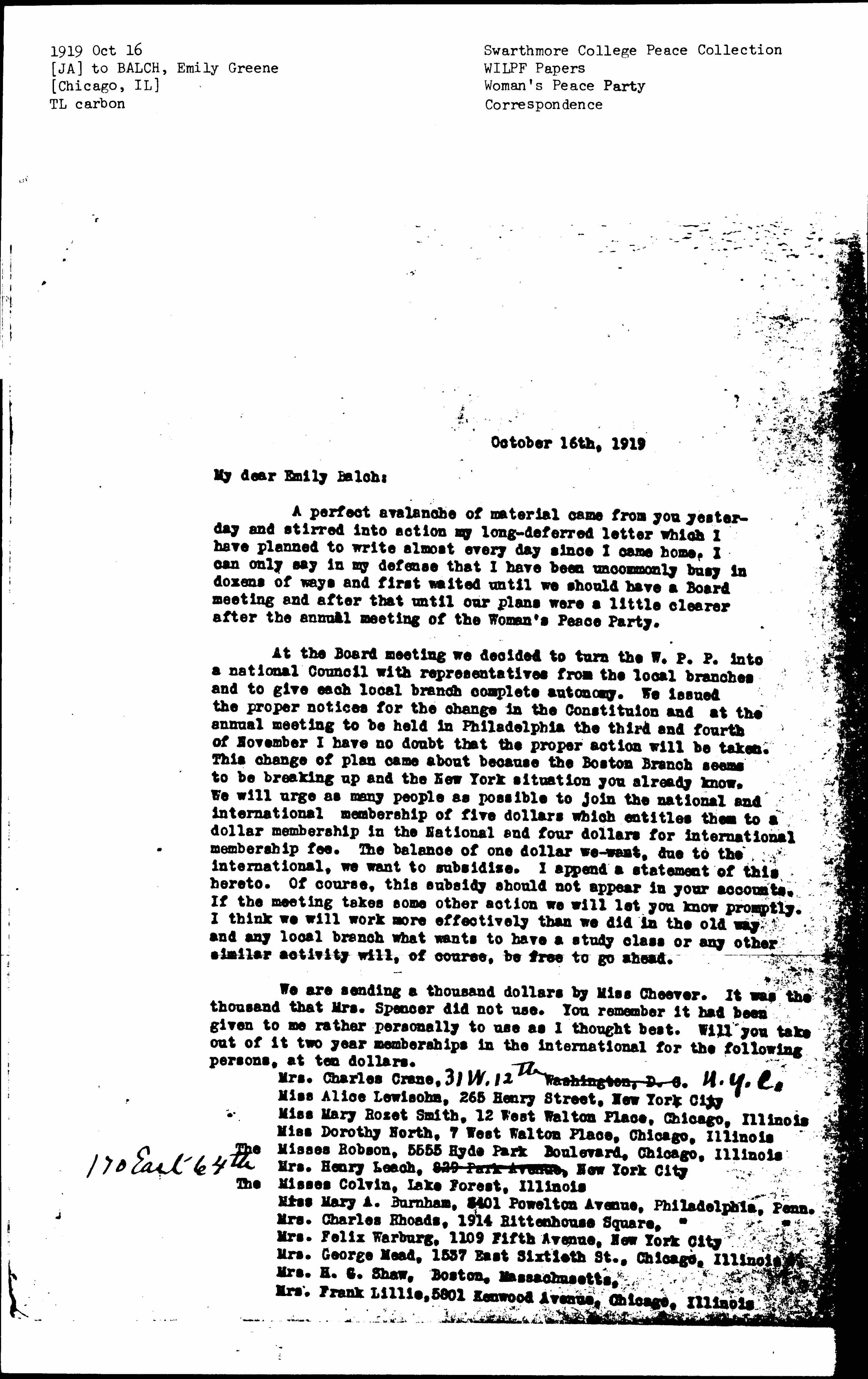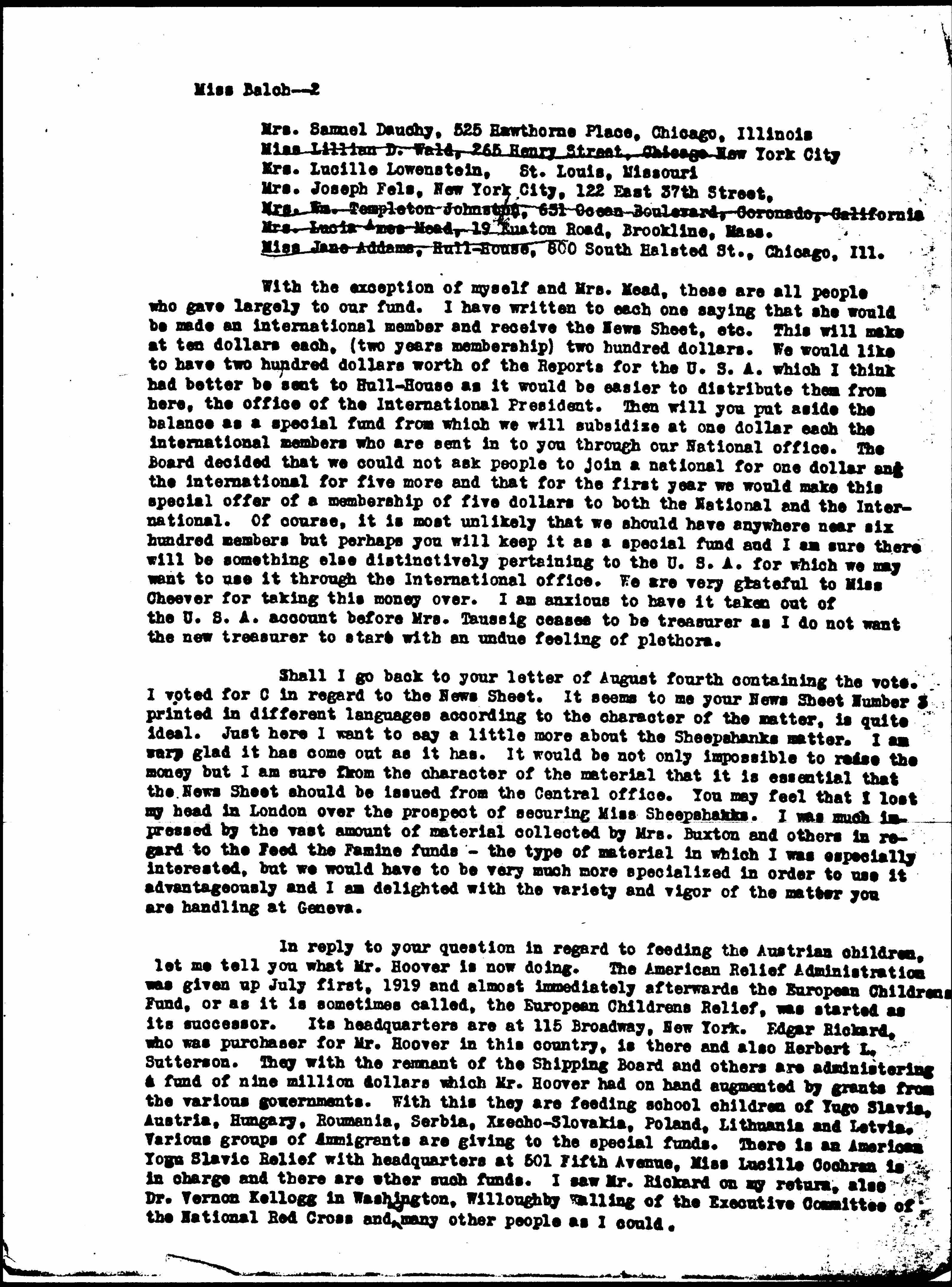 With the exception of myself and Mrs. Mead, these are all people who gave largely to our fund. I have written to each one saying that she would be made an international member and receive the News Sheet, etc. This will make at ten dollars each, (two years membership) two hundred dollars. We would like to have two hundred dollars worth of the Reports for the U.S.A. which I think had better be sent to Hull-House as it would be easier to distribute them from here, the office of the International President. Then will you put aside the balance as a special fund from which we will subsidize at one dollar each the international members who are sent in to you through our National office. The Board decided that we could not ask people to join a national for one dollar and the international for five more and that for the first year we would make this special offer of a membership of five dollars to both the National and the International. Of course, it is most unlikely that we should have anywhere near six hundred members but perhaps you will keep it as a special fund and I am sure there will be something else distinctively pertaining to the U.S.A. for which we may want to use it through the International office. We are very grateful to Miss Cheever for taking this money over. I am anxious to have it taken out of the U.S.A. account before Mrs. Taussig ceases to be treasurer as I do not want the new treasurer to start with an undue feeling of plethora.