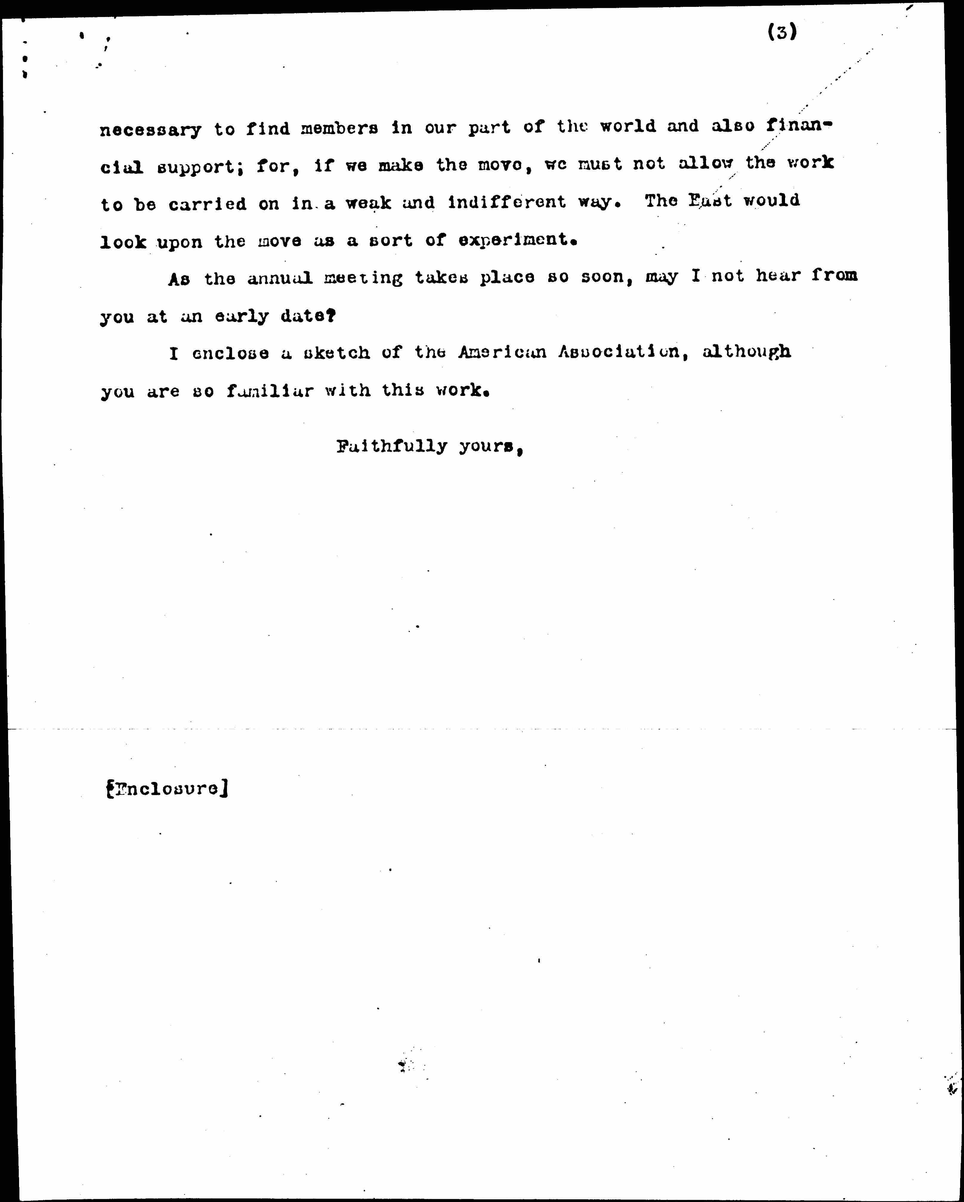 Can we not change all this? May we not count on your active [cooperation]? I know how busy you are, but this Association is of so much importance that perhaps you will feel that you could well place it high among your activities as it will help the other things that you are interested in if properly developed. It will be [page 3] necessary to find members in our part of the world and also financial support; for, if we make the move, we must not allow the work to be carried on in a weak and indifferent way. The East would look upon the move as a sort of experiment.