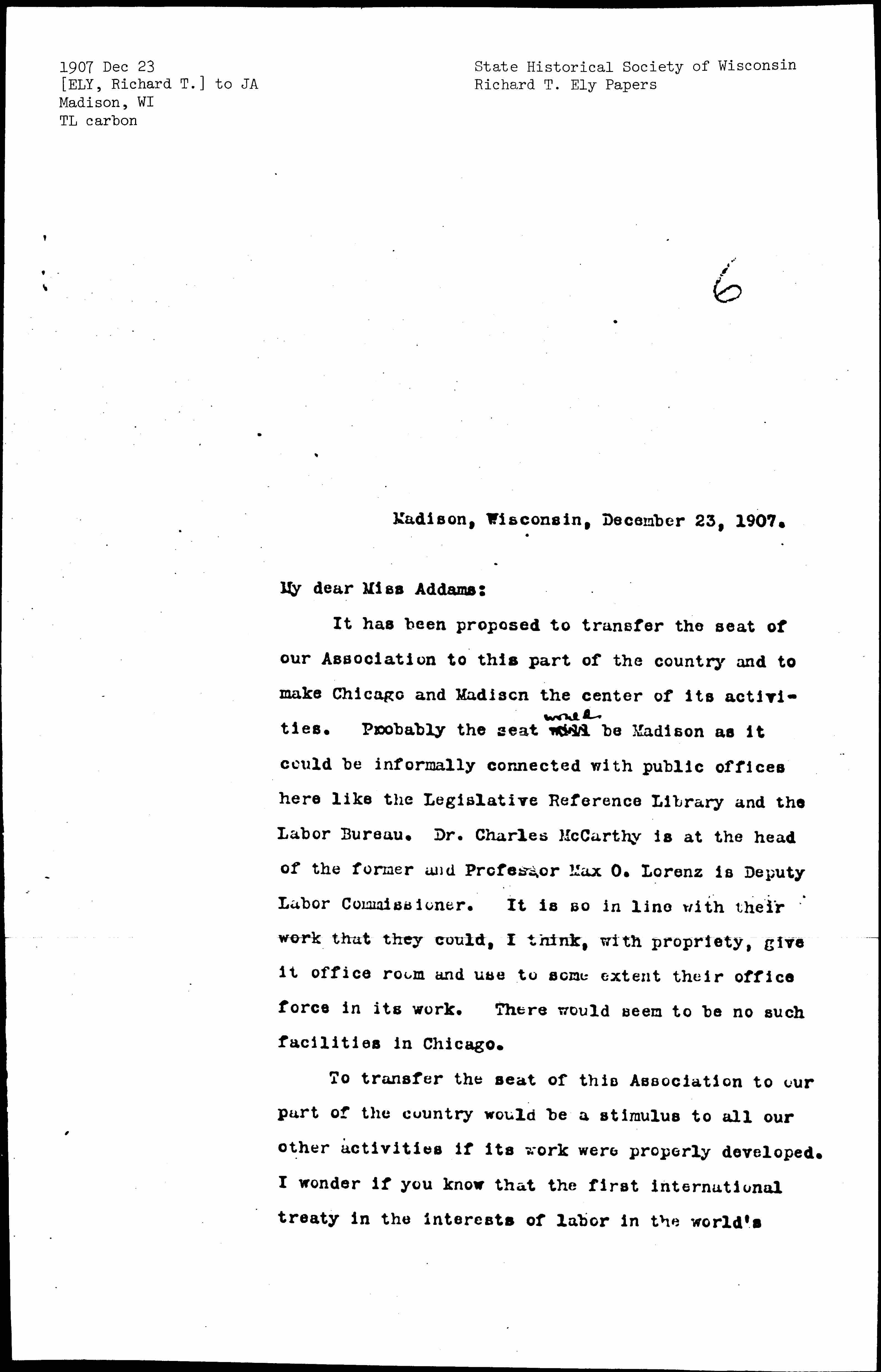 It has been proposed to transfer the seat of our Association to this part of the country and to make Chicago and Madison the center of its activities. Probably the seat would be Madison as it could be informally connected with public offices here like the Legislative Reference Library and the Labor Bureau. Dr. Charles McCarthy is at the head of the former and Professor Max O. Lorenz is Deputy Labor Commissioner. It is so in line with their work that they could, I think, with propriety, give it office room and use to some extent their office force in its work. There would seem to be no such facilities in Chicago.