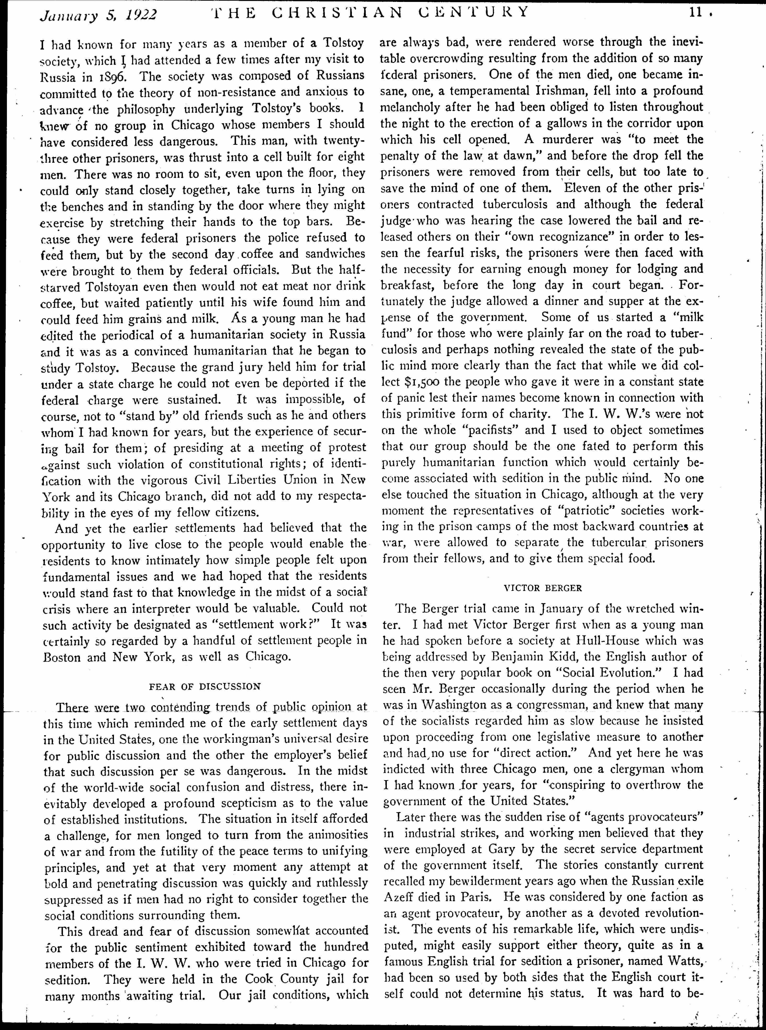 One Russian among those arrested on January 1, 1920, [page 2] I had known for many years as a member of a Tolstoy society, which I had attended a few times after my visit to Russia in 1896. The society was composed of Russians committed to the theory of [nonresistance] and anxious to advance the philosophy underlying Tolstoy's books. I knew of no group in Chicago whose members I should have considered less dangerous. This man, with twenty-three other prisoners, was thrust into a cell built for eight men. There was no room to sit, even upon the floor, they could only stand closely together, take turns in lying on the benches and in standing by the door where they might exercise by stretching their hands to the top bars. Because they were federal prisoners the police refused to feed them, but by the second day coffee and sandwiches were brought to them by federal officials. But the half-starved [Tolstoian] even then would not eat meat nor drink coffee, but waited patiently until his wife found him and could feed him grains and milk. As a young man he had edited the periodical of a humanitarian society in Russia and it was as a convinced humanitarian that he began to study Tolstoy. Because the grand jury held him for trial under a state charge he could not even be deported if the federal charge were sustained. It was impossible, of course, not "stand by" old friends such as he and others whom I had known for years, but the experience of securing bail for them; of presiding at a meeting of protest against such violation of constitutional rights; of identification with the vigorous Civil Liberties Union in New York and its Chicago branch, did not add to my respectability in the eyes of my fellow citizens.