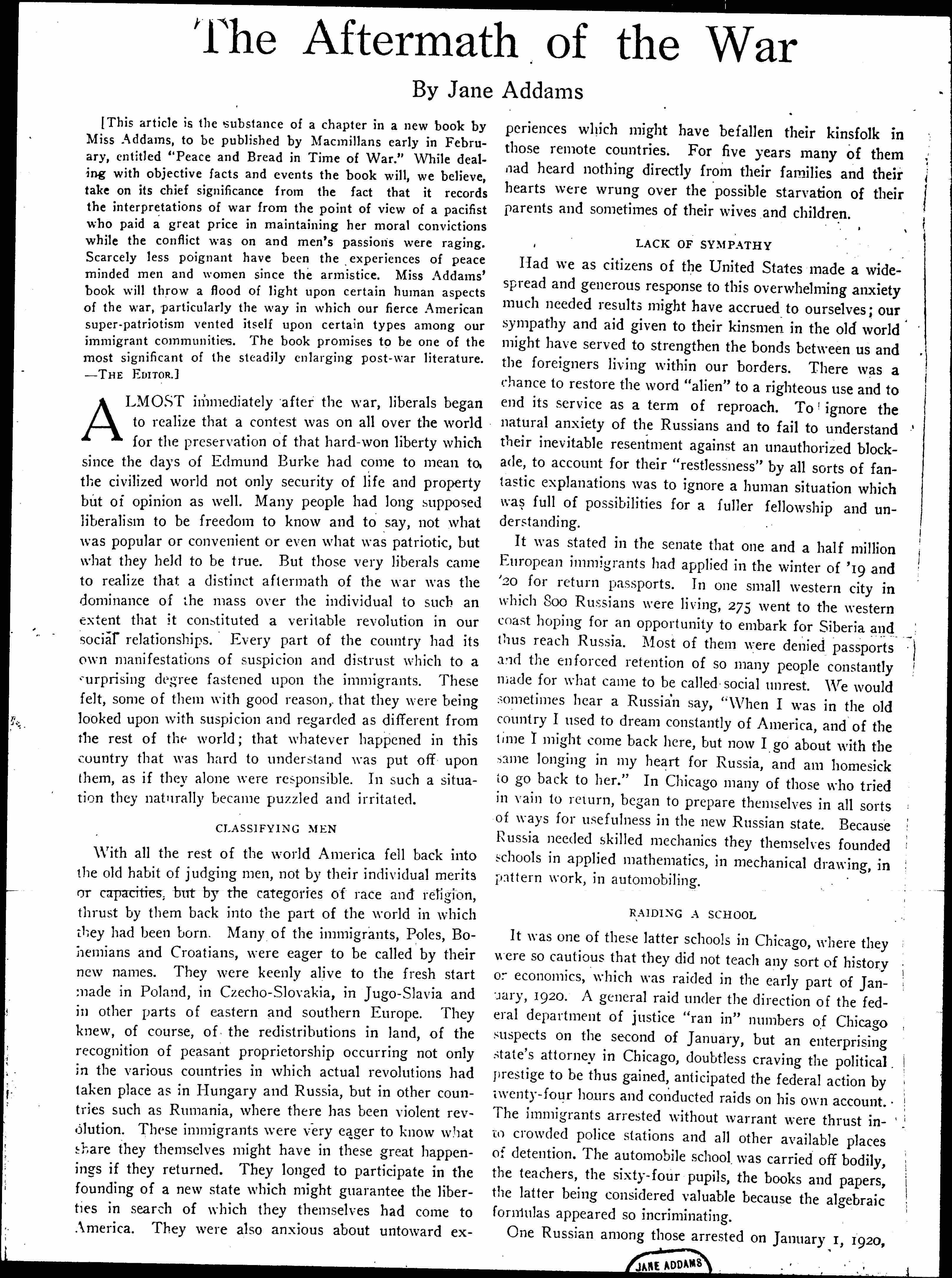{This article is the substance of a chapter in a new book by Miss Addams, to be published by Macmillans early in February, entitled "Peace and Bread in Time of War." While dealing with objective facts and events the book will, we believe, take on its chief significance from the fact that it records the interpretations of war from the point of view of a pacifist who paid a great price in maintaining her moral convictions while the conflict was on and men's passions were raging. Scarcely less poignant have been the experiences of peace minded men and women since the armistice. Miss [Addams's] book will throw a flood of light upon certain human aspects of the war, particularly the way in which our fierce American super-patriotism vented itself upon certain types among our immigrant communities the book promises to be one of the most significant of the steadily enlarging post-war literature. -- THE EDITOR.}