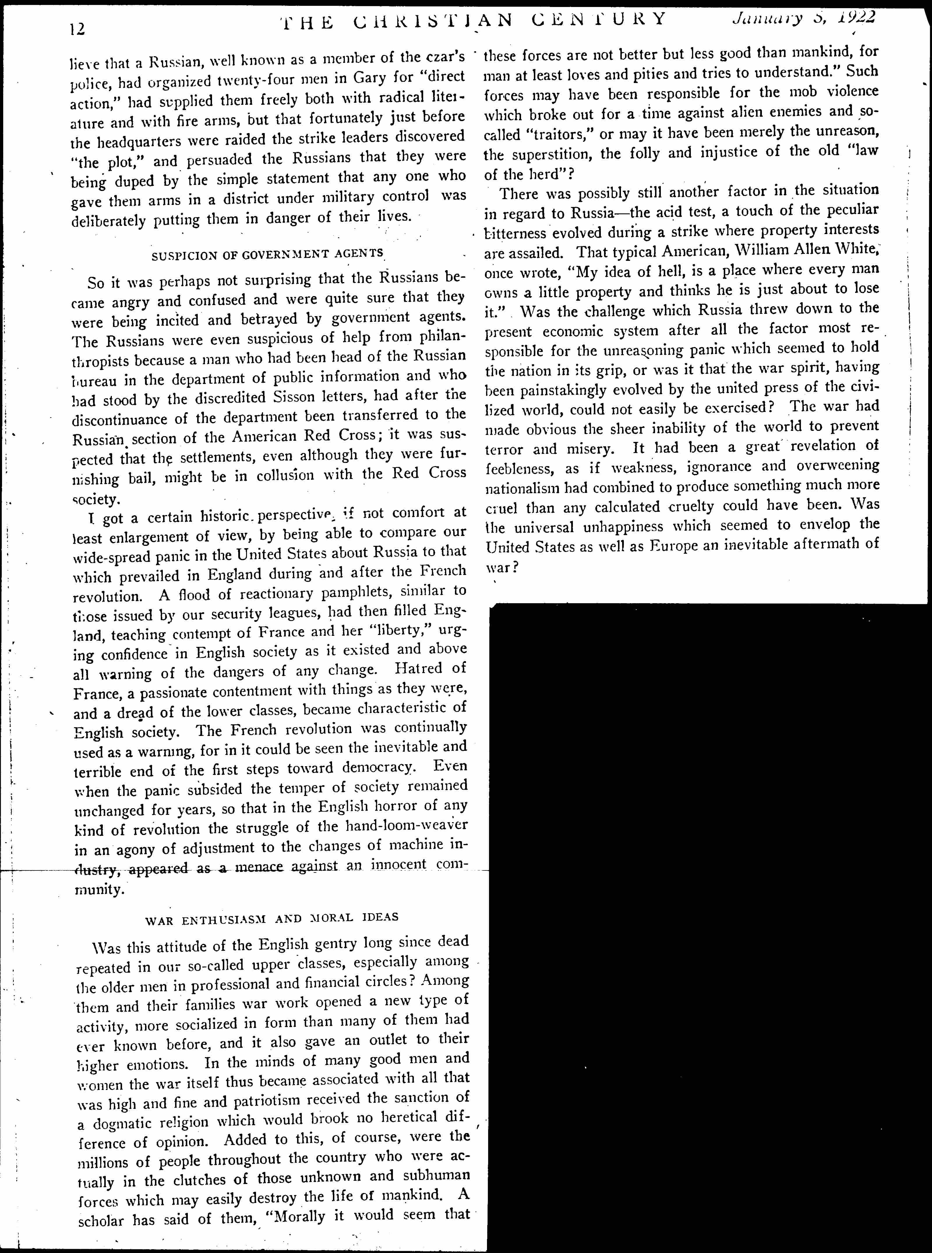 There was possibly still another factor in the situation in regard to Russia -- the acid test, a touch of the peculiar bitterness evolved during a strike where property interests are assailed. That typical American, William Allen White, once wrote, "My idea of hell, is a place where every man owns a little property and thinks he is just about to lose it." Was the challenge which Russia threw down to the present economic system after all the factor most responsible for the unreasoning panic which seemed to hold the nation in its grip, or was it that the war spirit, having been painstakingly evolved by the united press of the civilized world, could not easily be exercised? The war had made obvious the sheer inability of the world to prevent terror and misery. It had been a great revelation of feebleness, as if weakness, ignorance and overweening nationalism had combined to produce something much more cruel than any calculated cruelty could have been. Was the universal unhappiness which seemed to envelop the United States as well as Europe an inevitable aftermath of war?