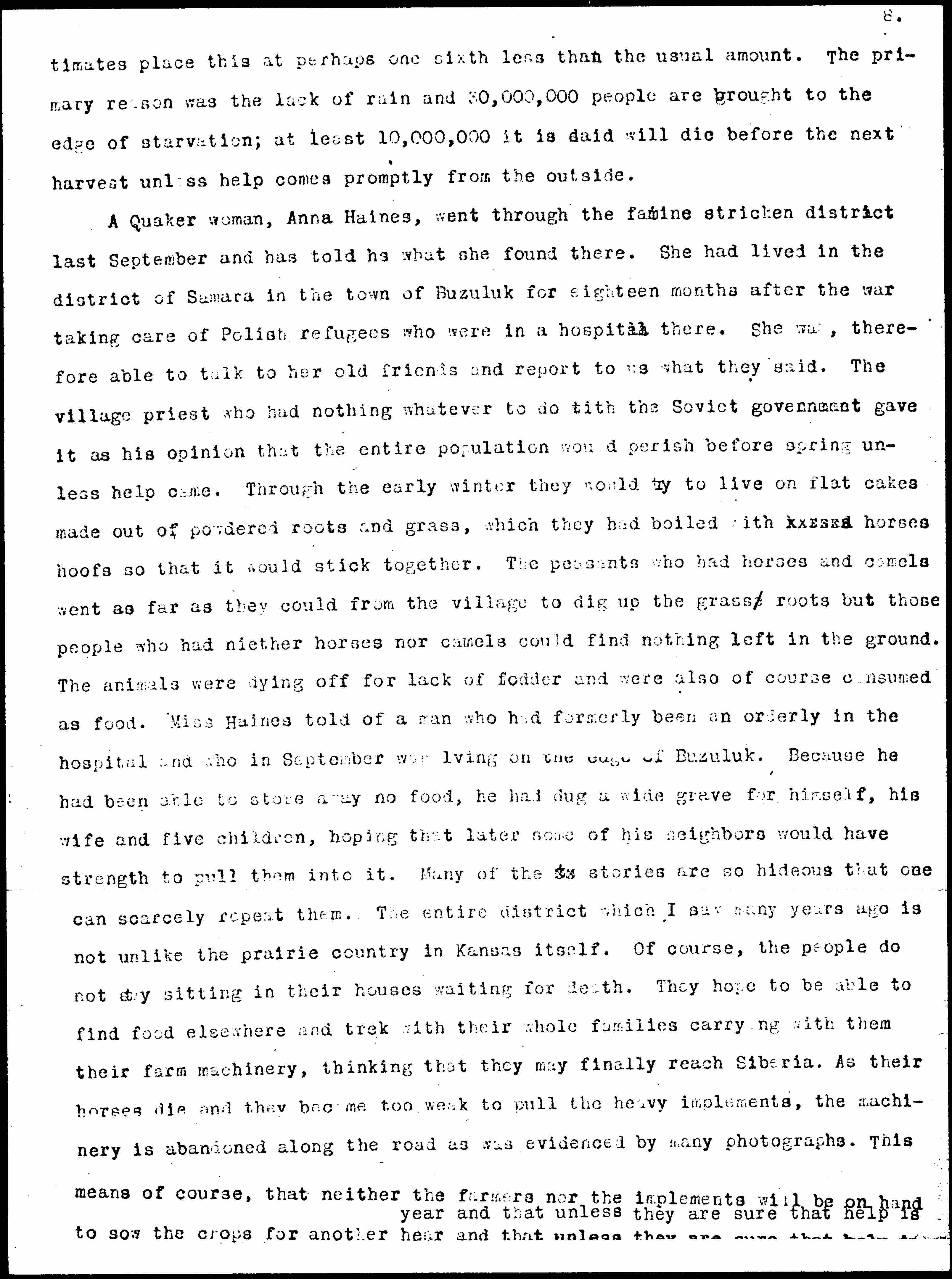 A Quaker woman, Anna Haines, went through the [famine-stricken] district last September and has told us what she found there. She had lived in the district of Samara in the town of Buzuluk for eighteen months after the war taking care of Polish refugees who were in a hospital there. She was, therefore able to talk to her old friends and report to us what they said. The village priest who had nothing whatever to do with the Soviet government gave it as his opinion that the entire population would perish before spring unless help came. Through the early winter they would try to live on flat cakes made out of powdered roots and grass, which they had boiled with horses hoofs so that it would stick together. The peasants who had horses and camels went as far as they could from the village to dig up the grass roots but those people who had neither horses nor camels could find nothing left in the ground. The animals were dying off for lack of fodder and were also of course consumed as food. Miss Haines told of a man who had formerly been an orderly in the hospital and who in September was living on the edge of Buzuluk. Because he had been able to store away no food, he had dug a wide grave for himself, his wife and five children, hoping that later some of his neighbors would have strength to pull them into it. Many of the stories are so hideous that one can scarcely repeat them. The entire district which I saw many years ago is not unlike the prairie country in Kansas itself. Of course, the people do not stay sitting in their houses waiting for death. They hope to be able to find food elsewhere and trek with their whole families carrying with them their farm machinery, thinking that they may finally reach Siberia. As their horses die and they become too weak to pull the heavy implements, the machinery is abandoned along the road as was evidenced by many photographs. This means of course, that neither the farmers nor the implements will be on hand to sow the crops for another year and that unless they are sure that help is [page 8] coming and are willing to wait for it in their own homes for, it will take years to repair the ravages of this one season of drought. Europe may become even more dependent upon the United States for food than it is now.