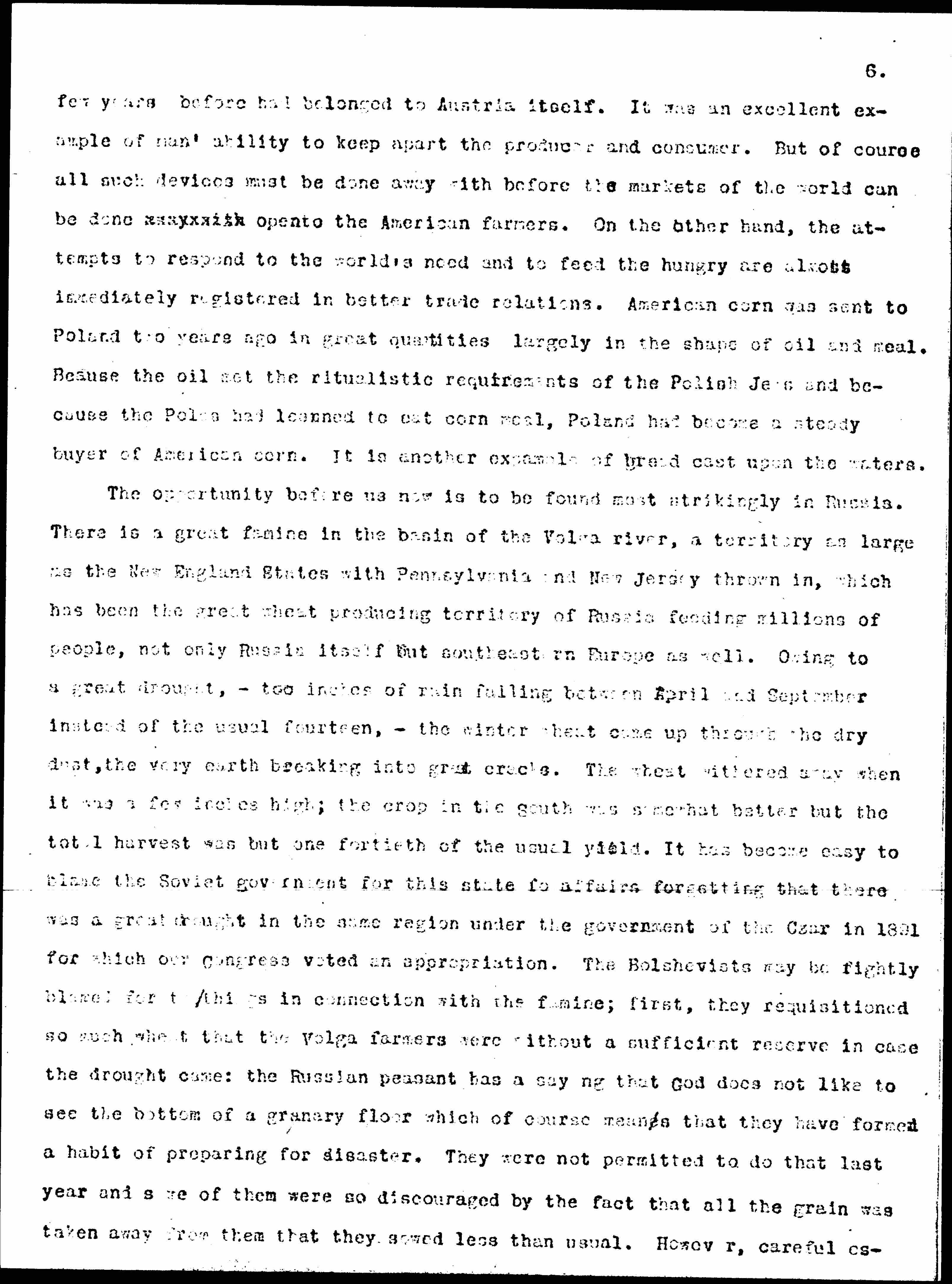 We were told in Austria last summer that it was cheaper to buy wheat from Argentina than from Hungary although it has to be hauled from Trieste to Vienna. It is because the Hungarians had no idea of selling wheat to Austria if they could sell it elsewhere. They too were being shut in by their animosities and bitter memories. The Austrians were buying sugar cheaper from Java than from the factories and sugar fields which only a [page 6] few years before had belonged to Austria itself. It was an excellent example of man's ability to keep apart the producer and consumer. But of course all such devices must be done away with before the markets of the world can be done away with open to the American farmers. On the other hand, the attempts to respond to the world's need and to feed the hungry are almost immediately registered in better trade relations. American corn was sent to Poland two years ago in great quantities largely in the shape of oil and meal. Because the oil met the ritualistic requirements of the Polish Jews and because the Poles had learned to eat corn meal, Poland had become a steady buyer of American corn. It is another example of bread cast upon the waters.