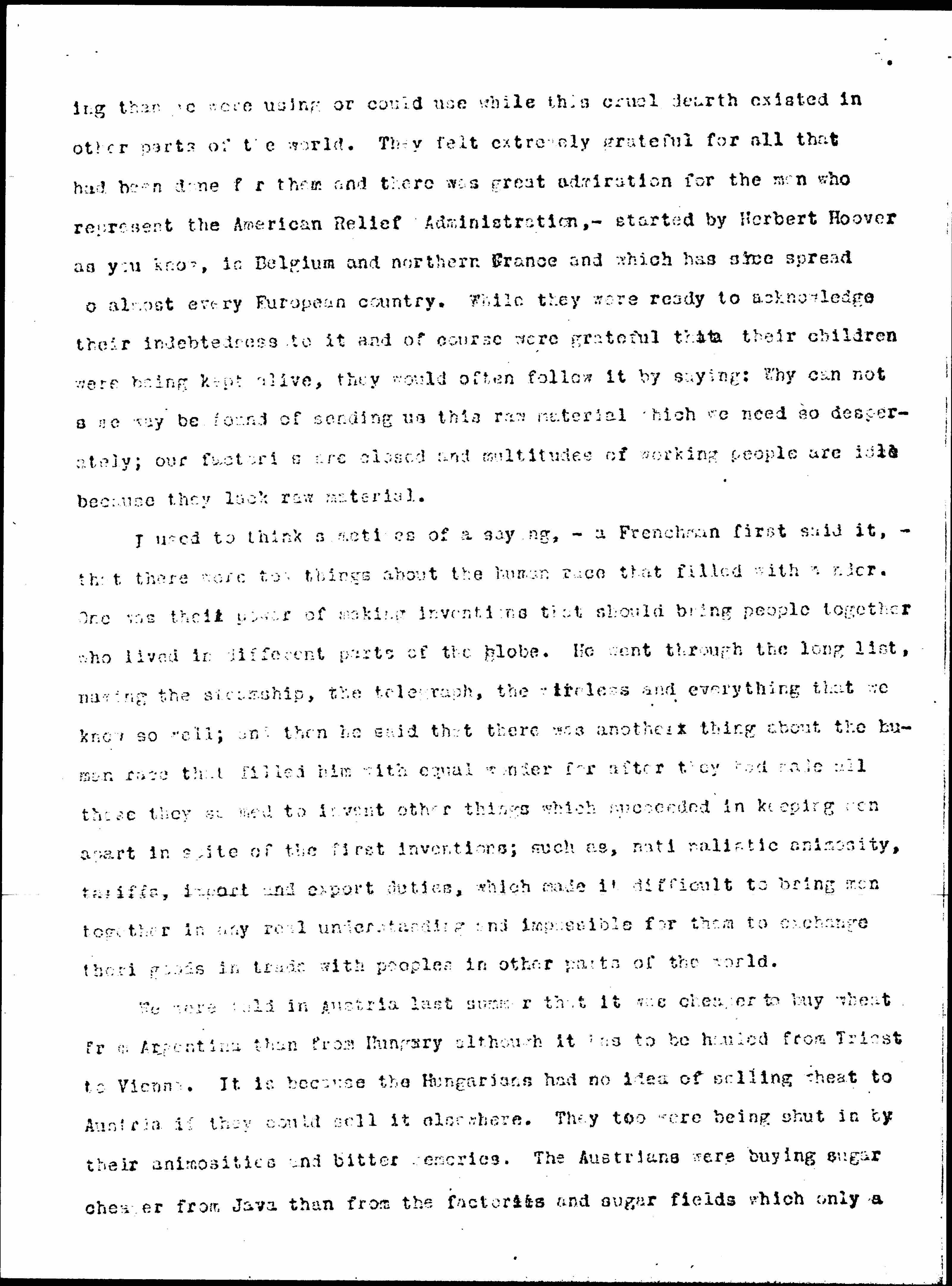 Of course, it was easy to go about and say both statements were exaggerated and we did say that; but, after all, essentially there was some truth in it. We had more raw material in the way of food, fuel and clothing [page 5] than we were using or could use while this cruel dearth existed in other parts of the world. They felt extremely grateful for all that had been done for them and there was great admiration for the men who represent the American Relief Administration, -- started by Herbert Hoover as you know, in Belgium and northern France and which has since spread to almost every European country. While they were ready to acknowledge their indebtedness to it and of course were grateful that their children were being kept alive, they would often follow it by saying: Why [cannot] some way be found of sending us this raw material which we need so desperately; our factories are closed and multitudes of working people are idle because they lack raw material.