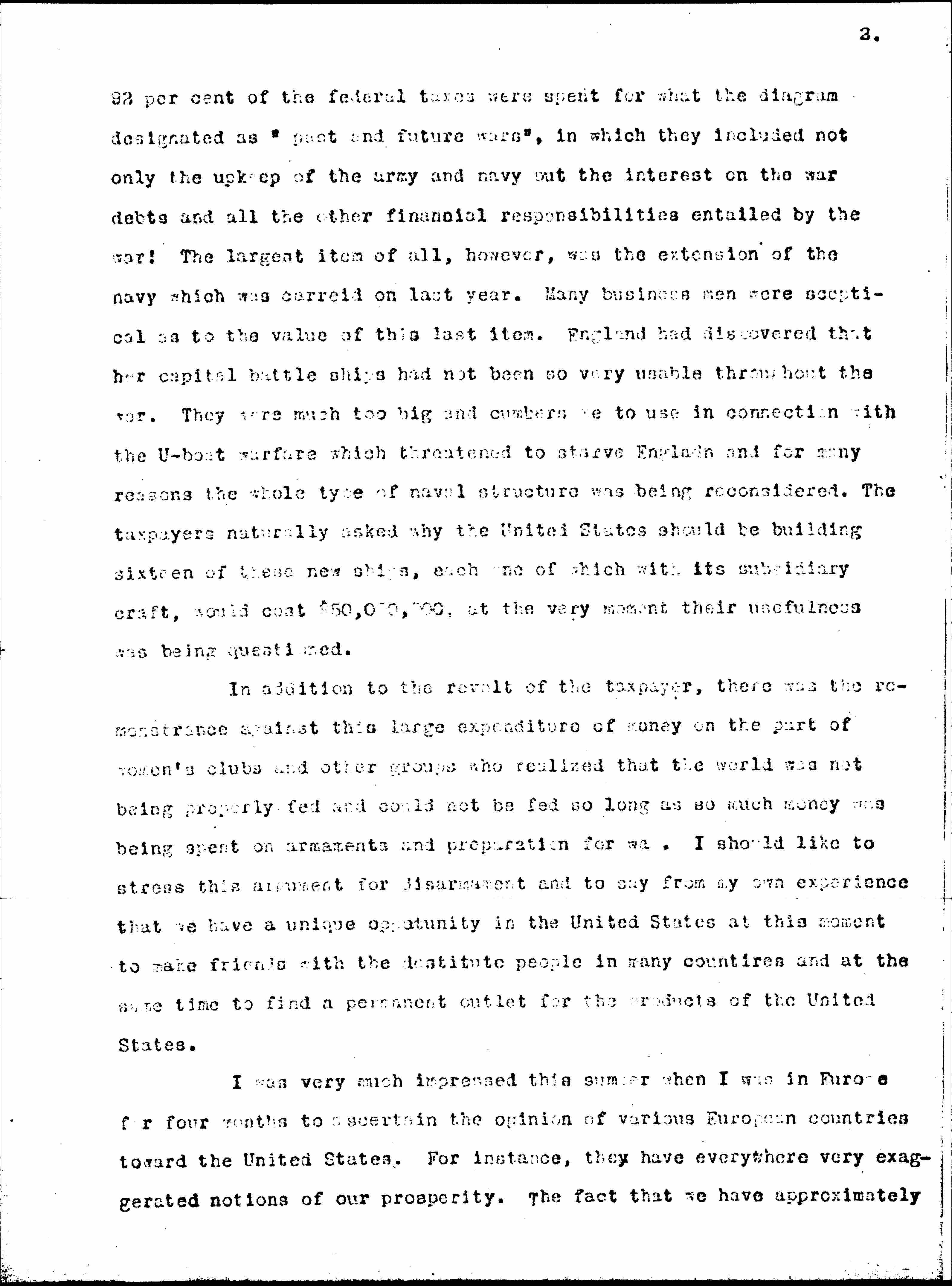 I was very much impressed this summer when I was in Europe for four months to ascertain the opinion of various European countries toward the United States. For instance, they have everywhere very exaggerated notions of our prosperity. The fact that we have approximately [page 3] one-half of the gold reserve in the world in the United States seems to them clear proof that we are literally rolling in wealth and have more prosperity than we know what to do with. They may read occasionally to the contrary but they are nevertheless quite right in believing that we are the wealthiest people on the face of the earth.