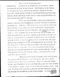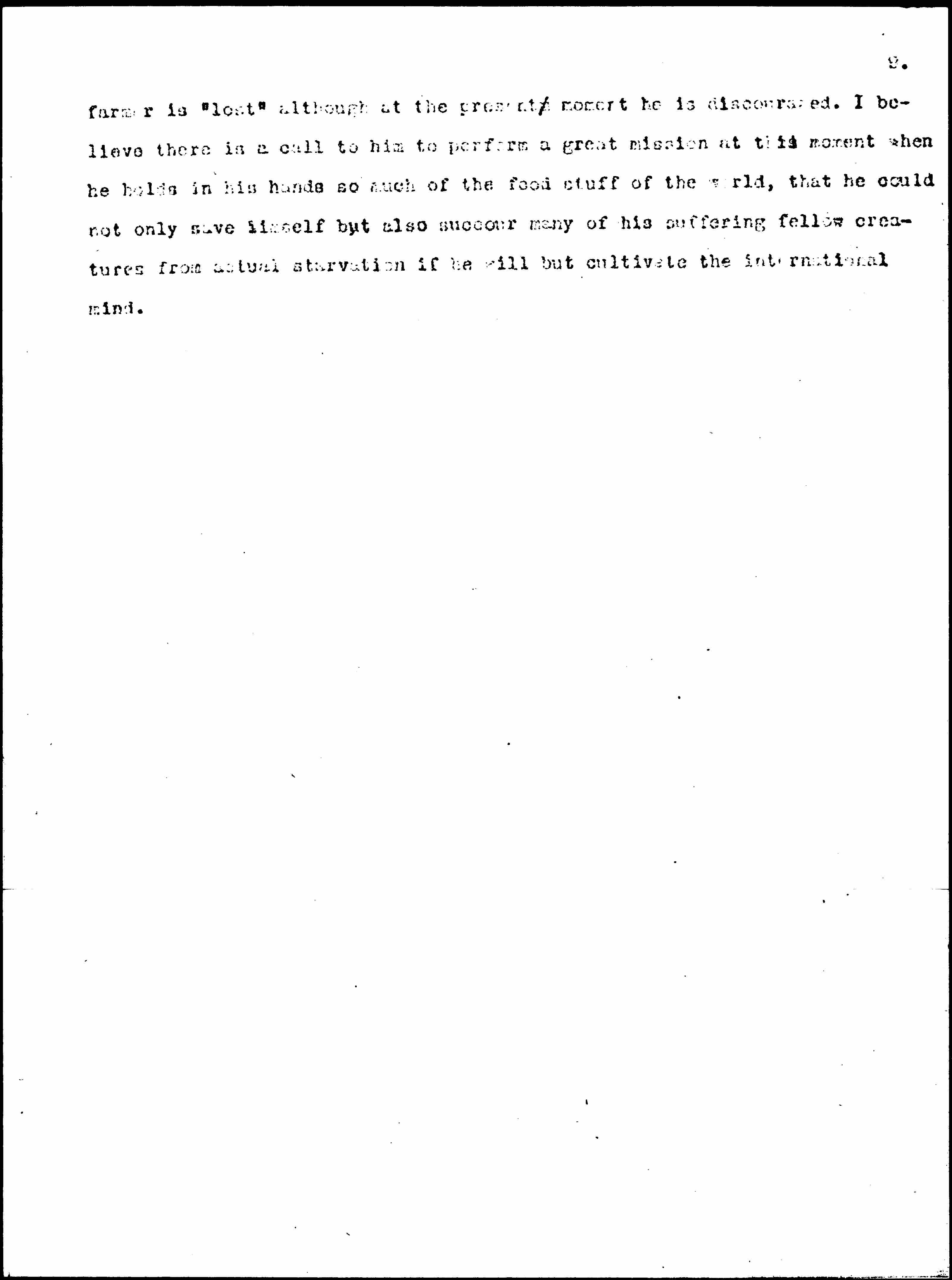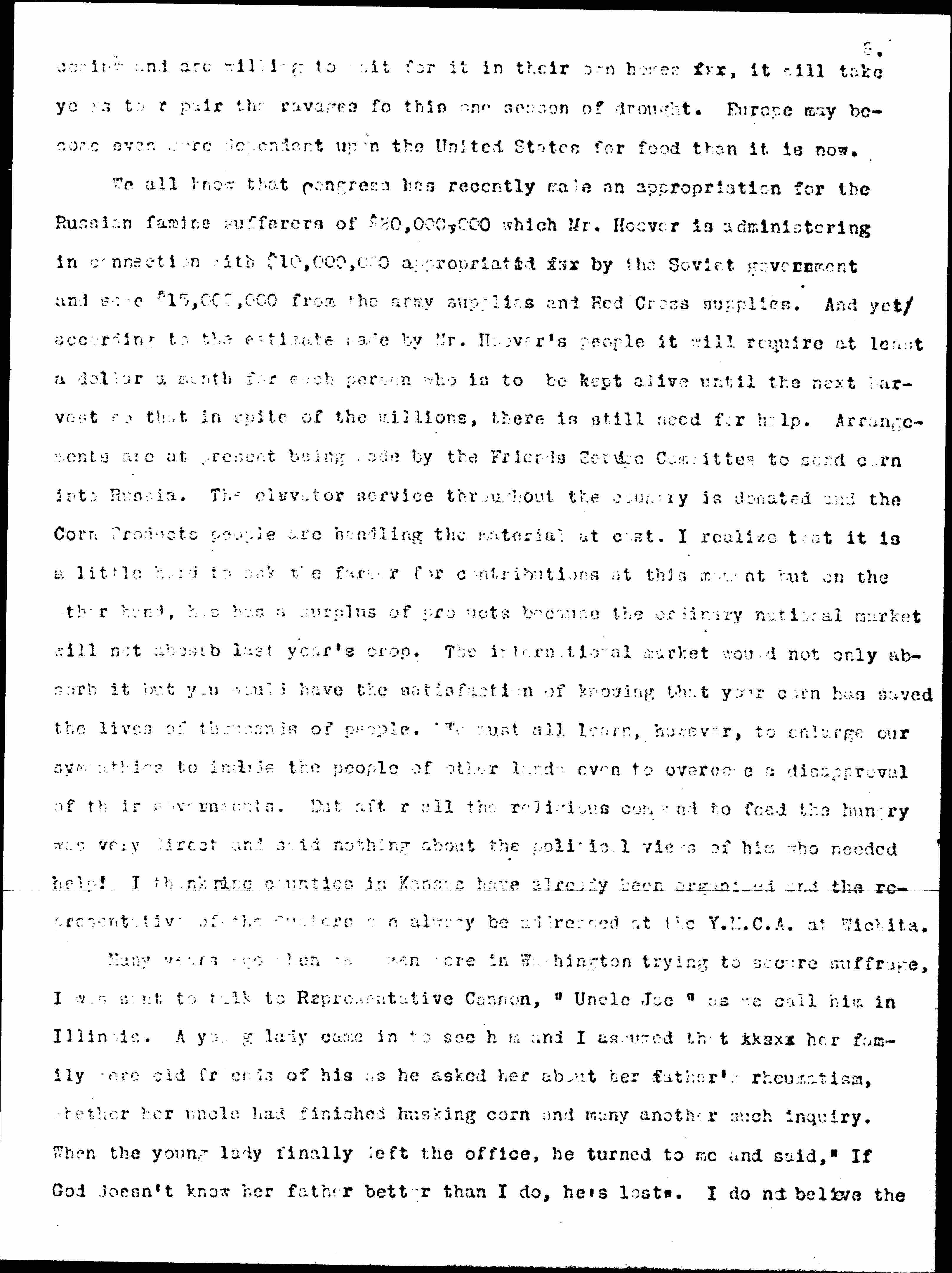 Many years ago when we women were in Washington trying to secure suffrage, I was sent to talk to Representative Cannon, "Uncle Joe," as we call him in Illinois. A young lady came in to see him and I assumed that they her family were old friends of his as he asked her about her father's rheumatism, whether her uncle had finished husking corn and many another such inquiry. When the young lady finally left the office, he turned to me and said, "If God doesn't know her father better than I do, he's lost." I do not believe the [page 9] farmer is "lost" although at the present moment he is discouraged. I believe there is a call to him to perform a great mission at this moment when he holds in his hands so much of the [foodstuffs] of the world, that he could not only save himself but also [succor] many of his suffering fellow creatures from actual starvation if he will but cultivate the international mind.