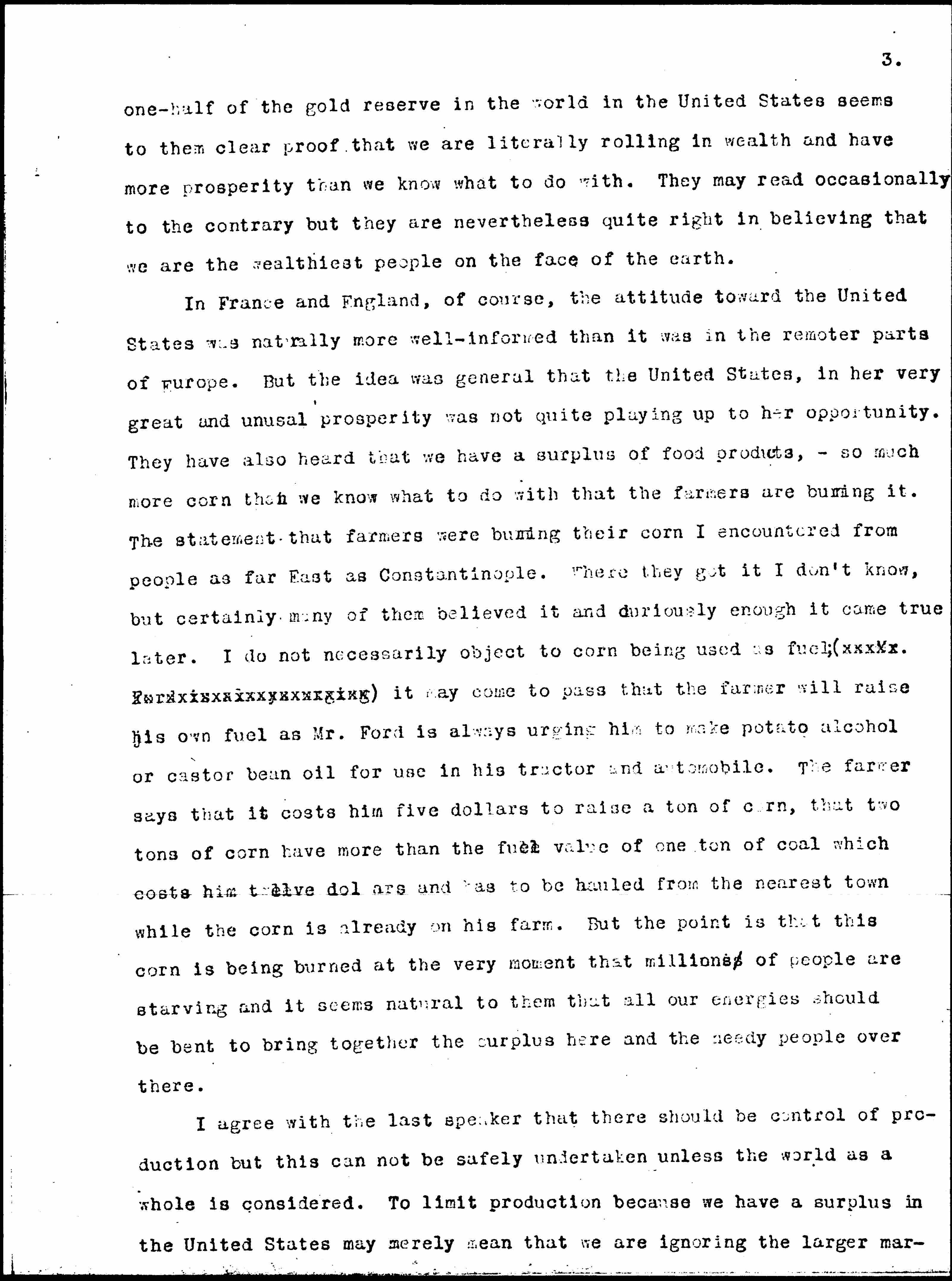 In France and England, of course, the attitude toward the United States was naturally more well-informed than it was in the remoter parts of Europe. But the idea was general that the United States, in her very great and unusual prosperity was not quite playing up to her opportunity. They have also heard that we have a surplus of food products, -- so much more corn than we know what to do with that the farmers are burning it. The statement that farmers were burning their corn I encountered from people as far East as Constantinople. Where they got it I don't know, but certainly many of them believed it and curiously enough it came true later. I do not necessarily object to corn being used as fuel; (as Mr. Ford is always urging) it may come to pass that the farmer will raise his own fuel as Mr. Ford is always urging him to make, potato alcohol or castor bean oil for use in his tractor and automobile. The farmer says that it cost him five dollars to raise a ton of corn, that two tons of corn have more than the fuel value of one ton of coal which costs him twelve dollars and has to be hauled from the nearest town while the corn is already on his farm. But the point is that this corn is being burned at the very moment that millions of people are starving, and it seems natural to them that all our energies should be bent to bring together the surplus here and the needy people over there.