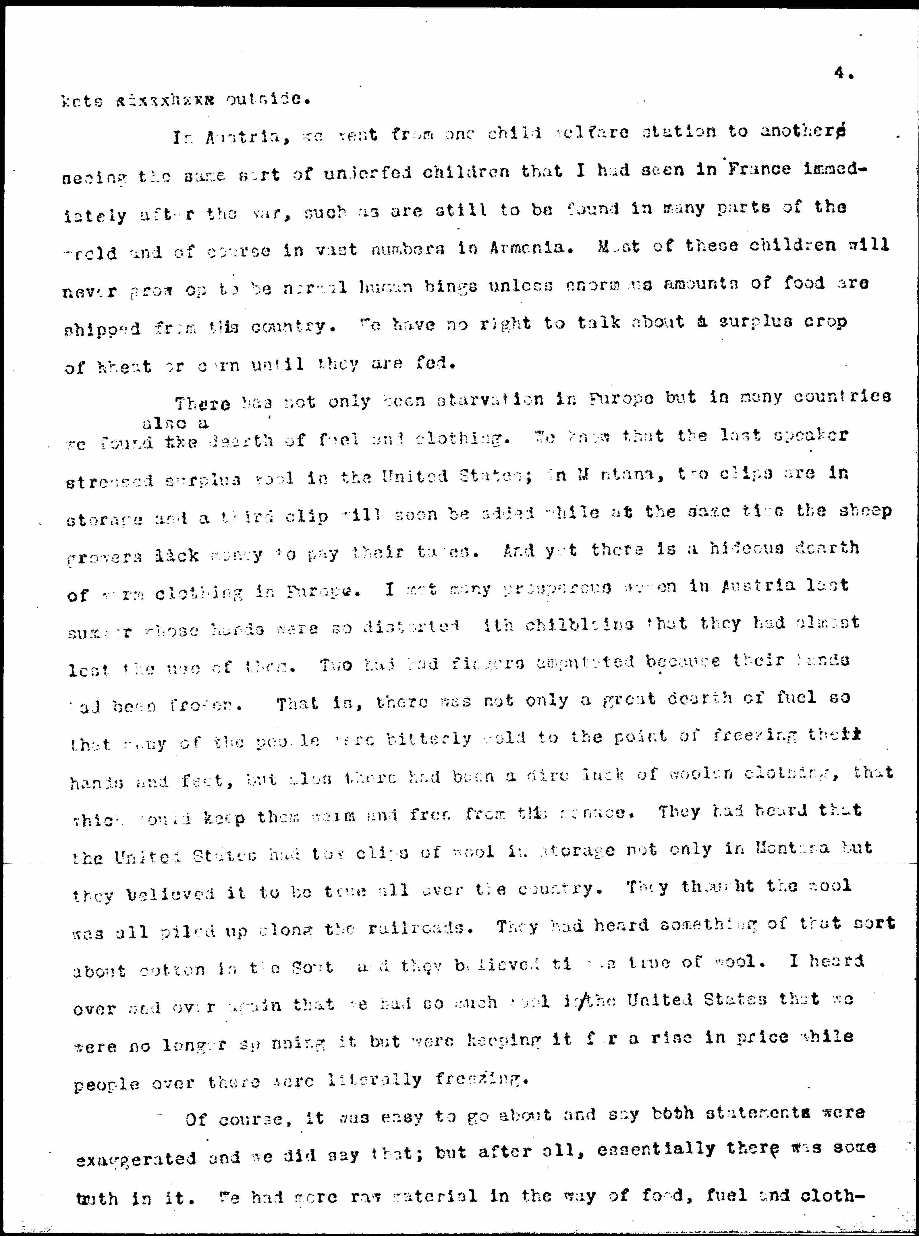 There has not only been starvation in Europe but in many countries we found ↑also a↓ the dearth of fuel and clothing. We know that the last speaker stressed surplus wool in the United States; in Montana, two clips are in storage and a third clip will soon be added while at the same time the sheep growers lack money to pay their taxes. And yet there is a hideous dearth of warm clothing in Europe. I met many prosperous women in Austria last summer whose hands were so distorted with chilblains that they had almost lost the use of them. Two had had fingers amputated because their hands had been frozen. That is, there was not only a great dearth of fuel so that many of the people were bitterly cold to the point of freezing their hands and feet, but also there had been a dire lack of woolen clothing, that which would keep them warm and free from this menace. They had heard that the United States had [two] clips of wool in storage not only in Montana but they believed it to be true all over the country. They thought the wool was all piled up along the railroads. They had heard something of that sort about cotton in the South and they believed it was true of wool. I heard over and over again that we had so much wool in the United States that we were no longer spinning it but were keeping it for a rise in price while people over there were literally freezing.