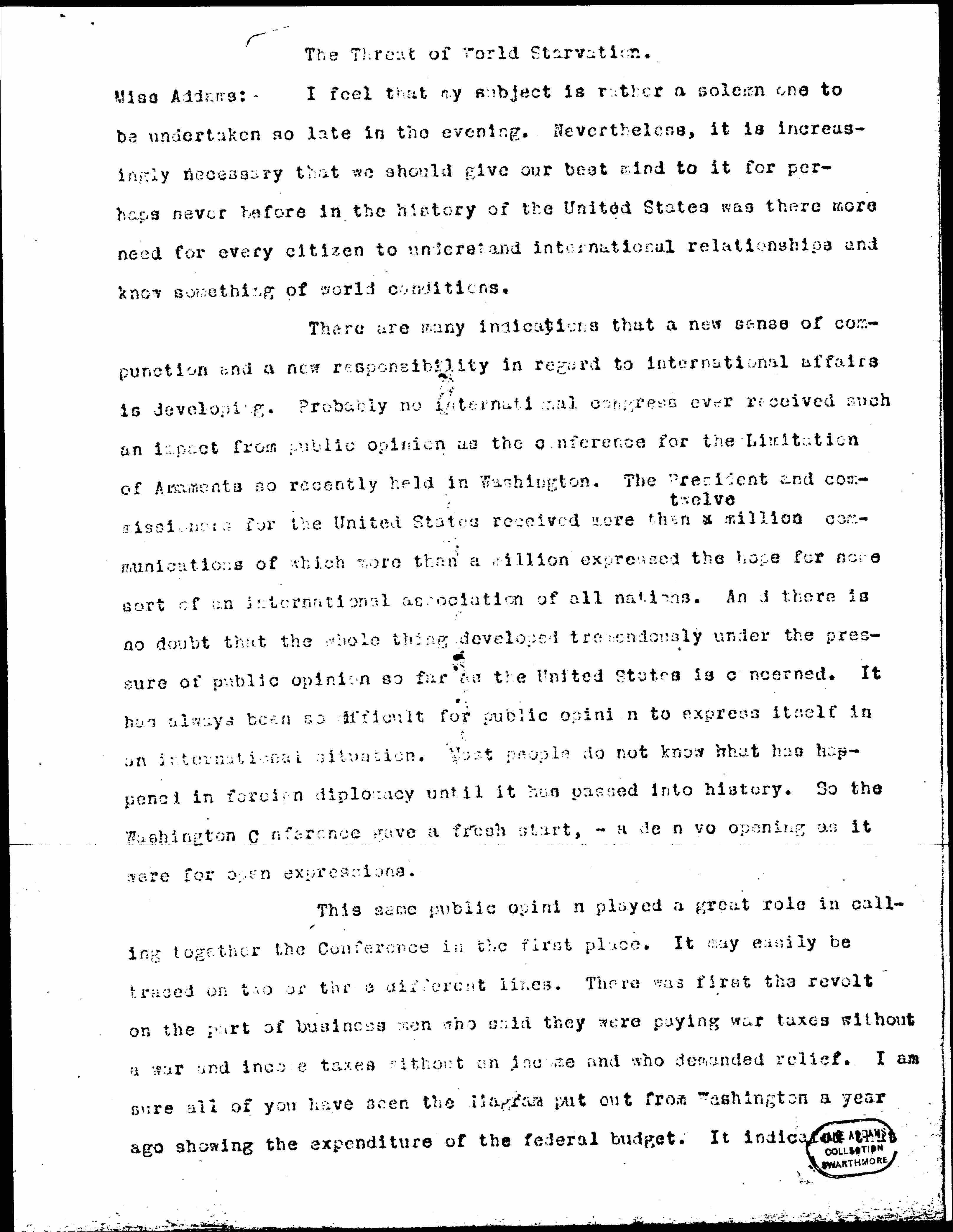 There are many indications that a new sense of compunction and a new responsibility in regard to international affairs is developing. Probably no international congress ever received such an impact from public opinion as the conference for the Limitation of Armaments so recently held in Washington. The President and commissioners for the United States received more than a ↑twelve↓ million communications, of which more than a million expressed the hope for some sort of an international association of all nations. And there is no doubt that the whole thing developed tremendously under the pressure of public opinion so far as the United States is concerned. It has always been so difficult for public opinion to express itself in an international situation. Most people do not know what has happened in foreign diplomacy until it has passed into history. So the Washington conference gave a fresh start, -- a de novo opening as it were for open expressions.
