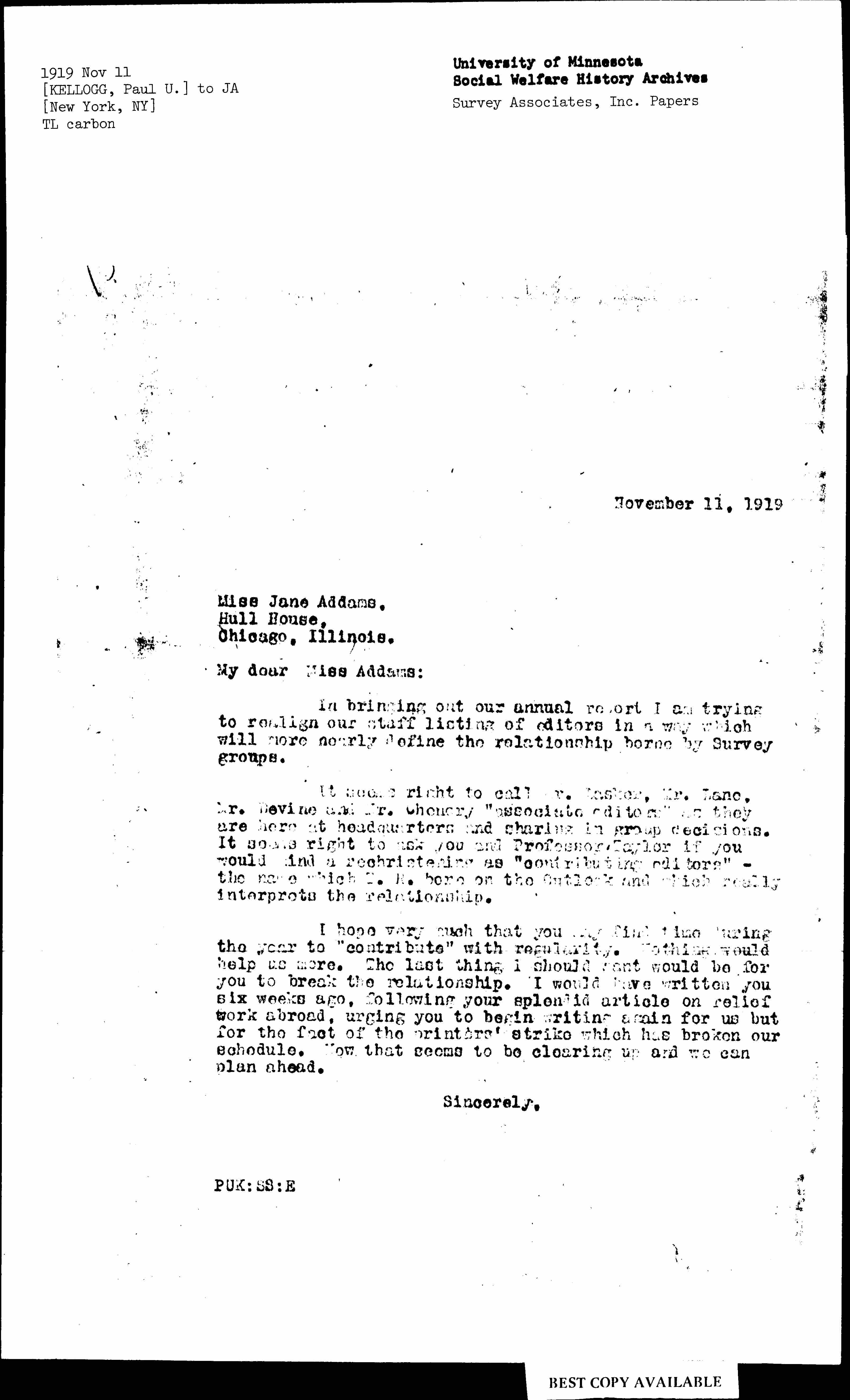 I hope very much that you [may] find time during the year to "contribute" with regularity. Nothing would help us more. The last thing I should want would be for you to break the relationship. I would have written you six weeks ago, following your splendid article on relief work abroad, urging you to begin writing again for us but for the fact of the printers' strike which has broken our schedule. Now that seems to be clearing up and we can plan ahead.