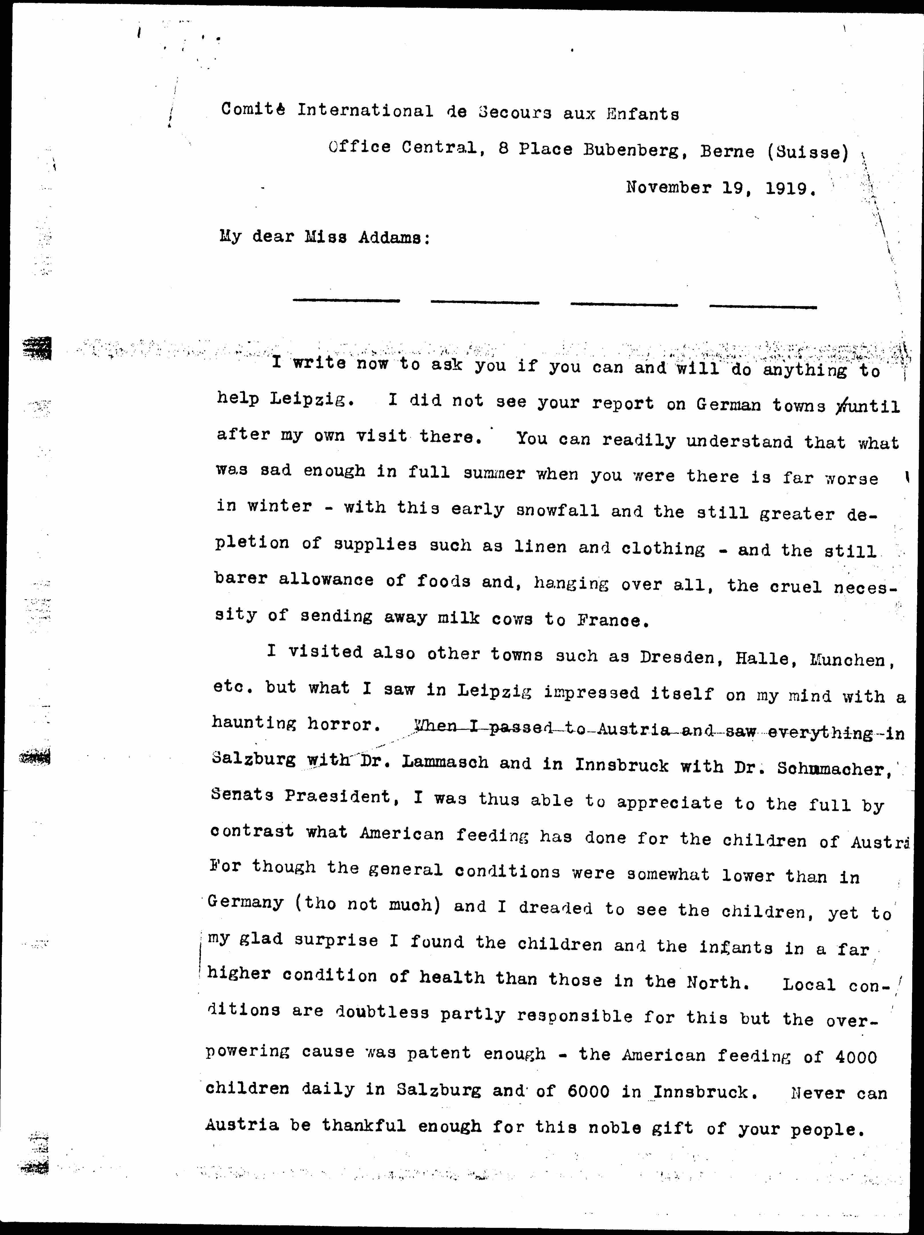 I visited also other towns such as Dresden, Halle, Munchen, etc. but what I saw in Leipzig impressed itself on my mind with a haunting horror. When I passed to Austria and saw everything in Salzburg with Dr. Lammasch and in Innsbruck with Dr. Schumacher, [Senats Präsident], I was thus able to appreciate to the full by contrast what American feeding has done for the children of Austria. For though the general conditions were somewhat lower than in Germany ([though] not much) and I dreaded to see the children, yet to my glad surprise I found the children and the infants in a far higher condition of health than those in the North. Local conditions are doubtless partly responsible for this but the overpowering cause was patent enough -- the American feeding of 4000 children daily in Salzburg and of 6000 in Innsbruck. Never can Austria be thankful enough for this noble gift of your people. [page 2] Its management too is excellent and the food not only first class but as planned on Prof. Priquet's N.E.M. System quite wonderful in its results. It was lovely to see the children enjoying it. In fact their one anxiety is not to eat too much and to put on a weight which shall disqualify them to continue the benefit. Each child pays 20 heller a day.