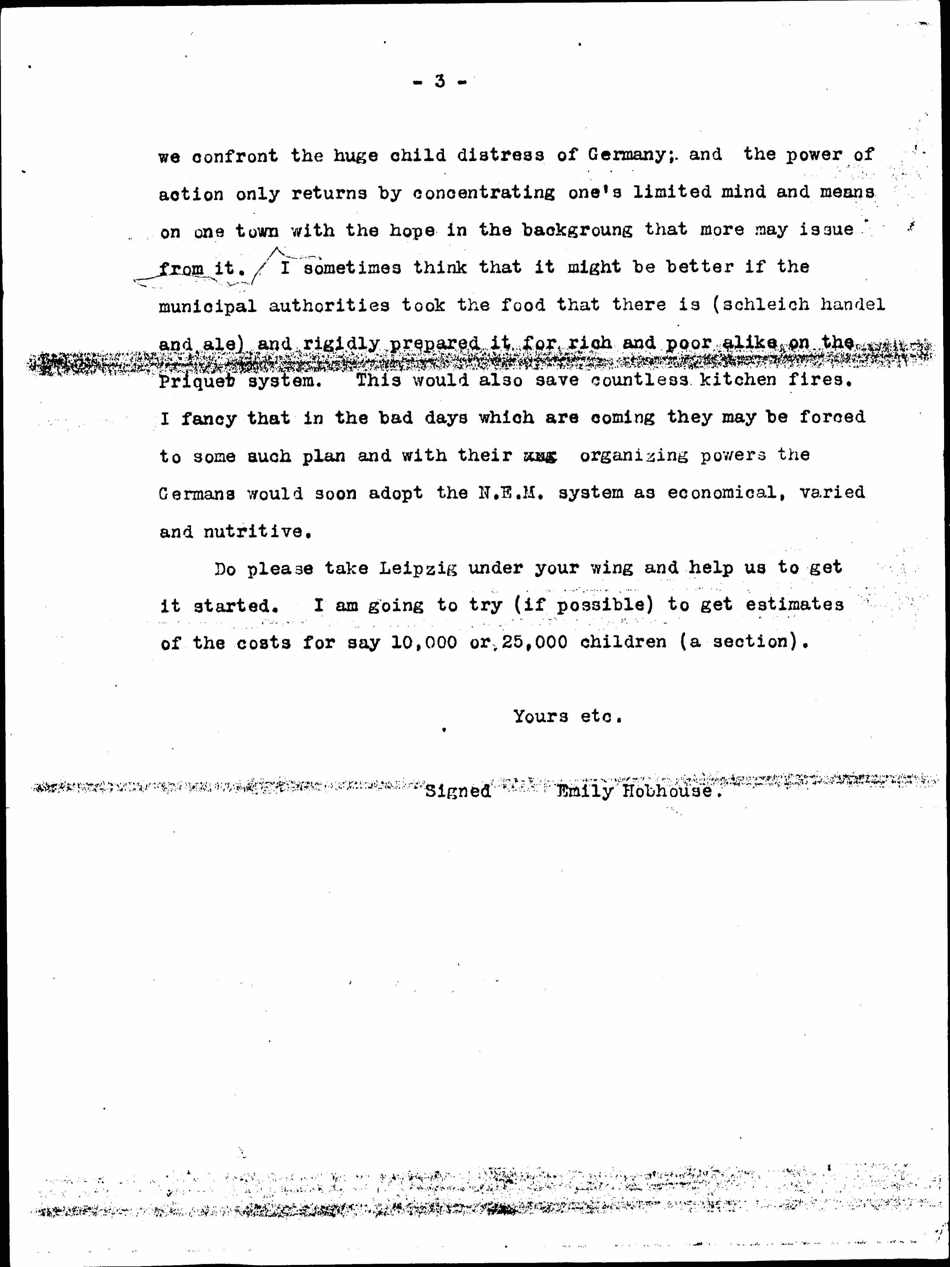 We are all so afflicted by a feeling of paralyzed effort when [page 3] we confront the huge child distress of Germany; and the power of action only returns by concentrating one's limited mind and means on one town with the hope in the background that more may issue from it. I sometimes think that it might be better if the municipal authorities took the food that there is (schleich handel and ale) and rigidly prepared it for rich and poor alike on the Priquet system. This would also save countless kitchen fires. I fancy that in the bad days which are coming they may be forced to some such plan and with their aog organizing powers the Germans would soon adopt the N.E.M. system as economical, varied and nutritive.