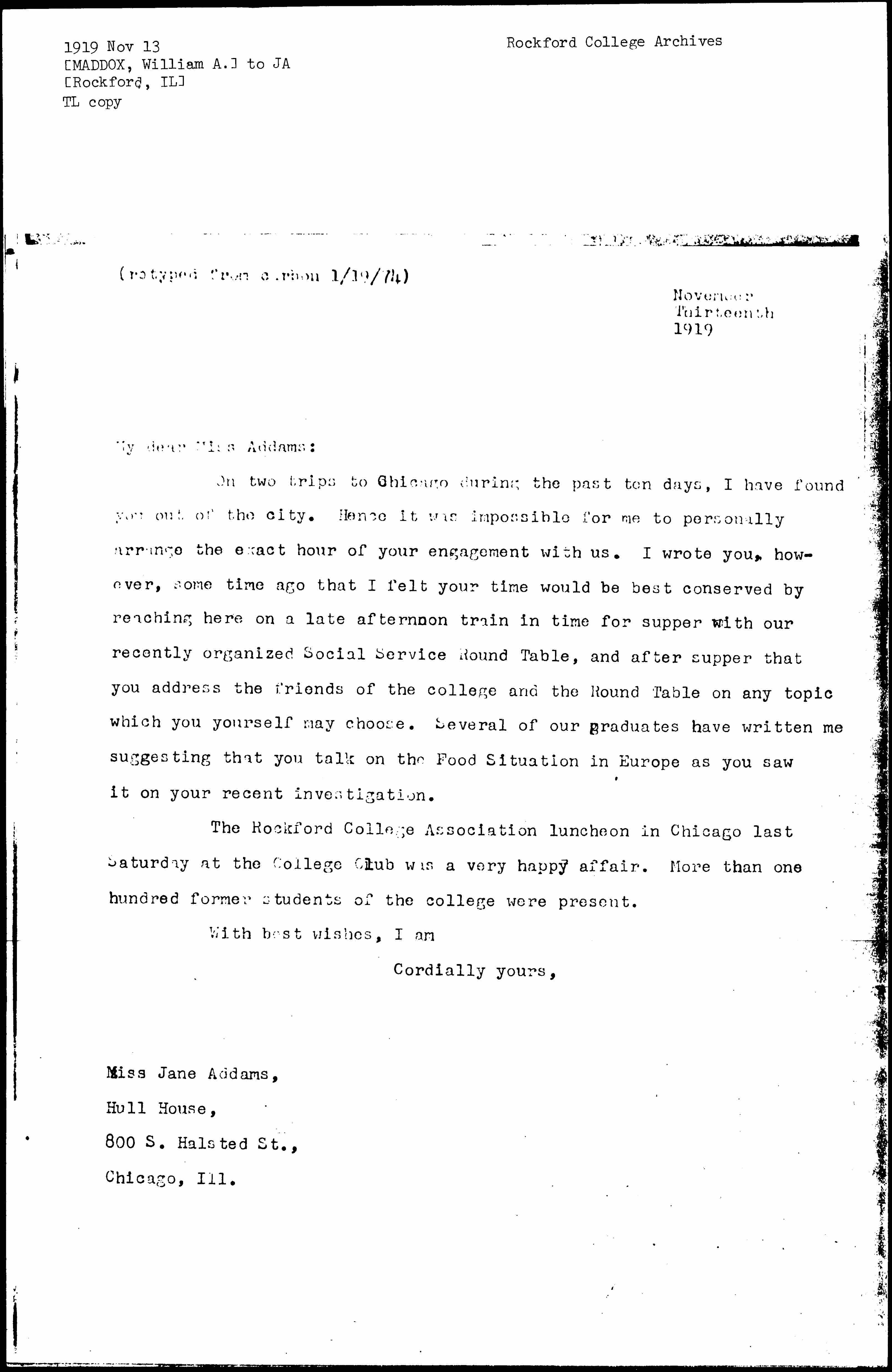 On two trips to Chicago during the past ten days, I have found you out of the city. Hence it was impossible for me to personally arrange the exact hour of your engagement with us. I wrote you, however, some time ago that I felt your time would be best conserved by reaching here on a late afternoon train in time for supper with our recently organized Social Service Round Table, and after supper that you address the friends of the college and the Round Table on any topic which you yourself may choose. Several of our graduates have written me suggesting that you talk on the Food Situation in Europe as you saw it on your recent investigation.