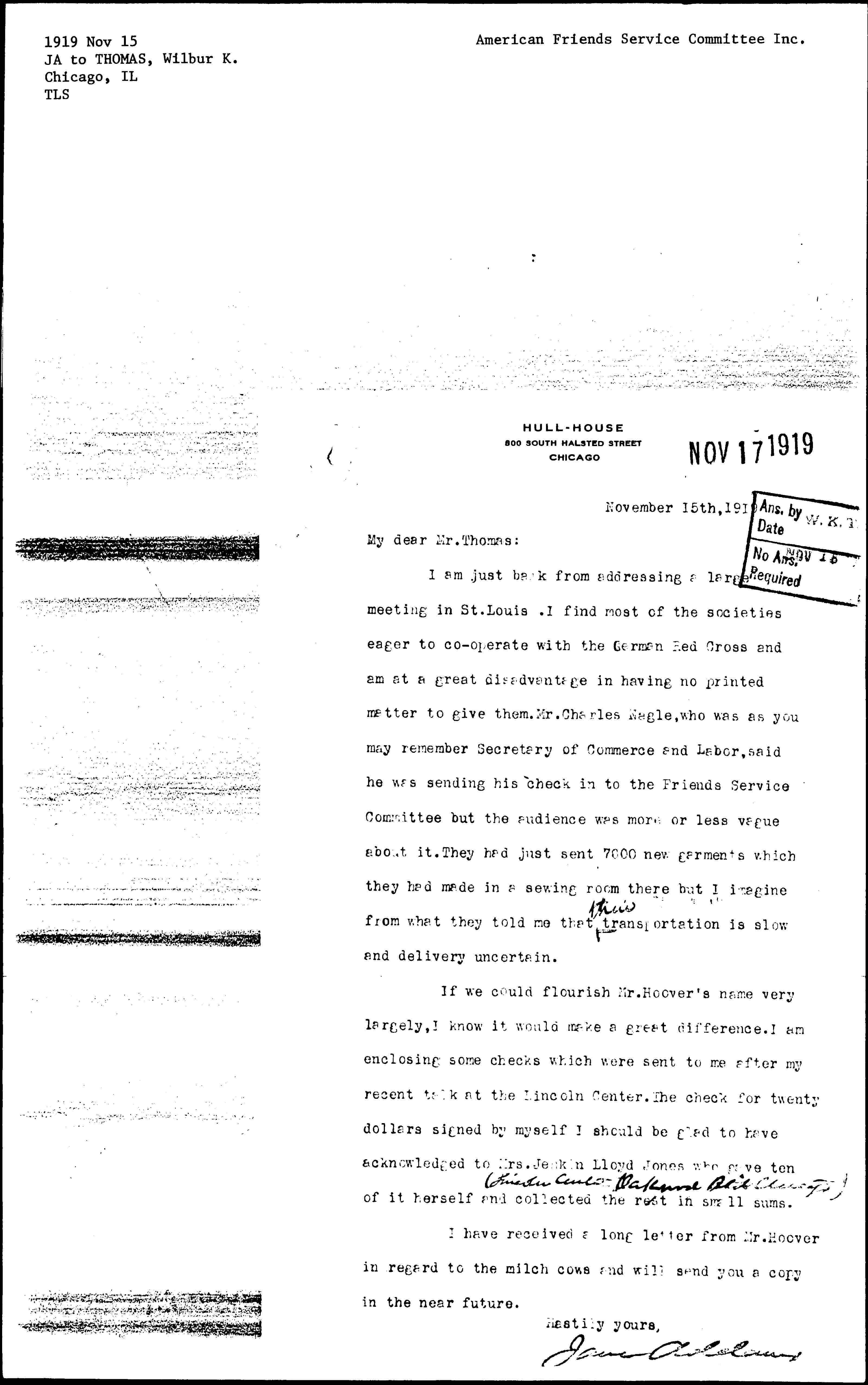 I am just back from addressing a large meeting in St. Louis. I find most of the societies eager to [cooperate] with the German Red Cross and am at a great disadvantage in having no printed matter to give them. Mr. Charles [Nagel], who was as you may remember Secretary of Commerce and Labor, said he was sending his check in to the Friends Service Committee but the audience was more or less vague about it. They had just sent 7000 new garments which they had made in a sewing room there but I imagine from what they told me that ↑their↓ transportation is slow and delivery uncertain.