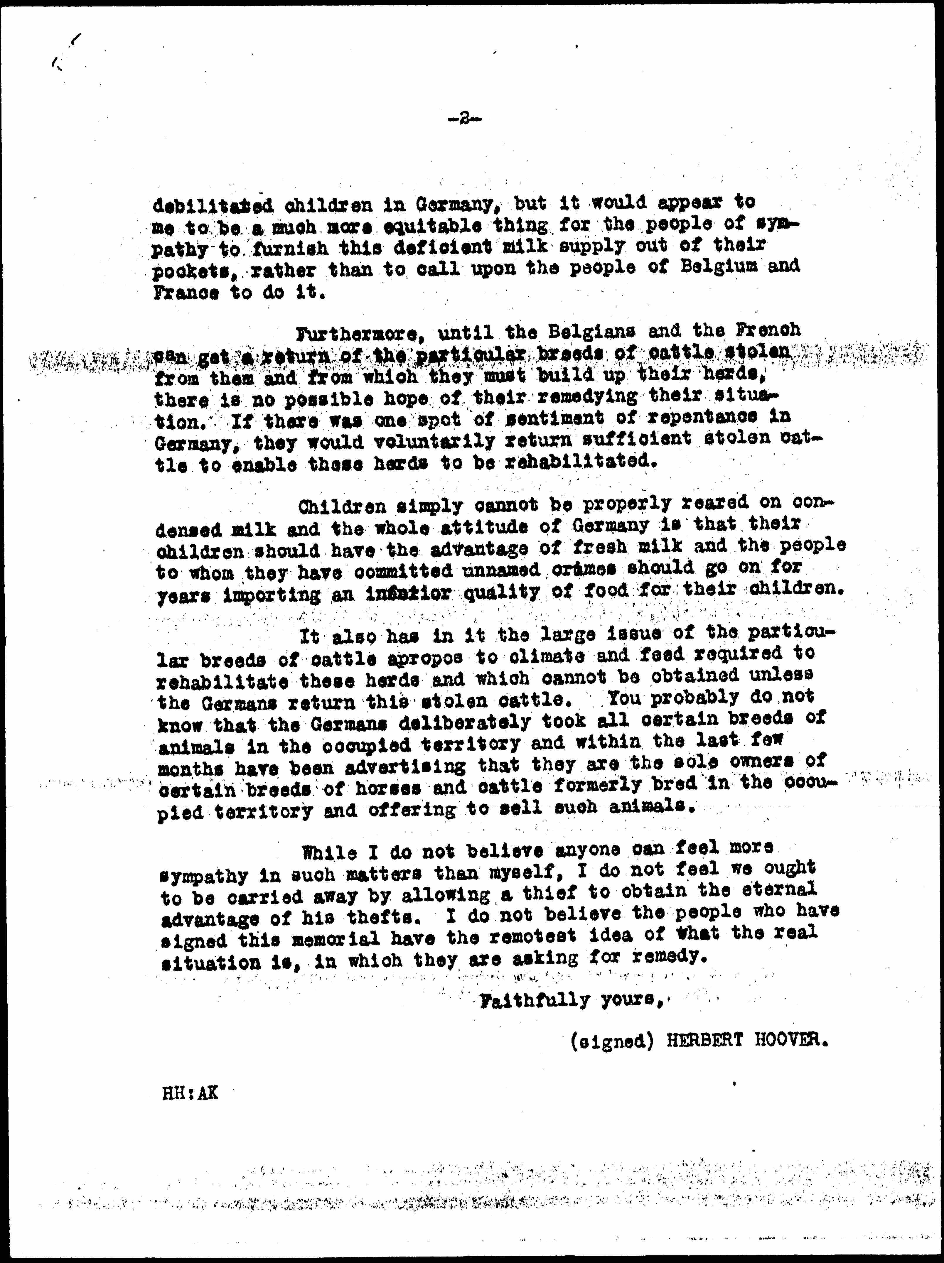 At the present moment Belgium and Northern France are saving the lives of their children by feeding them on condensed milk, imported at enormous expense from the United States. I see no reason why the Germans should not be called upon to substitute condensed milk for their children and to give a certain number of cattle that will afford the terribly needed fresh milk for children of Belgium and Northern France. In fact, I am prepared to even assist in securing condensed milk supplies for under-nourished, [page 2] debilitated children in Germany, but it would appear to me to be a much more equitable thing for the people of sympathy to furnish this deficient milk supply out of their pockets, rather than to call upon the people of Belgium and France to do it.