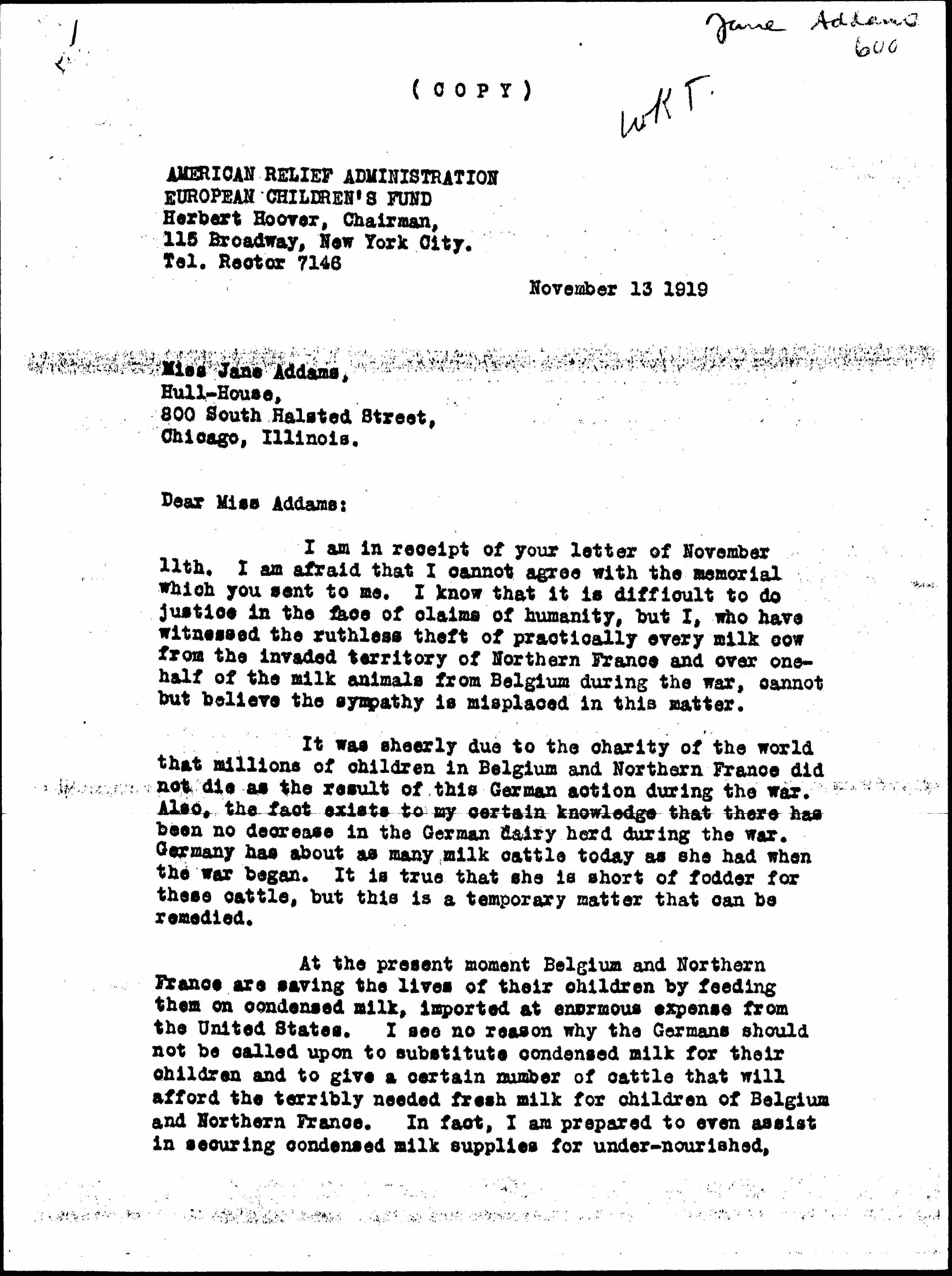 I am in receipt of your letter of November 11th. I am afraid that I cannot agree with the memorial which you sent me. I know that it is difficult to do justice in the face of claims of humanity, but I, who have witnessed the ruthless theft of practically every milk cow from the invaded territory of Northern France and over one-half of the milk animals from Belgium during the war, cannot but believe the sympathy is misplaced in this matter.