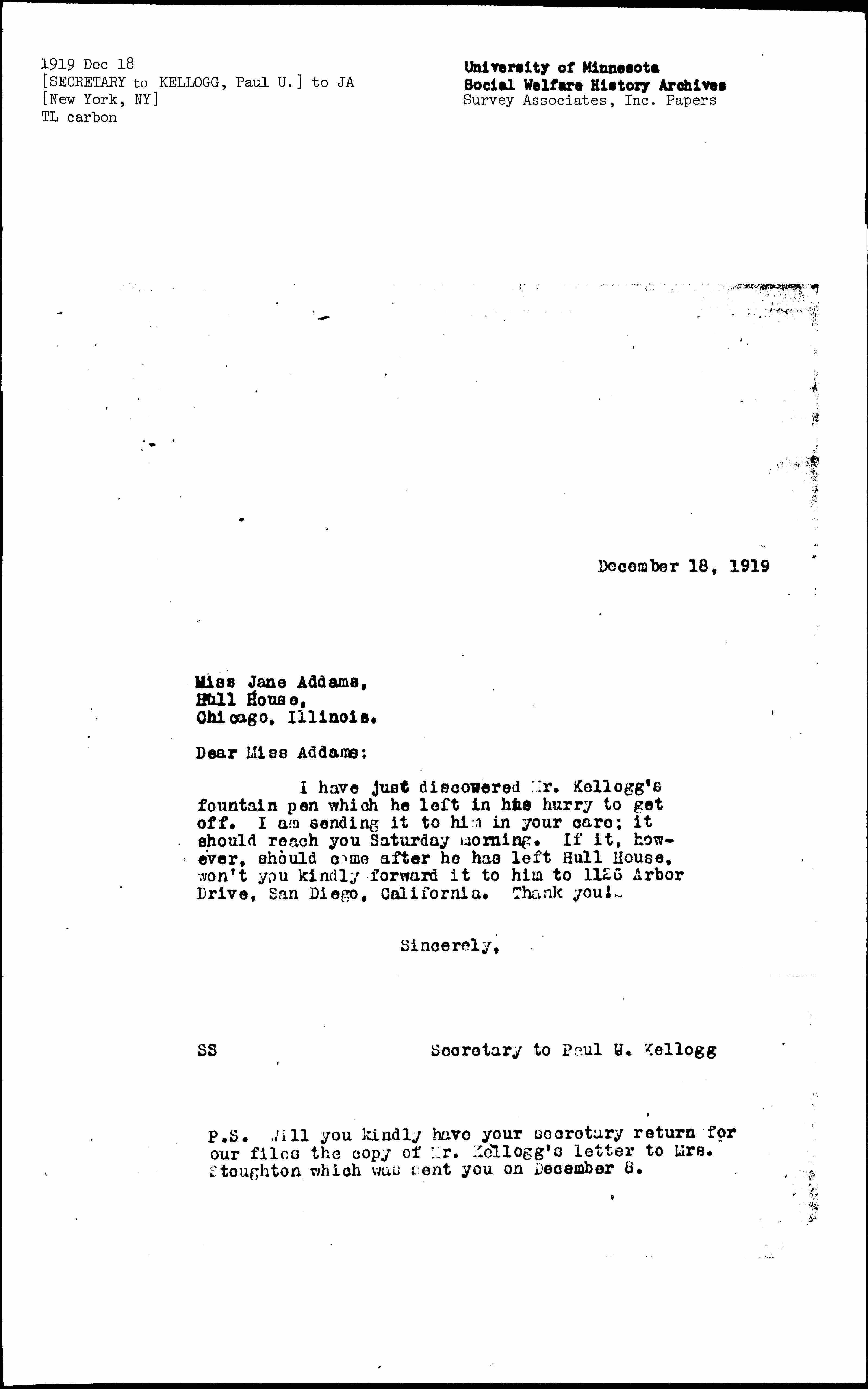 I have just discovered Mr. Kellogg's fountain pen which he left in his hurry to get off. I am sending it to him in your care; it should reach you Saturday morning. If it, however, should come after he has left Hull House, won't you kindly forward it to him to 1126 Arbor Drive, San Diego, California. Thank you!