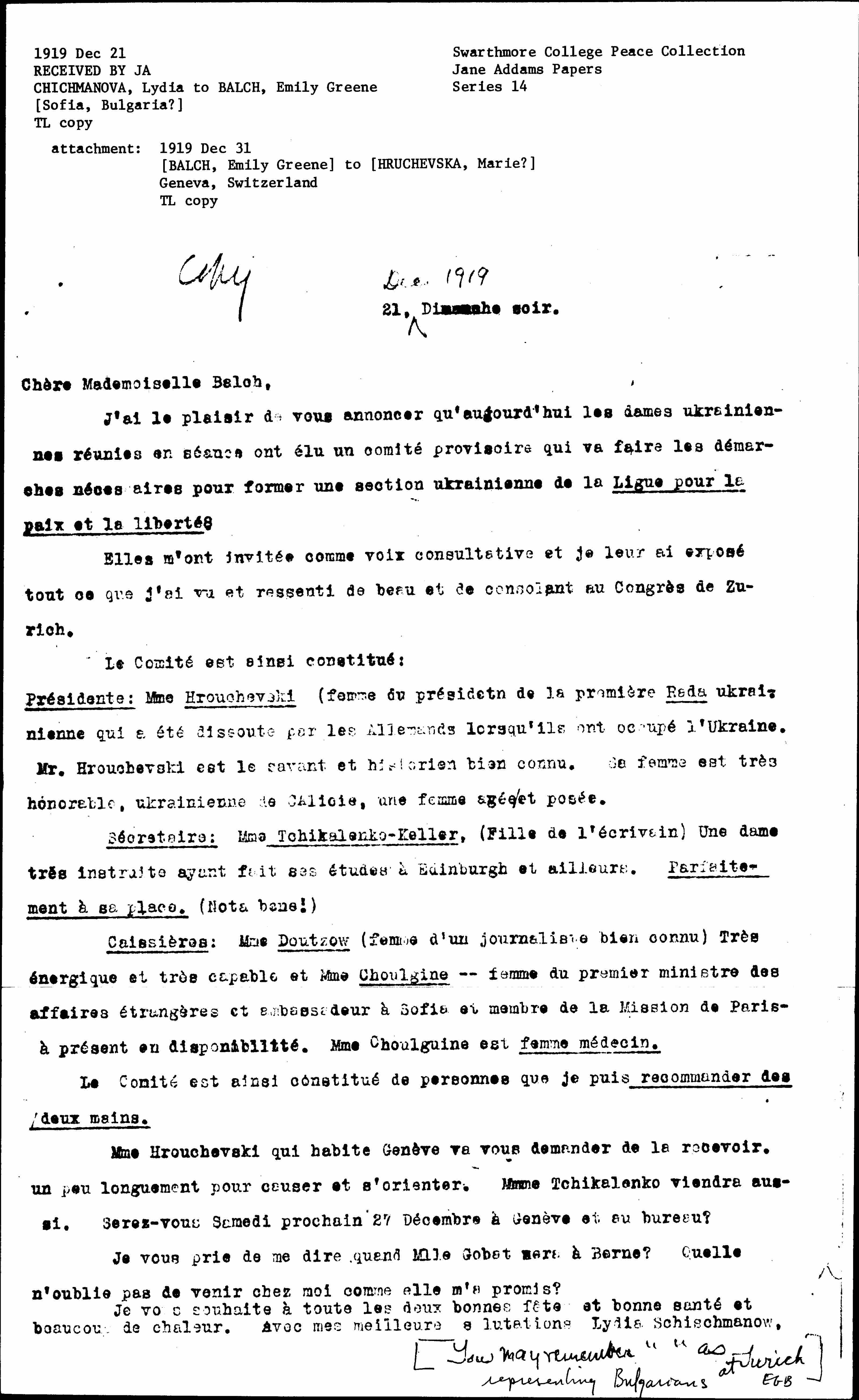 Mrs. Hrouchevski, who lives in Geneva, will ask you to receive her for a little while to chat and orient herself. Ms. Tchikalenko will also come. Will you be next Saturday December 27 in Geneva and at the office?