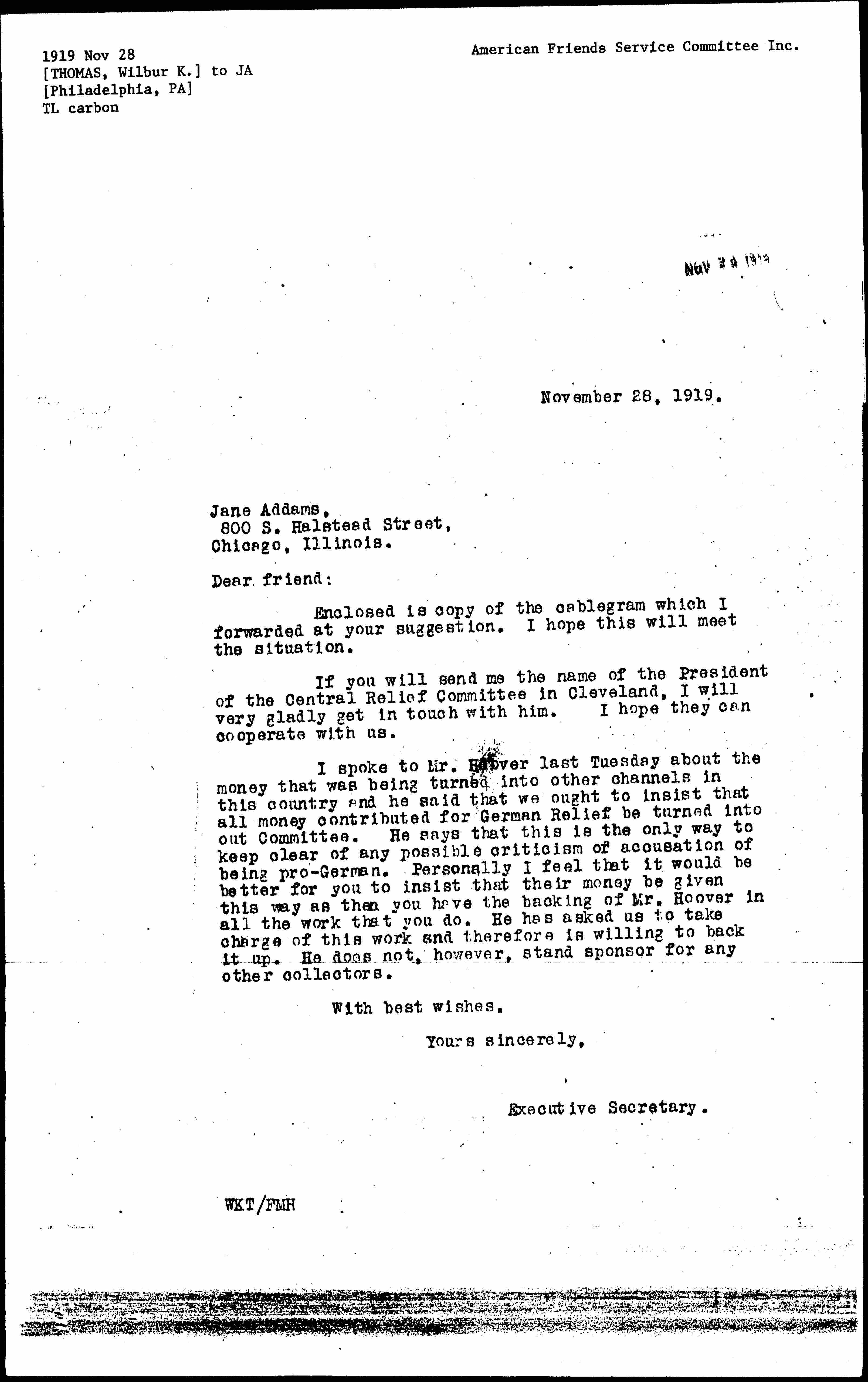 I spoke to Mr. Hoover last Tuesday about the money that was being turned into other channels in this country and he said that we ought to insist that all money contributed for German Relief be turned into out Committee. He says that is the only way to keep clear of any possible criticism of accusation of being pro-German. Personally I feel that it would be better for you to insist that their money be given this way as then you have the backing of Mr. Hoover in all the work that you do. He has asked us to take charge of this work and therefore is willing to back it up. He does not, however, stand sponsor for any other collectors.