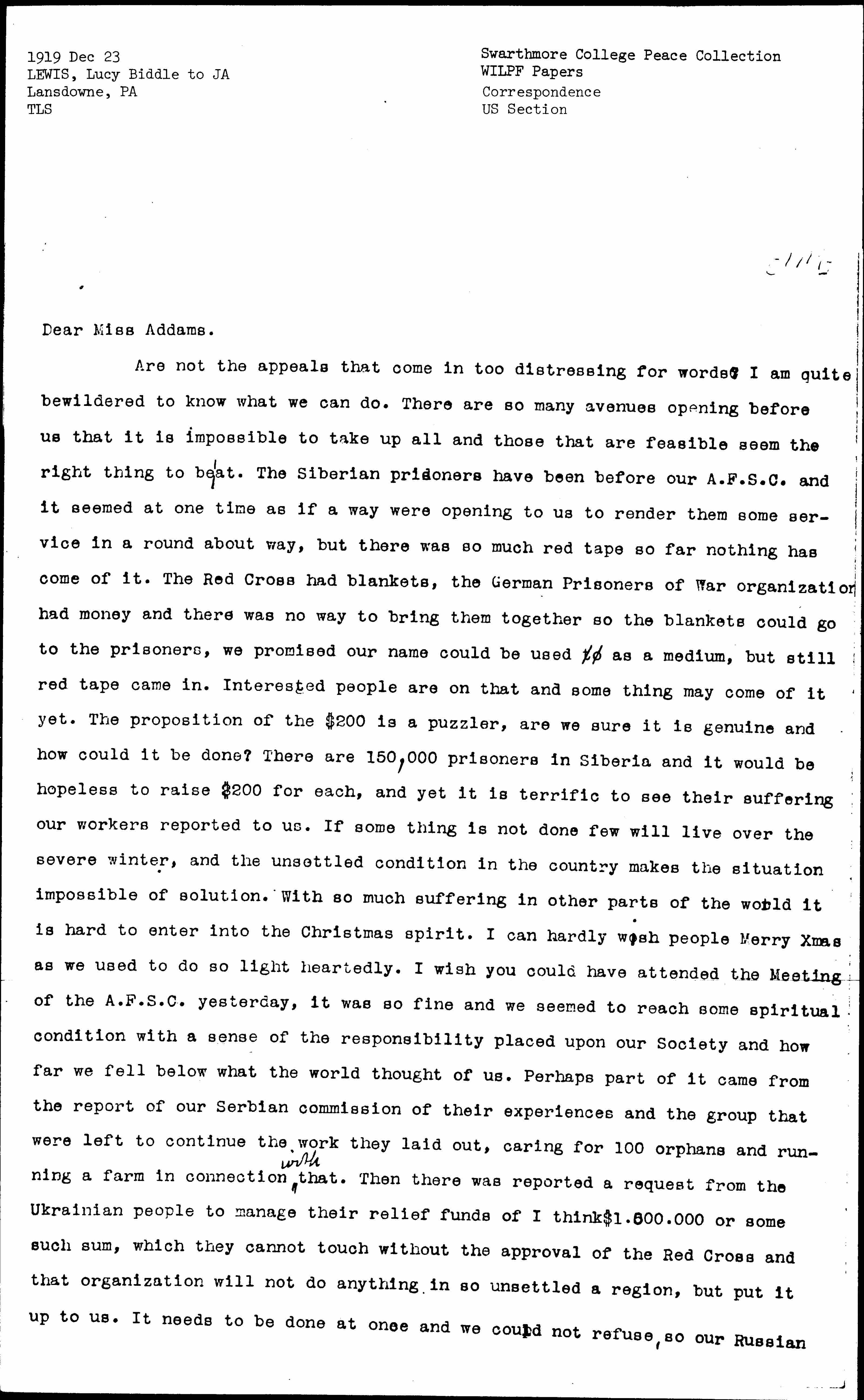 Are not the appeals that come in too distressing for words? I am quite bewildered to know what we can do. There are so many avenues opening before us that it is impossible to take up all and those that are feasible seem the right thing to be at. The Siberian prisoners have been before our A.F.S.C. and it seemed at one time as if a way were opening to us to render them some service in a round about way, but there was so much red tape so far nothing has come of it. The Red Cross had blankets, the German Prisoners of War organization had money and there was no way to bring them together so the blankets could go to the prisoners, we promised our name could be used to as a medium, but still red tape came in. Interested people are on that and some thing may come of it yet. The proposition of the $200 is a puzzler, are we sure it is genuine and how could it be done? There are 150,000 prisoners in Siberia and it would be hopeless to raise $200 for each, and yet it is terrific to see their suffering our workers reported to us. If something is not done few will live over the severe winter, and the unsettled condition in the country makes the situation impossible of solution. With so much suffering in other parts of the world it is hard to enter into the Christmas spirit. I can hardly wish people Merry Xmas as we used to do so light heartedly. I wish you could have attended the Meeting of the A.F.S.C. yesterday, it was so fine and we seemed to reach some spiritual condition with a sense of the responsibility placed upon our Society and how far we fell below what the world thought of us. Perhaps part of it came from the report of our Serbian commission of their experiences and the group that were left to continue the work they laid out, caring for 100 orphans and running a farm in connection ↑with↓ that. Then there was reported a request from the Ukrainian people to manage their relief funds of I think $1.800.000 or some such sum, which they cannot touch without the approval of the Red Cross and that organization will not do anything in so unsettled a region, but put it up to us. It needs to be done at once and we could not refuse, so our Russian [page 2] Committee was directed to take it up at once, which means finding suitable personnel to head up the distribution and probably find some Mennonites to help. That is my sub-com. so it means a lot more work at once for some of us. Some of the English Friends are over trying to work out a plan for better coordination of our work on the other side and perhaps on this side too as we are planning to start in Mexico in a small way to see if there is not something we can do in friendship to help inspire confidence and perhaps exert an influence. It is absolutely appalling. I have done little in regard to our W.I.L. Fight the Famine so far but hope after the Holidays when our letter goes out and we get started with a real membership we are sure of something may be accomplished, yet I know every day counts and means lives lost of saved.