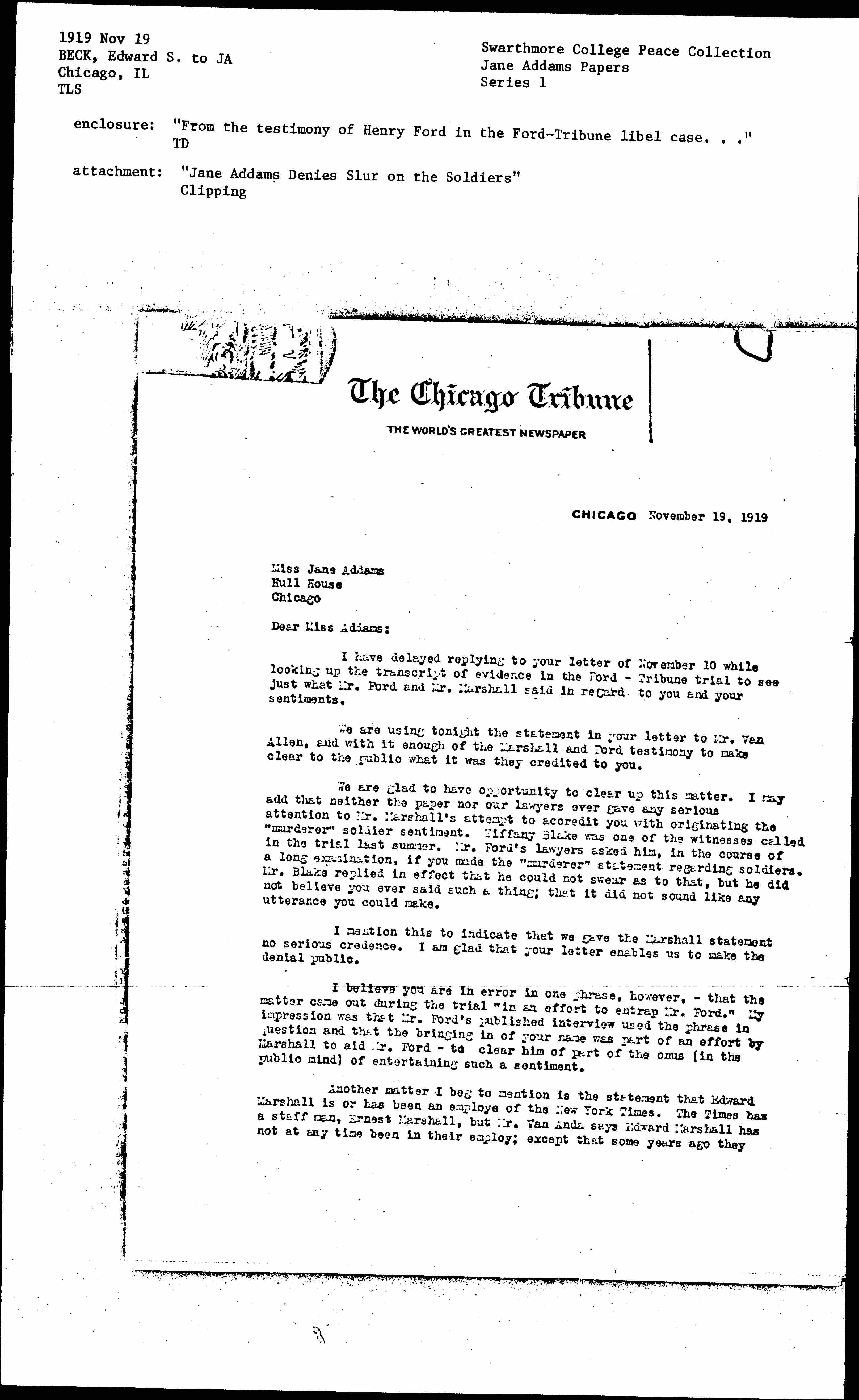 I have delayed replying to your letter of November 10 while looking up the transcript of evidence in the Ford-Tribune trial to see just what Mr. Ford and Mr. Marshall said in regard to you and your sentiments.
