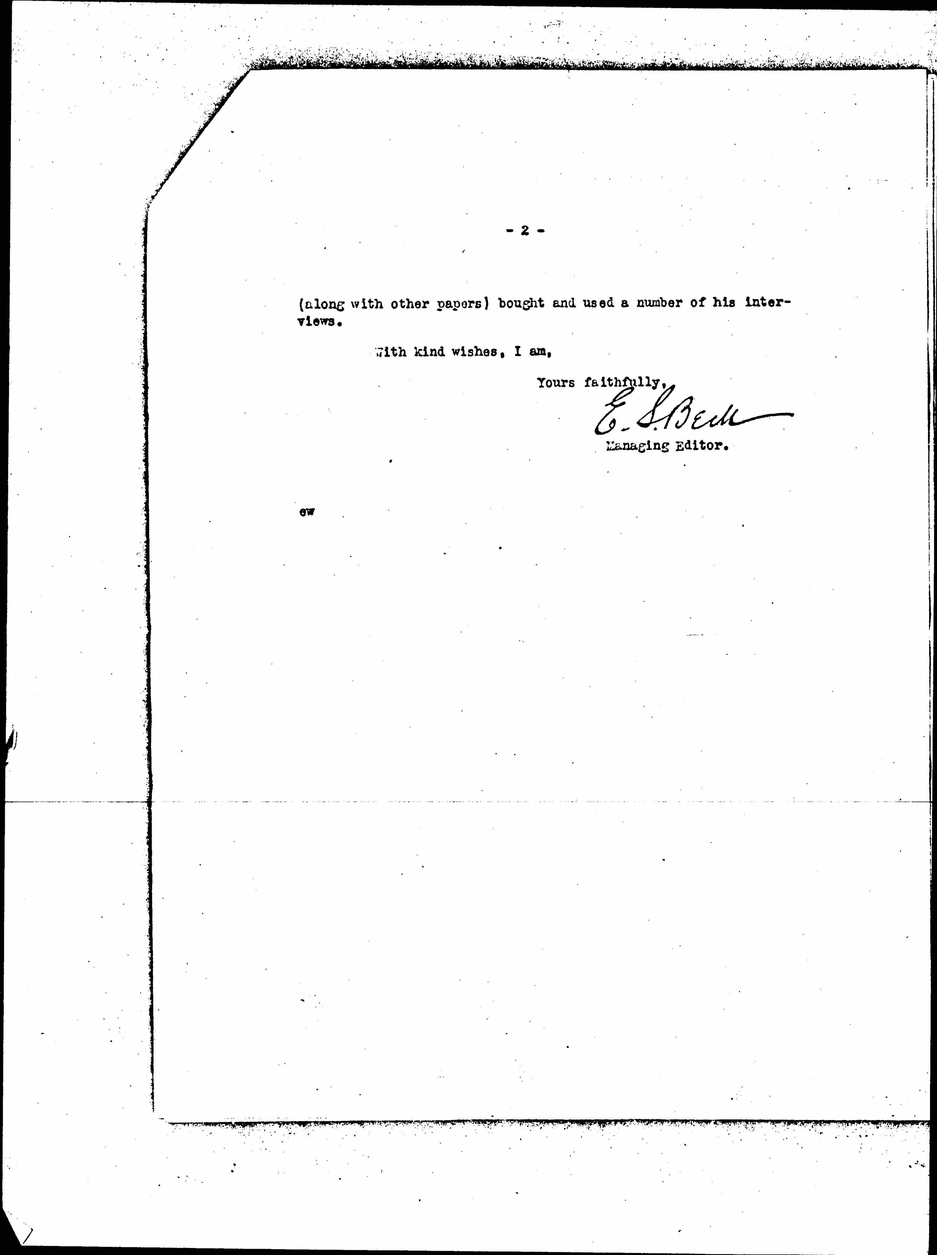 Another matter I beg to mention is the statement that Edward Marshall is or has been an employee of the New York Times. The Times has a staff man, Ernest Marshall, but Mr. Van Anda says Edward Marshall has not at any time been in their employ; except that some years ago they [page 2] (along with other papers) bought and used a number of his interviews.