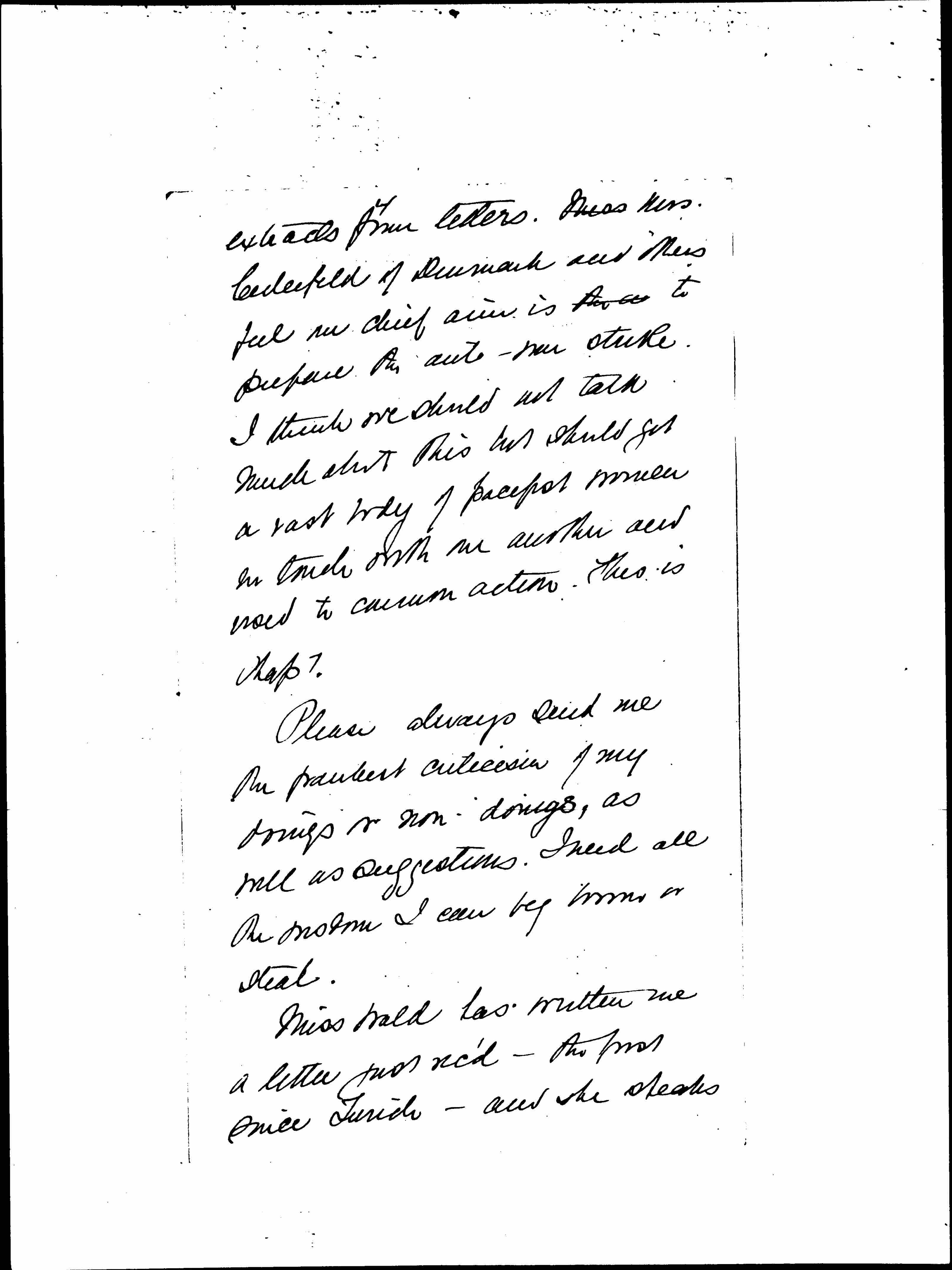 I am immensely struck by the recurrence of the same note over & over in the letters that reach me [from the] all the corners of the earth. If you have time to read the last news sheet you will feel it and not only in the columns of [page 4] extracts from letters. Miss Mrs. Cederfeld of Denmark and others feel our chief aim is [illegible] to preface the anti-war strike. I think we should not talk much about this but should get a vast body of pacifist women in touch with one another and used to common action. This is Chap. 7.