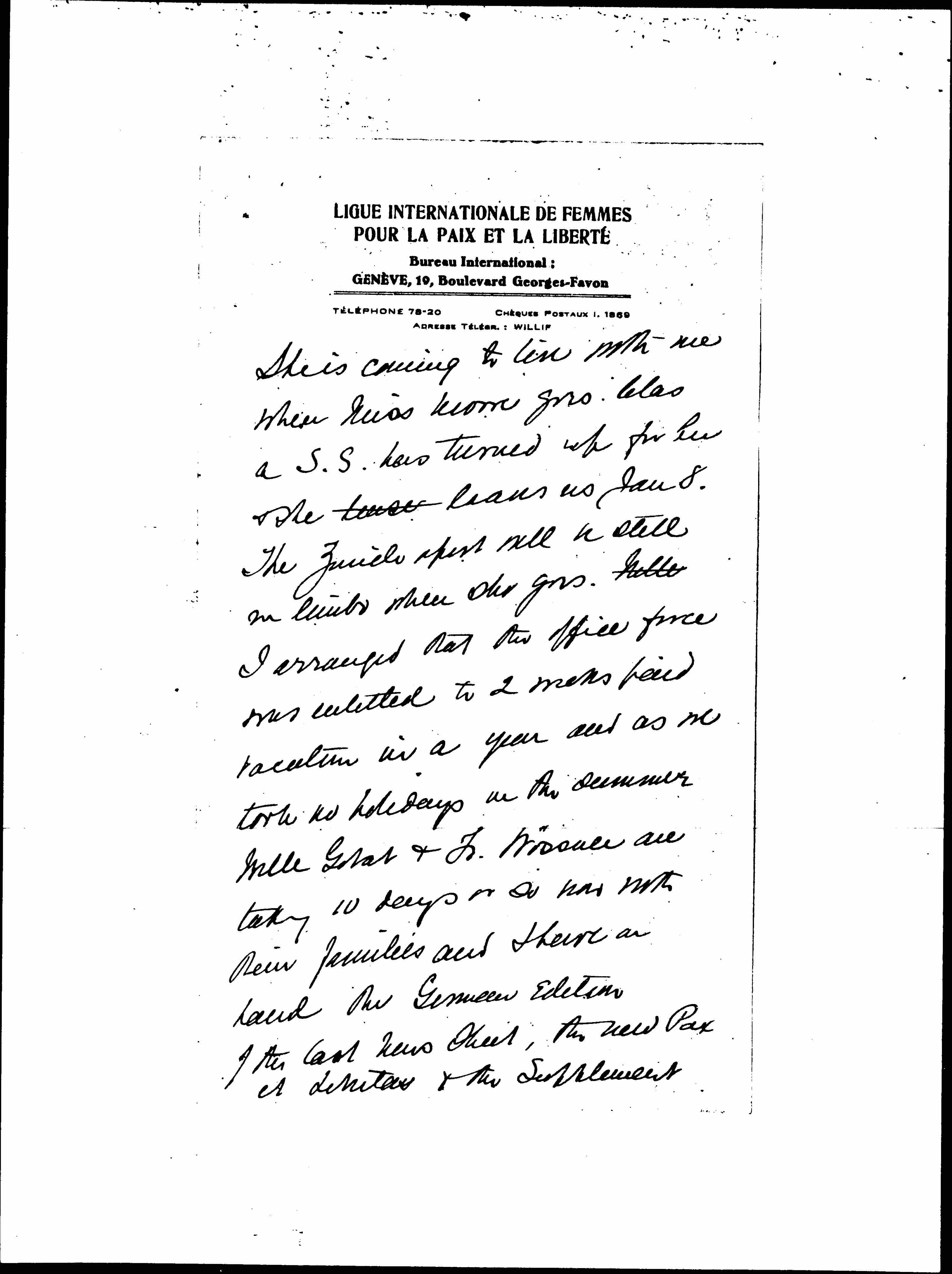 She is coming to live with me when Miss Moore goes. Alas a S.S. has turned up for her & she lease leaves us Jan 8. The Zurich spirit will be still on limbs when she goes. [Mlle] I arranged that the office force was entitled to 2 weeks paid vacation in a year and as we took no holidays in the summer Mlle Gobat & Fr. Wössner are taking 10 days or so now with their families and I have on hand the German Edition of the last news sheet, the new Pax et Libertas & the supplement [page 8] which I should like to bring out at once, so I have enough to do.