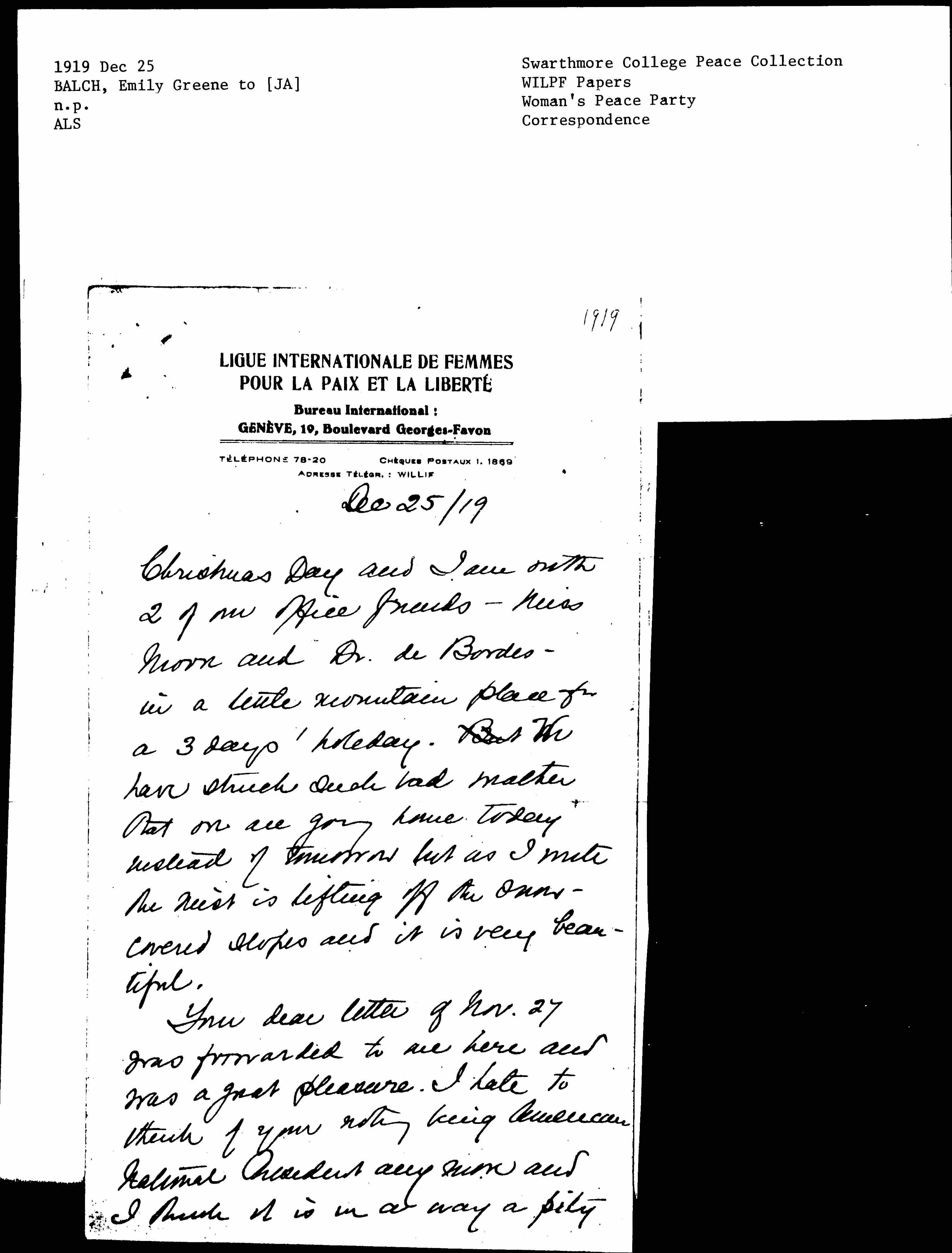Christmas Day and I am with 2 of our office friends -- Miss [Moore] and Dr. de Bordes -- in a little mountain place for a 3 days' holiday. But We have struck such bad weather that we are going home today instead of tomorrow but as I write the mist is lifting off the snow-covered slopes and it is very beautiful.