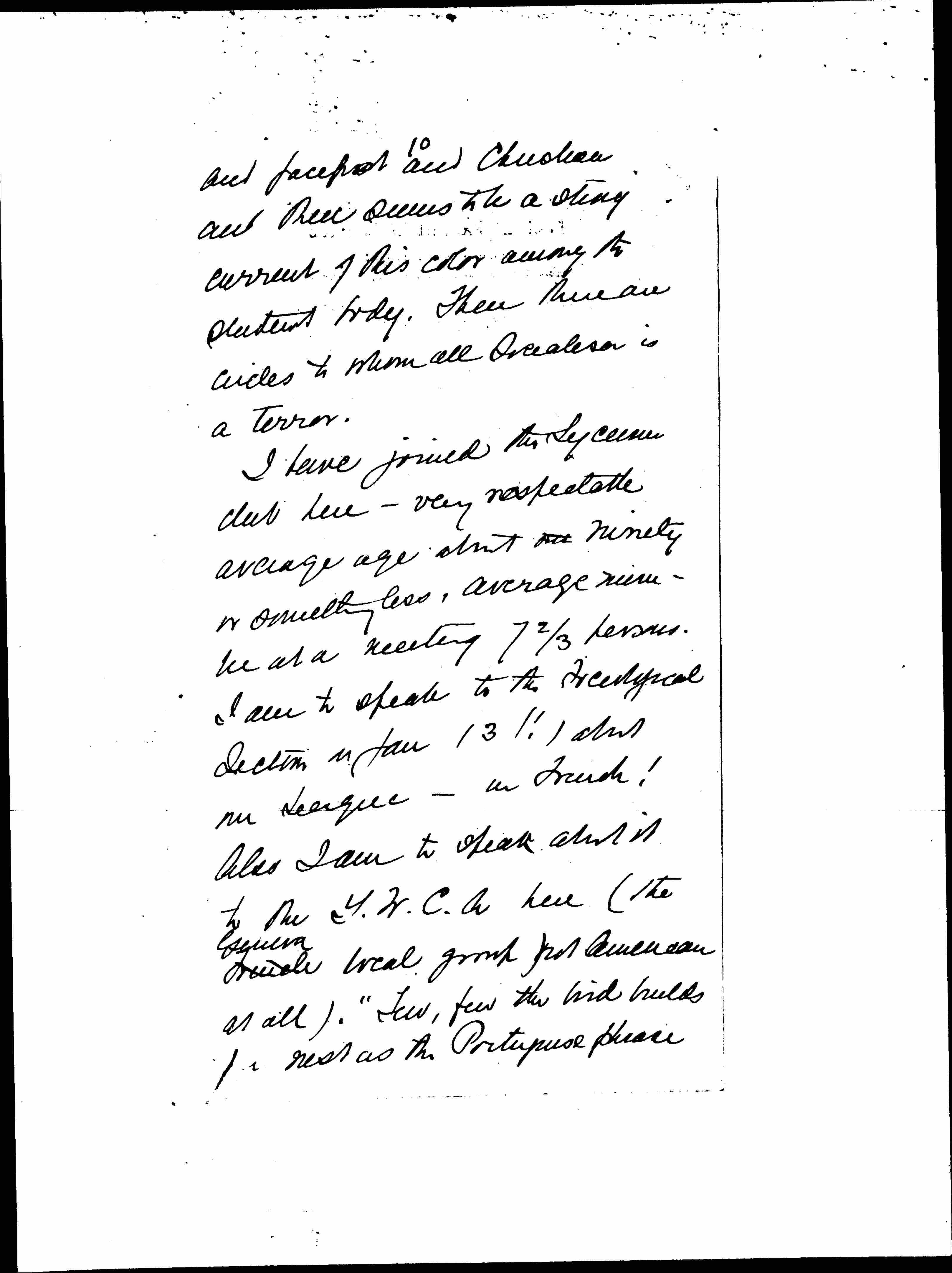 I have joined the Lyceum club here -- very respectable average age about one ninety or something less, average number at a meeting 7 2/3 persons. I aim to speak to the Sociological Section on Jan 13 (!) about our League -- in French! Also I am to speak about it to the Y.W.C.A. here (the French ↑Geneva↓ local group, not American at all). "Few, few the bird builds [her] nest as the Portuguese phrase [page 11] book had it.