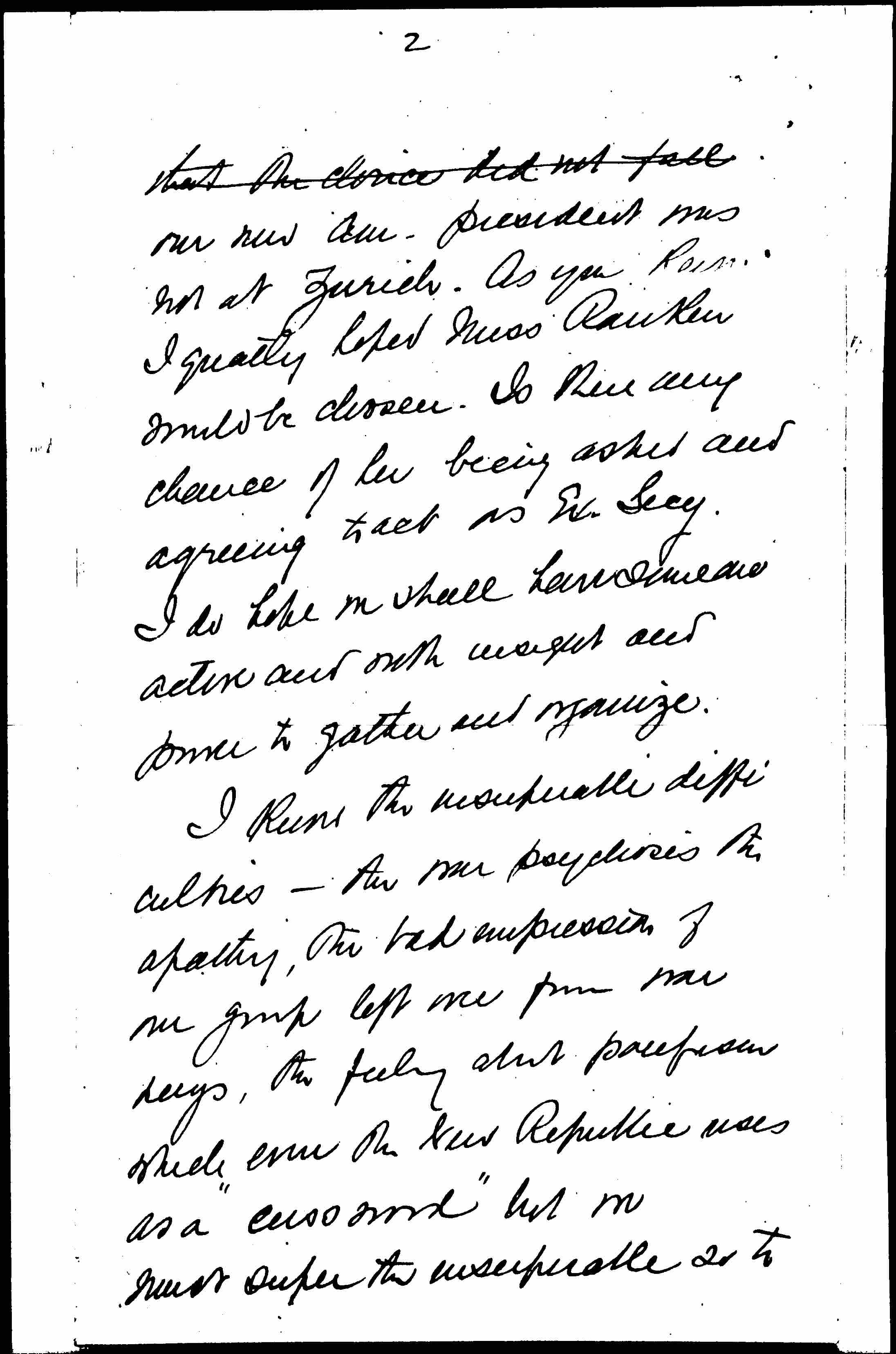 Your dear letter of Nov. 27 was forwarded to me here and was a great pleasure. I hate to think of your [not] being American National President any more and I think it is in a way a pity [page 2] that the chance did not fall our new Am. president was not at Zurich. As you [know] I greatly hoped Miss Rankin would be chosen. Is there any chance of her being asked and agreeing to act as Ex. Secy. I do hope we shall have someone active and with insight and power to gather and organize.