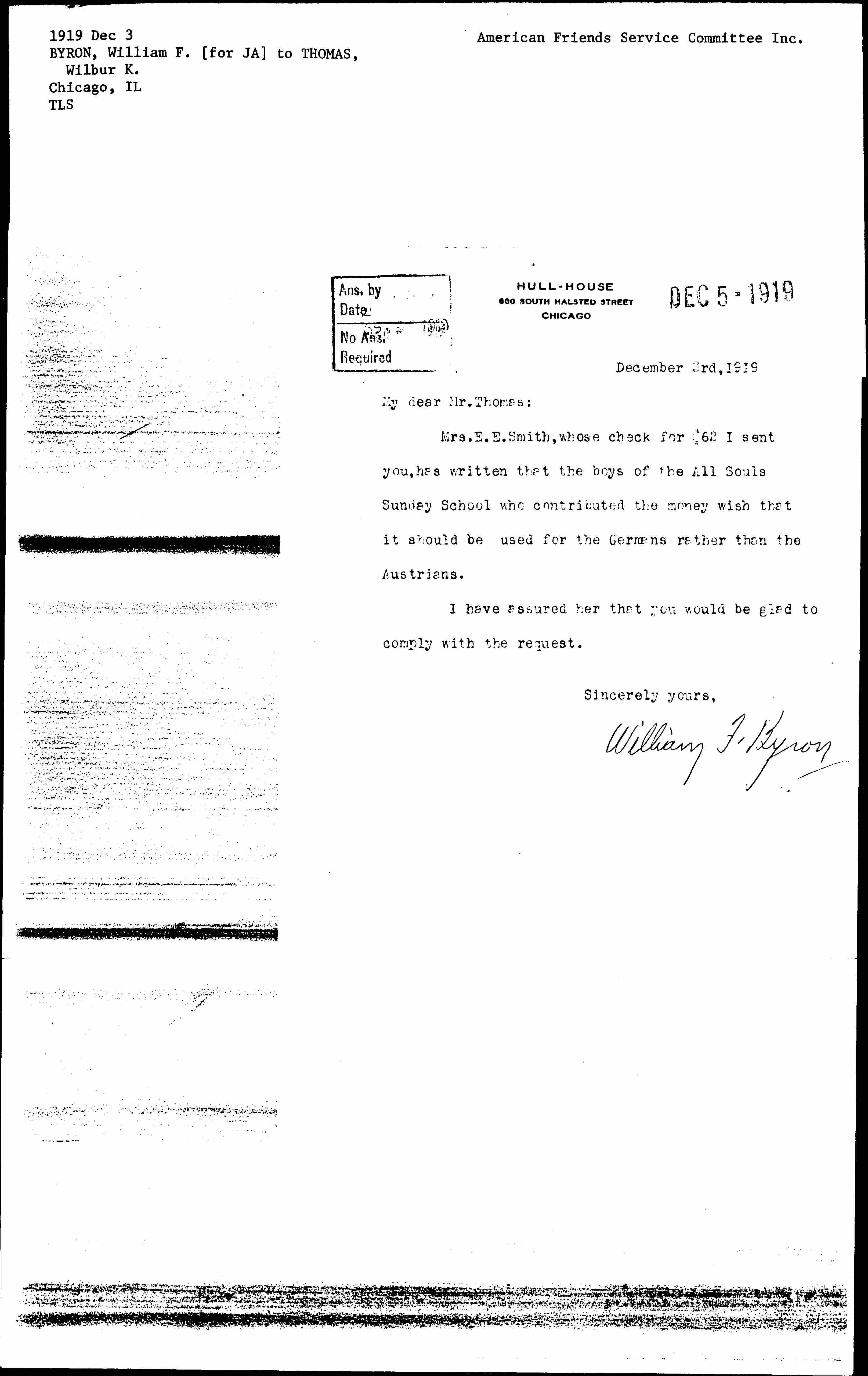 Mrs. E. E. Smith, whose check for $62 I sent you, has written that the boys of the All Souls Sunday School who contributed the money wish that it should be used for the Germans rather than the Austrians.