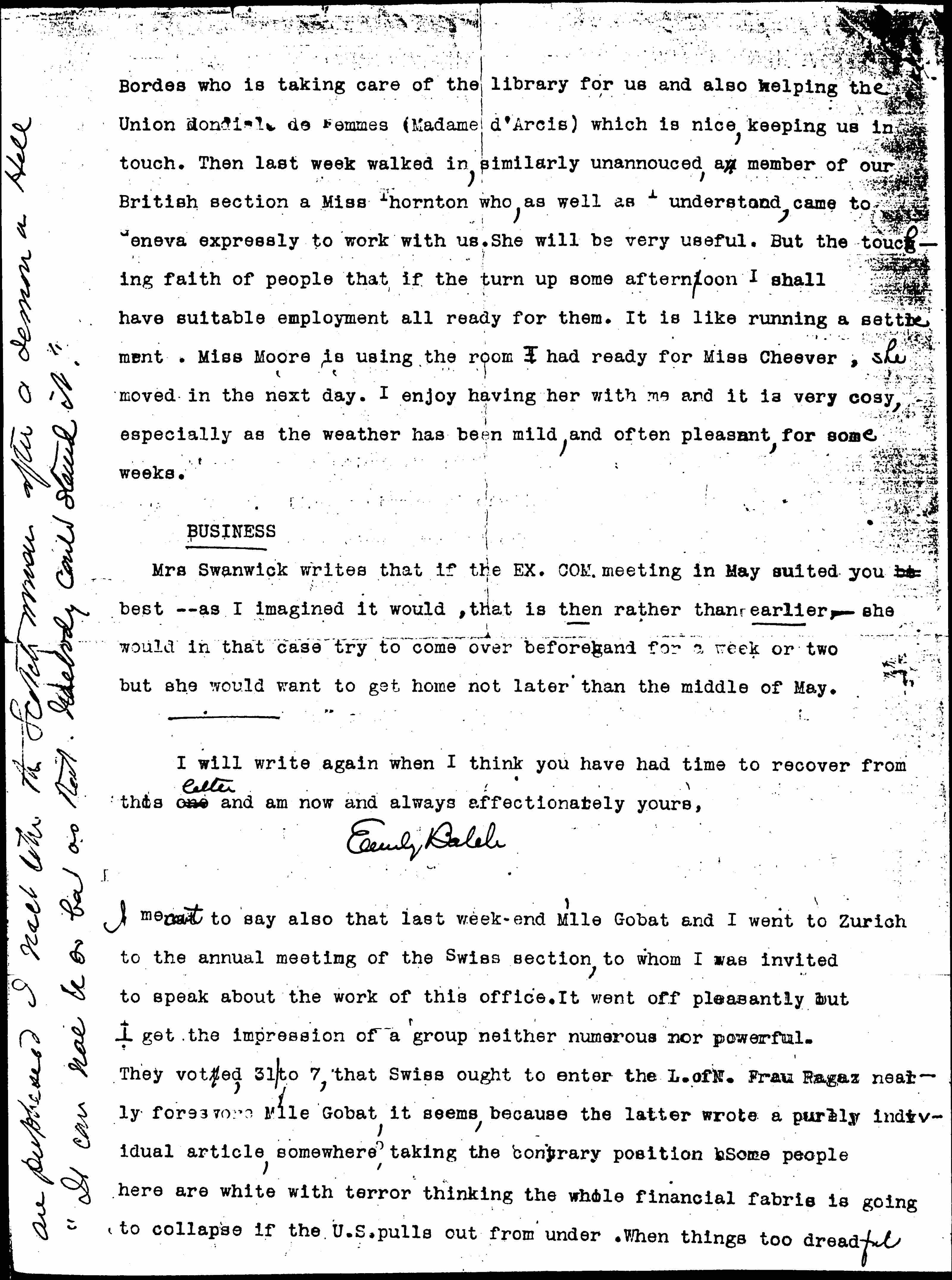 I meant to say also that last weekend Mlle Gobat and I went to Zurich to the annual meeting of the Swiss section, to whom I was invited to speak about the work of this office. It went off pleasantly but I get the impression of a group neither numerous nor powerful. They voted, 31 to 7, that Swiss ought to enter the L. of N. Frau Ragaz nearly foreswore Mlle Gobat, it seems, because the latter wrote purely individual article, somewhere, taking the contrary position. Some people here are white with terror thinking the whole financial [fabric] is going to collapse if the U.S. pulls out from under. When things too dreadful [written up left margin] are prophesied I react like the Scotch woman after a demon in Hell "It can nae be so bad as that. Nobody could stand it."