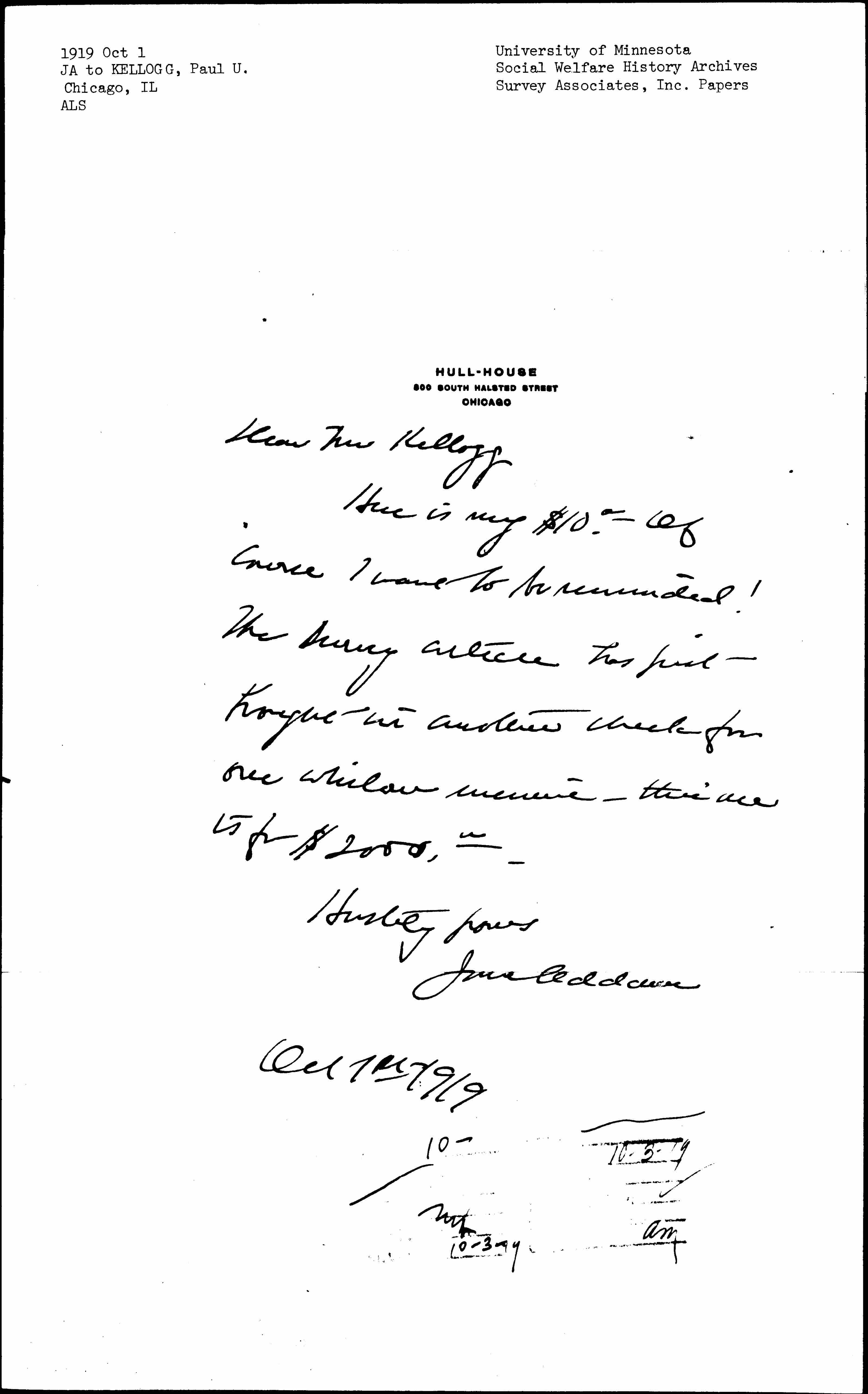 Here is my $10.00. Of course I want to be reminded! The Survey article has just brought in another check for our whilom [enemies] -- this one is for $2000.00.