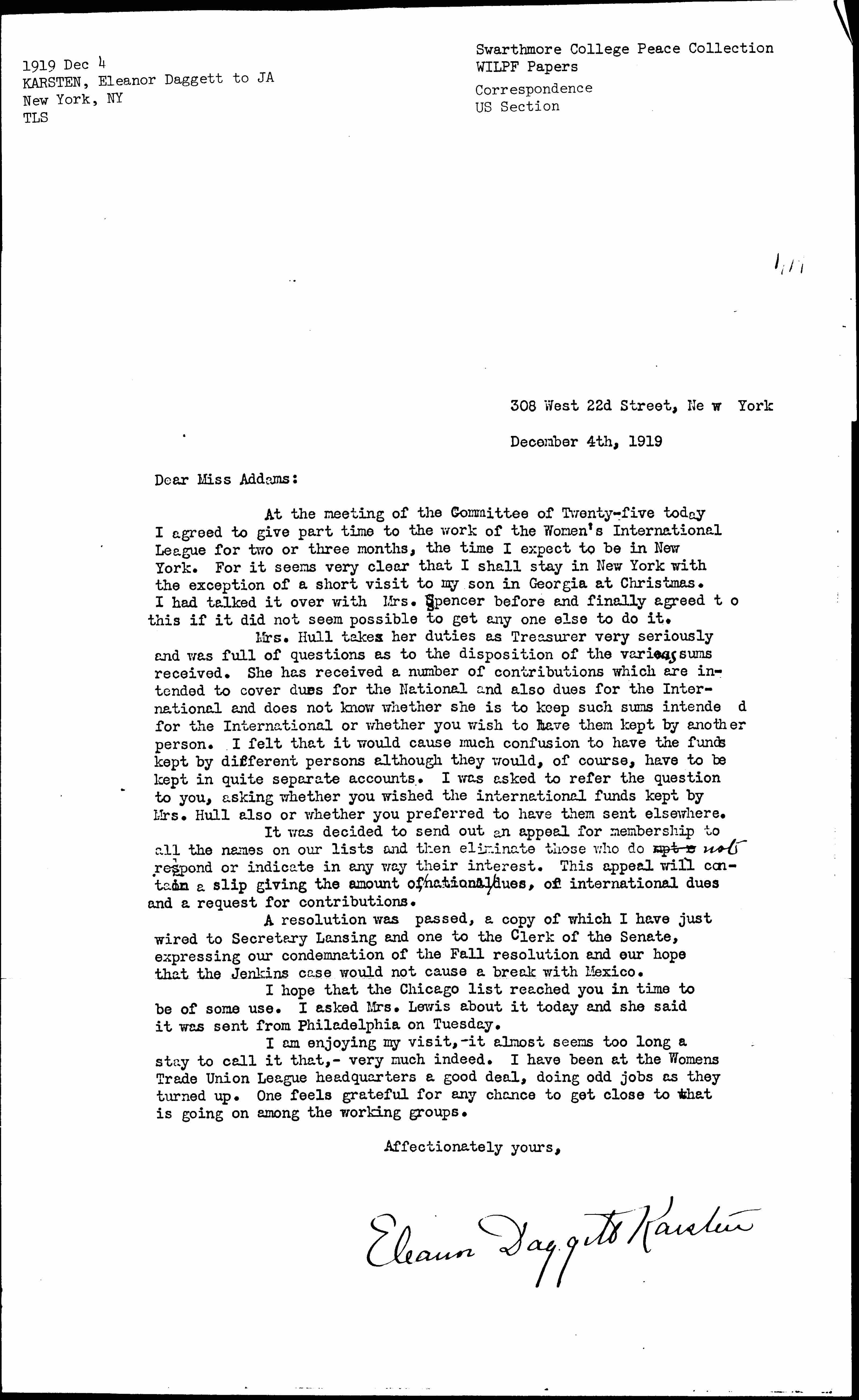 At the meeting of the Committee of Twenty-five today I agreed to give part time to the work of the Women's International League for two or three months, the time I expect to be in New York. For it seems very clear that I shall stay in New York with the exception of a short visit to my son in Georgia at Christmas. I had talked it over with Mrs. Spencer before and finally agreed to this if it did not seem possible to get [anyone] else to do it.