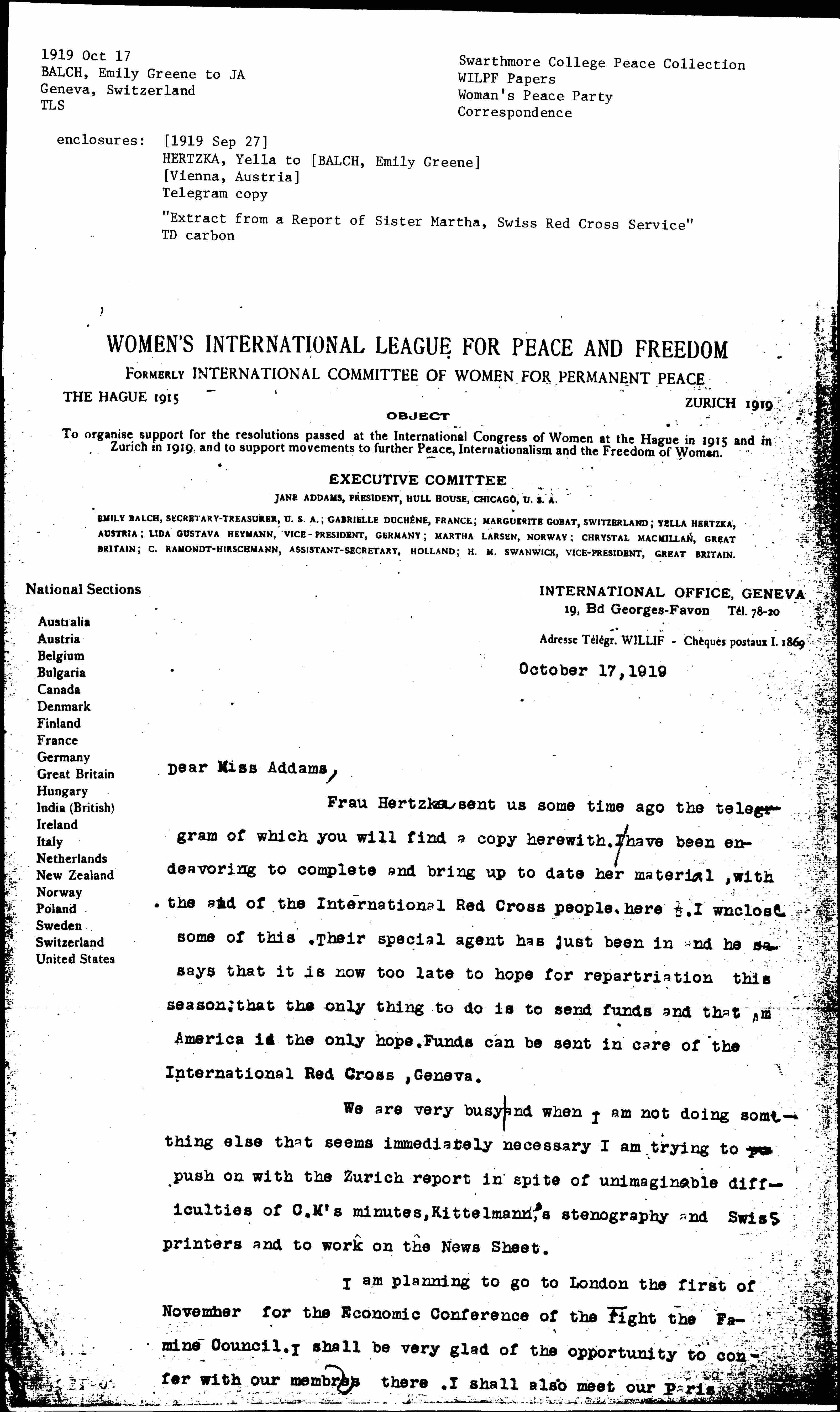 Since Madam Ramondt and her daughter and Fr. Heymann left, the end of Aug., we have ↑had↓ less volunteer help. A charming Russian girl Eléna Wiskovatoff has been helping at a franc an hour very effectively, but I have let Professor Herron have first lien now on her time both for her advancement and to oblige him as he has done me endless favors. Then there is a miserable stranded Russian artist that I am letting work off part of some money I gave her by addressing News Sheets bands and now I have got a charming Austrian girl, all of whose fortune has been sequestered in France, doing copying for us at the current sweated rates. I hope I have the We are looking any [illegible] Then Miss Burritt, who has been more or less stuck here, has been putting our perfectly hopeless mass of clippings, which we had not been able to touch before, into order. [illegible] Meanwhile I find Miss Moore (the Australian) [who] is an expert stenographer would come and help us for some months, during which time she cannot get passage home, for her expenses. I expect her any day now and shall then feel immensely relieved as I hope she can work on the ↑Zurich↓ report but I notice Fraulein Wosner ↑Wössner↓ is counting on her relieving her so that she can finish the accounts for the four months June-october September inclusive. We also expect Miss Macnaghten any time now (she has been delayed by a bad foot) and I hope she will be our librarian. As it is now we cannot get much good out our really [page 3] very interesting material. She comes as a volunteer.