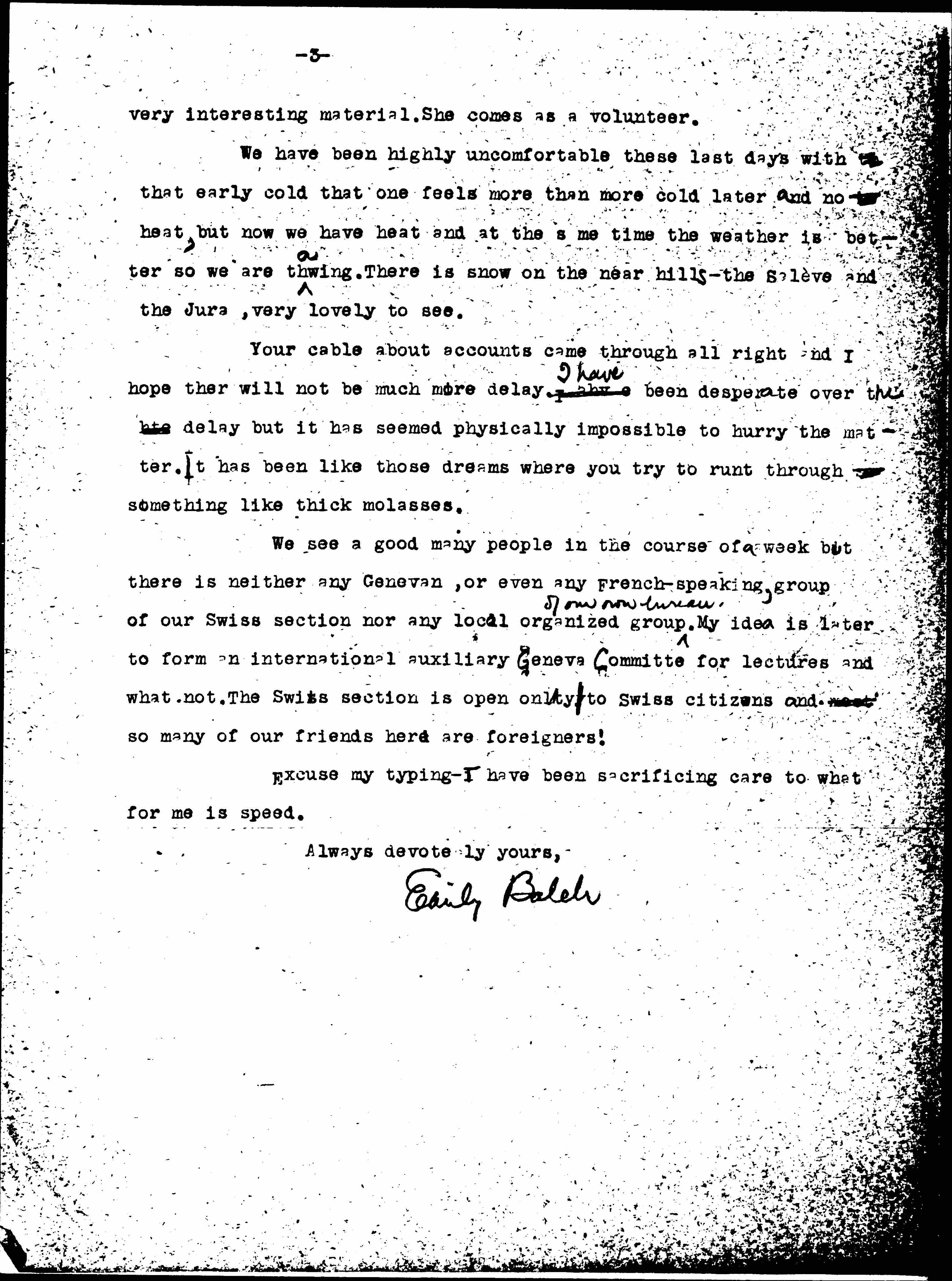 We see a good many people in the course of ↑a↓ week but there is neither any Genevan, or even any French-speaking, group of our Swiss section nor any local organized group ↑of our own bureau↓. My idea is later to form an international auxiliary Geneva [Committee] for lectures and what not. The Swiss section is open only to Swiss citizens and [illegible] so many of our friends here are foreigners!