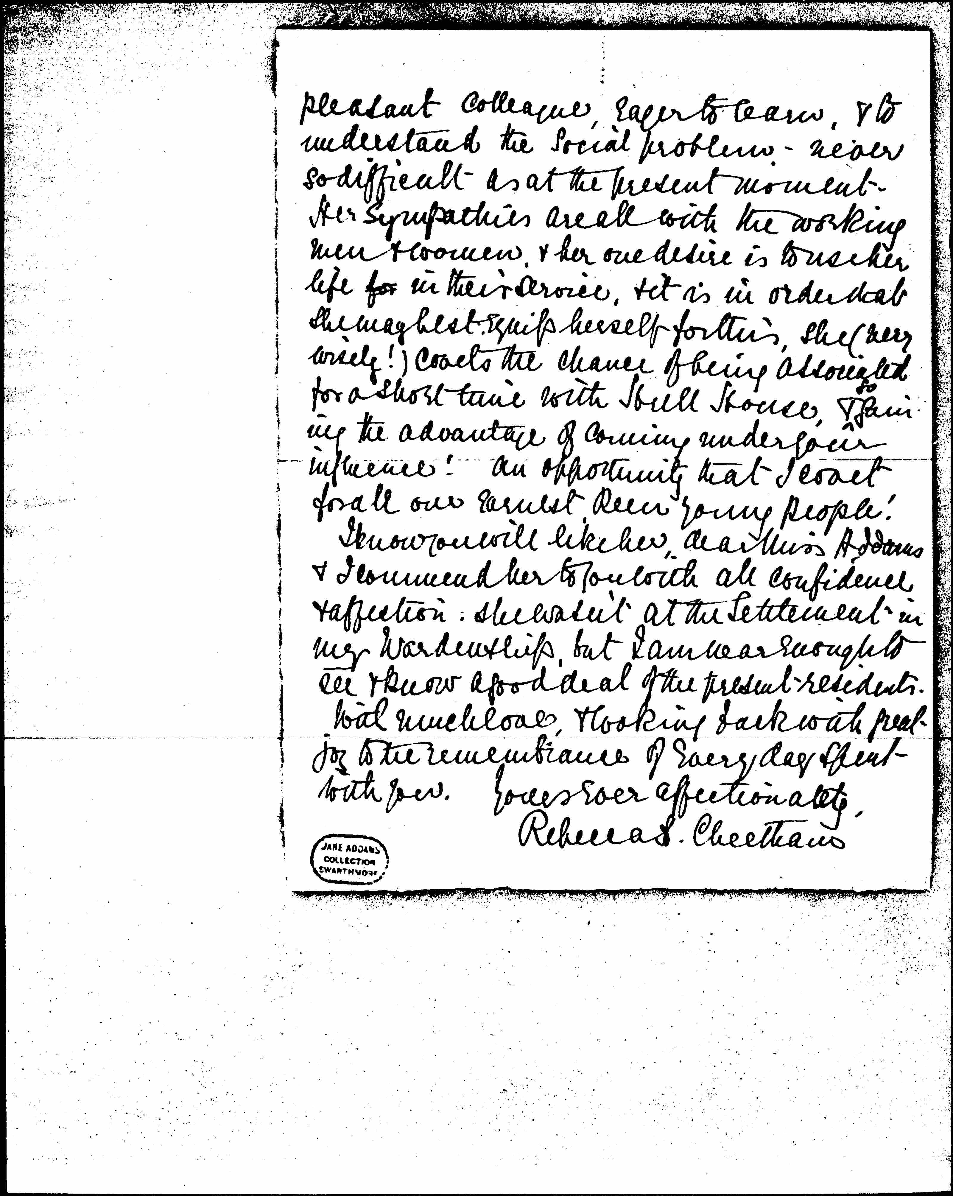 I know you will like her, dear Miss Addams & I commend her to you with all confidence & affection. She wasn't at the Settlement in my Wardenship, but I am near enough to see & know a good deal of the present residents.