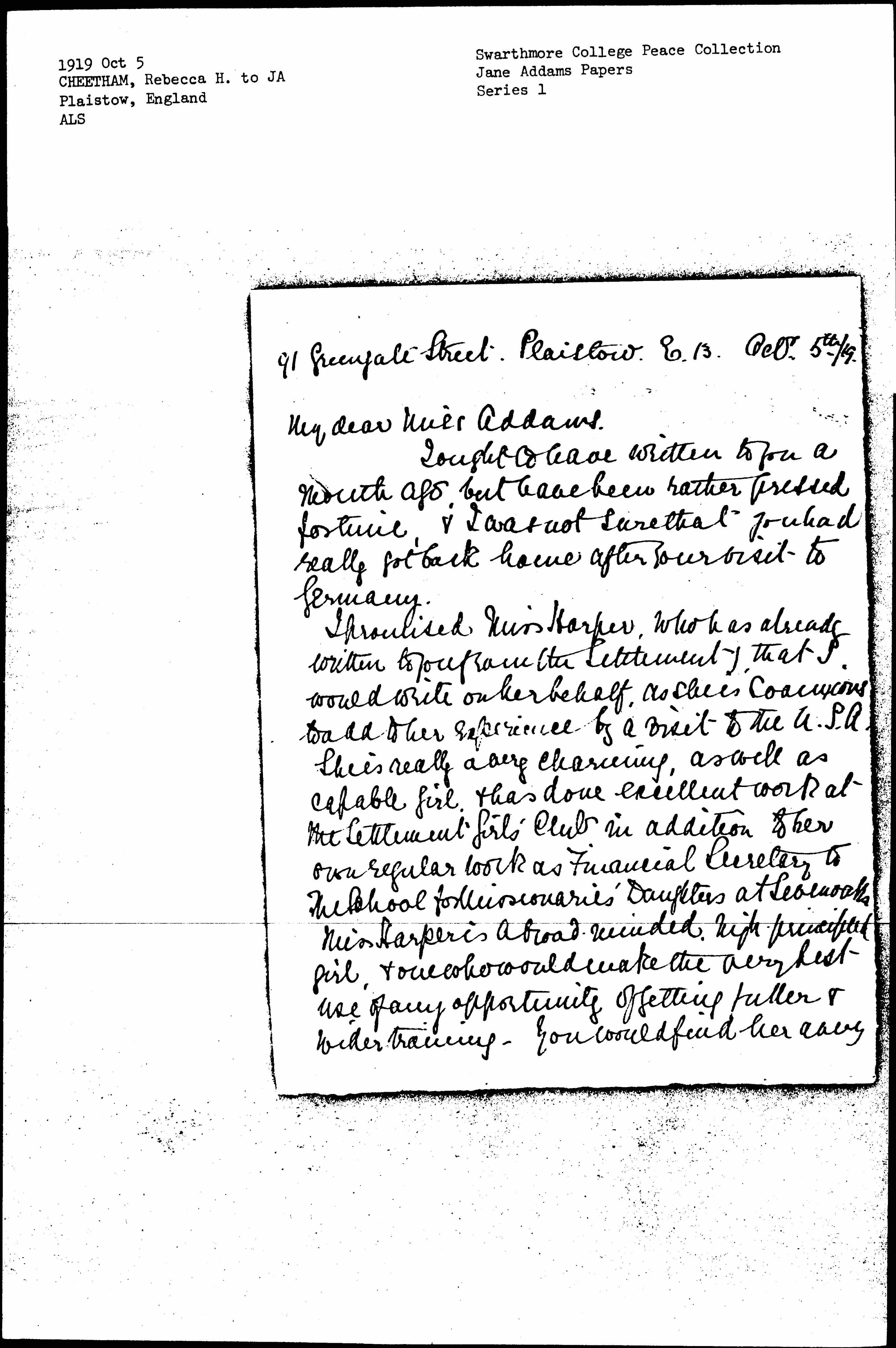 I promised Miss Harper, who has already written to you from the Settlement, that I would write on her behalf, as she is so anxious to add to her experience by a visit to the U.S.A. She is really a very charming, as well as capable girl & has done excellent work at the Settlement Girls' Club in addition to her own regular work as Financial Secretary to the School for Missionaries' Daughters at Sevenoaks. Miss Harper is a broad-minded, high-principled girl, & one who would make the very best use of any opportunity of getting fuller & wider training. You would find her a very [page 2] pleasant colleague, eager to learn, & to understand the social problem -- never so difficult as at the present moment. Her sympathies are all with the working men & women & her one desire is to use her life for in their service, & it is in order that she may best equip herself for this. She (very wisely!) covets the chance of being associated for a short time with Hull House, & ↑so↓ gaining the advantage of coming under your influence! An opportunity that I covet for all our earnest [new?] Young People!