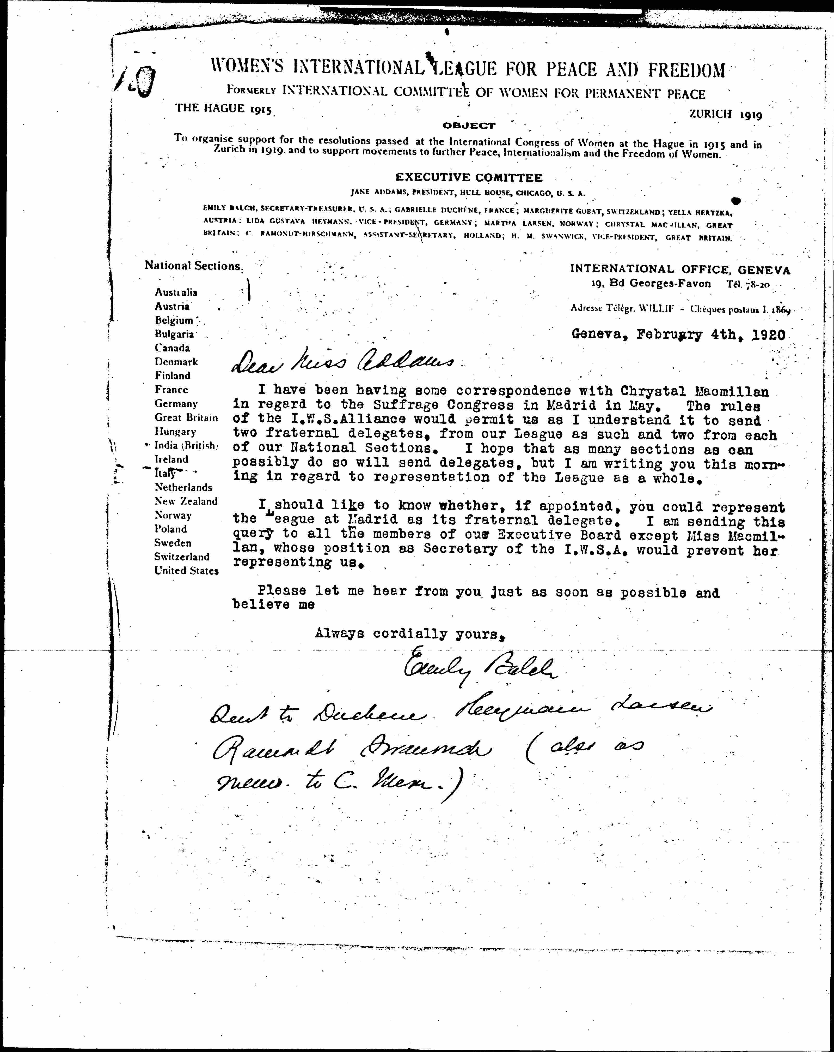 I have been having some correspondence with Chrystal Macmillan in regard to the Suffrage Congress in Madrid in May. The rules of the I.W.S. Alliance would permit us as I understand it to send two fraternal delegates, from our League as such and two from each of our National Sections. I hope that as many sections as can possibly do so will send delegates, but I am writing you this morning in regard to representation of the League as a whole.