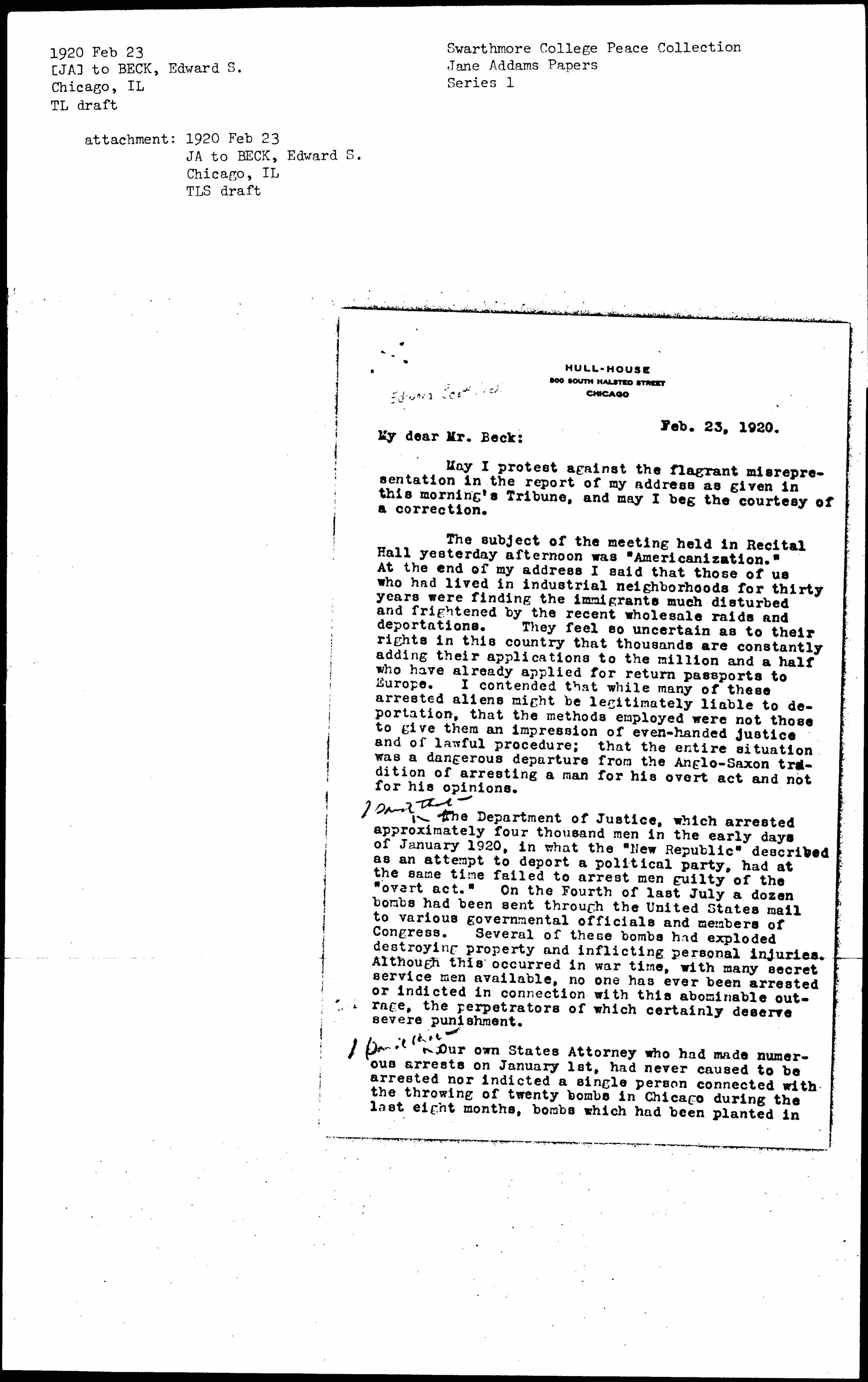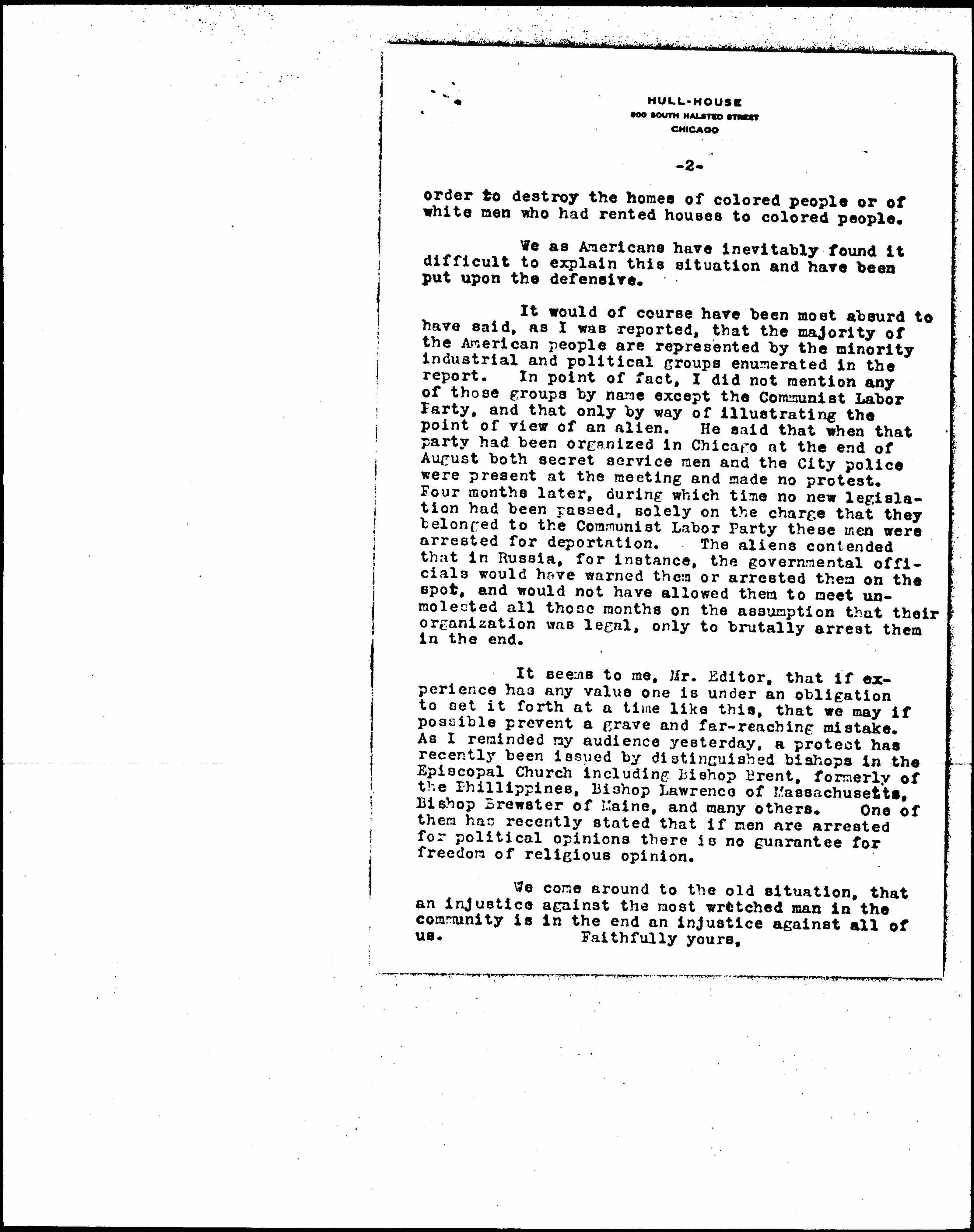 The subject of the meeting held in Recital Hall yesterday afternoon was "Americanization." At the end of my address I said that those of us who had lived in industrial neighborhoods for thirty years were finding the immigrants much disturbed and frightened by the recent wholesale raids and deportations. They feel so uncertain as to their rights in this country that thousands are constantly adding their applications to the million and a half who have already applied for return passports to Europe. I contended that while many of these arrested aliens might be legitimately liable to deportation, that the methods employed were not those to give them an impression of even-handed justice and of lawful procedure; that the entire situation was a dangerous departure from the Anglo-Saxon tradition of arresting a man for his overt act and not for his opinions.