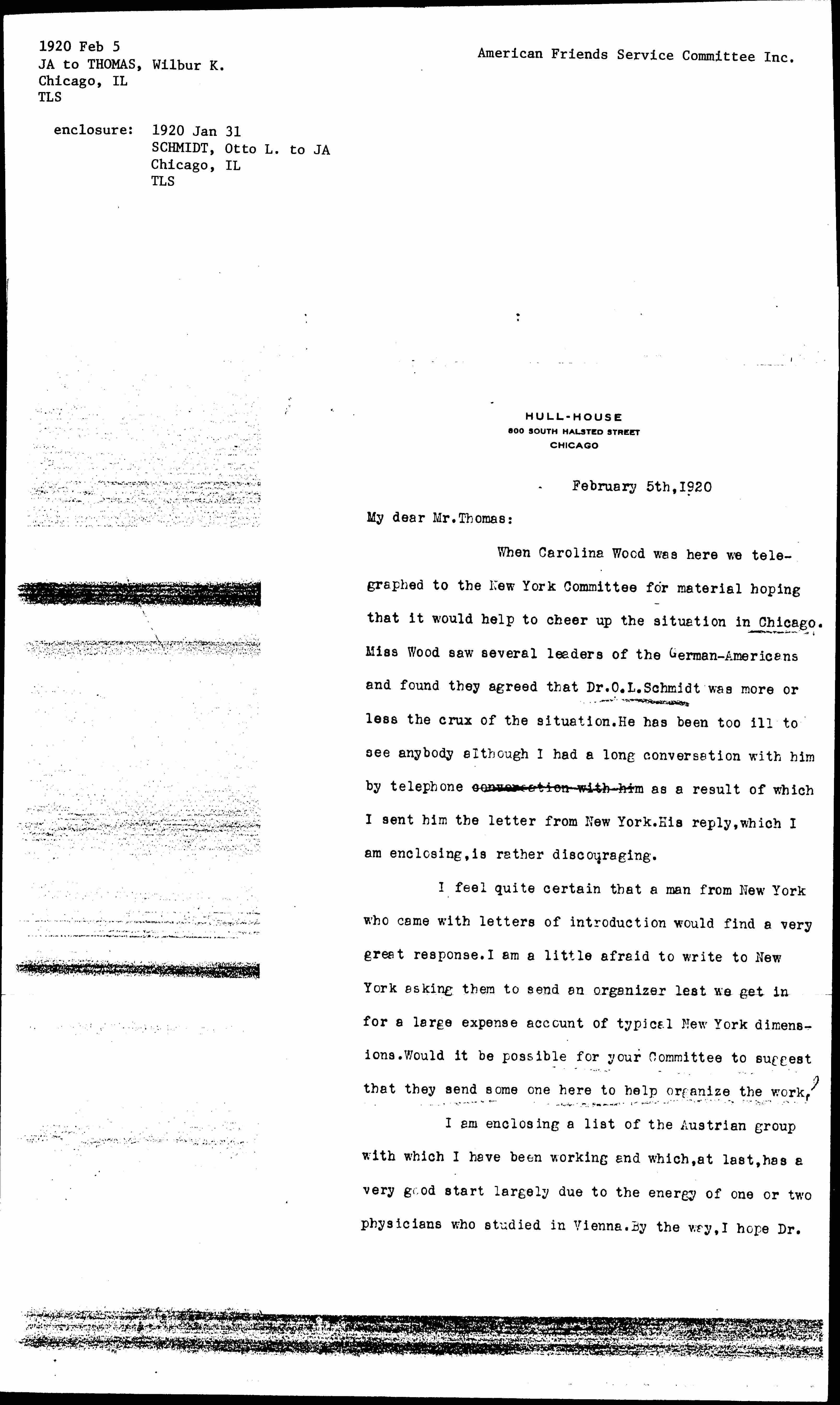When [Carolena] Wood was here we telegraphed to the New York Committee for material hoping that it would help to cheer up the situation in Chicago. Miss Wood saw several leaders of the German-Americans and found they agreed that Dr. O. L. Schmidt was more or less the crux of the situation. He has been too ill to see anybody although I had a long conversation with him by telephone conversation with him as a result of which I sent him the letter from New York. His reply, which I am enclosing, is rather discouraging.