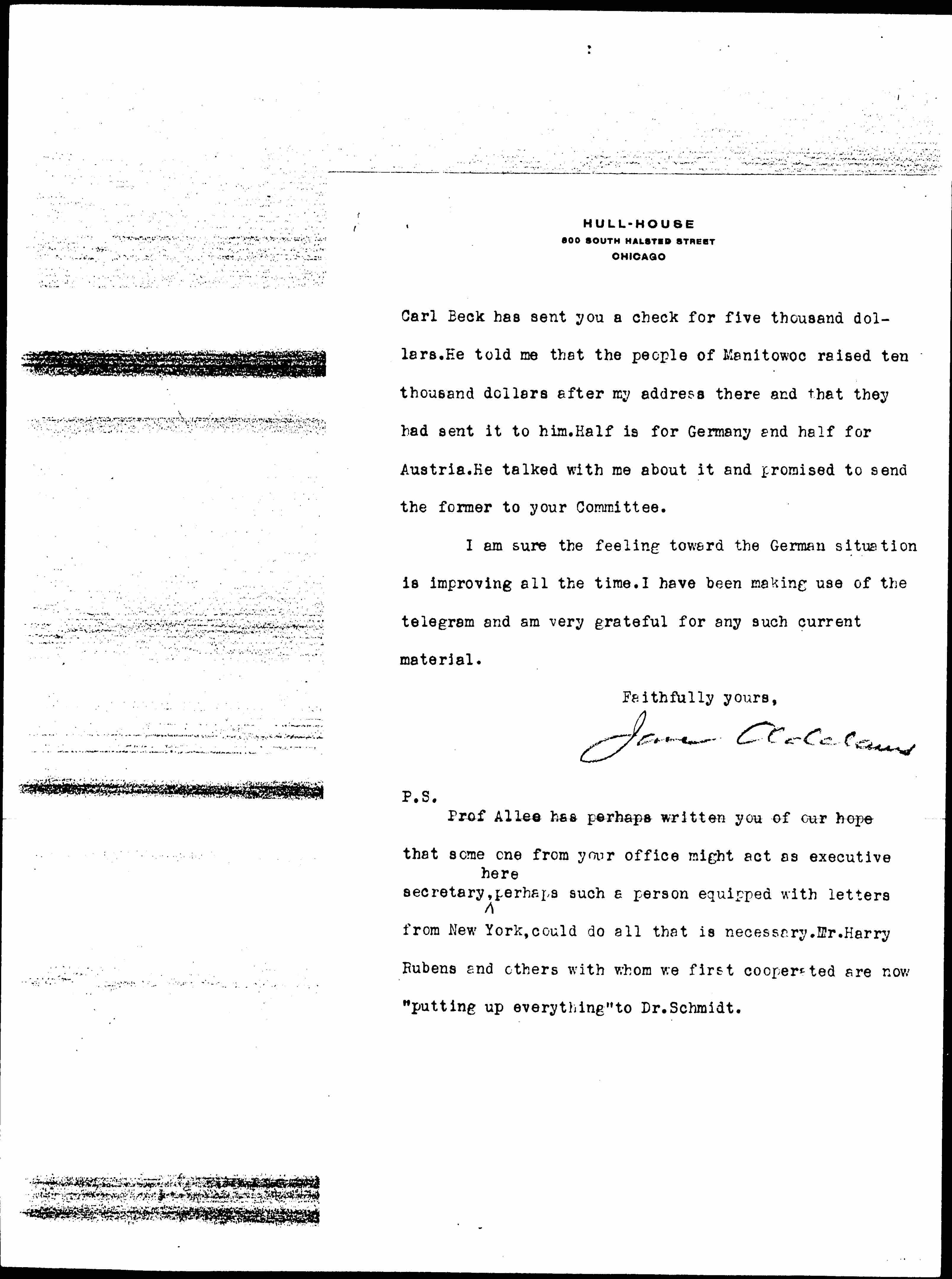 Prof Allee has perhaps written you of our hope that some one from your office might act as executive secretary ↑here↓, perhaps such a person equipped with letters from New York, could do all that is necessary. Mr. Harry Rubens and others with whom we first cooperated are now "putting up everything" to Dr. Schmidt.