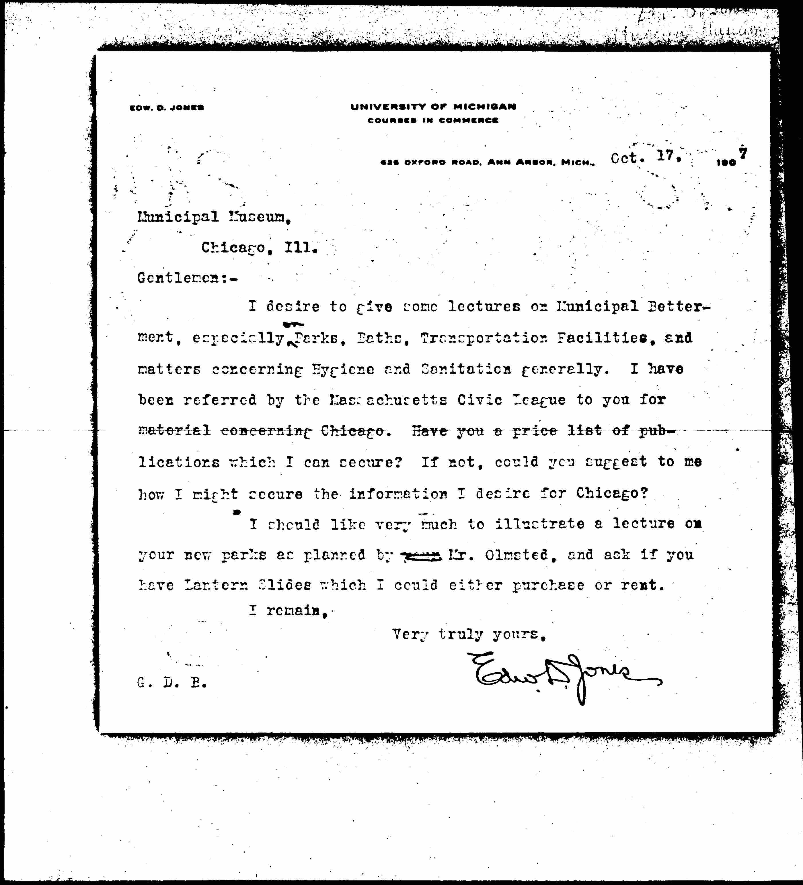 I desire to give some lectures on Municipal Betterment, especially <on> Parks, Baths, Transportation Facilities, and matter concerning Hygiene and Sanitation generally. I have been referred by the Massachusetts Civic League to you for material concerning Chicago. Have you a price list of publications which I can secure? If not, could you suggest to me how I might secure the information I desire for Chicago?