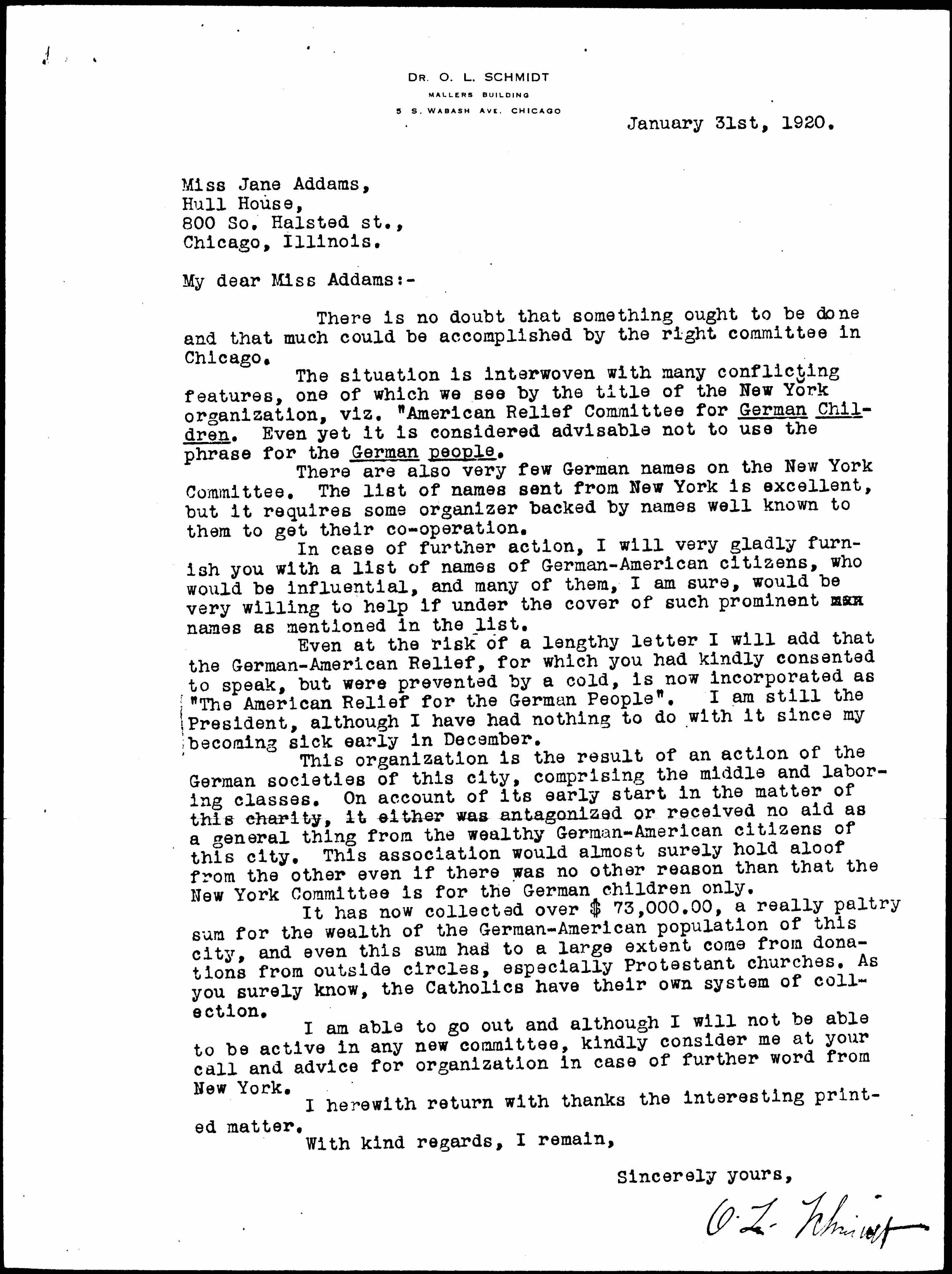 Even at the risk of a lengthy letter I will add that the German-American Relief, for which you had kindly consented to speak, but were prevented by a cold, is now incorporated as "The American Relief for the German People". I am still the President, although I have had nothing to do with it since my becoming sick early in December.