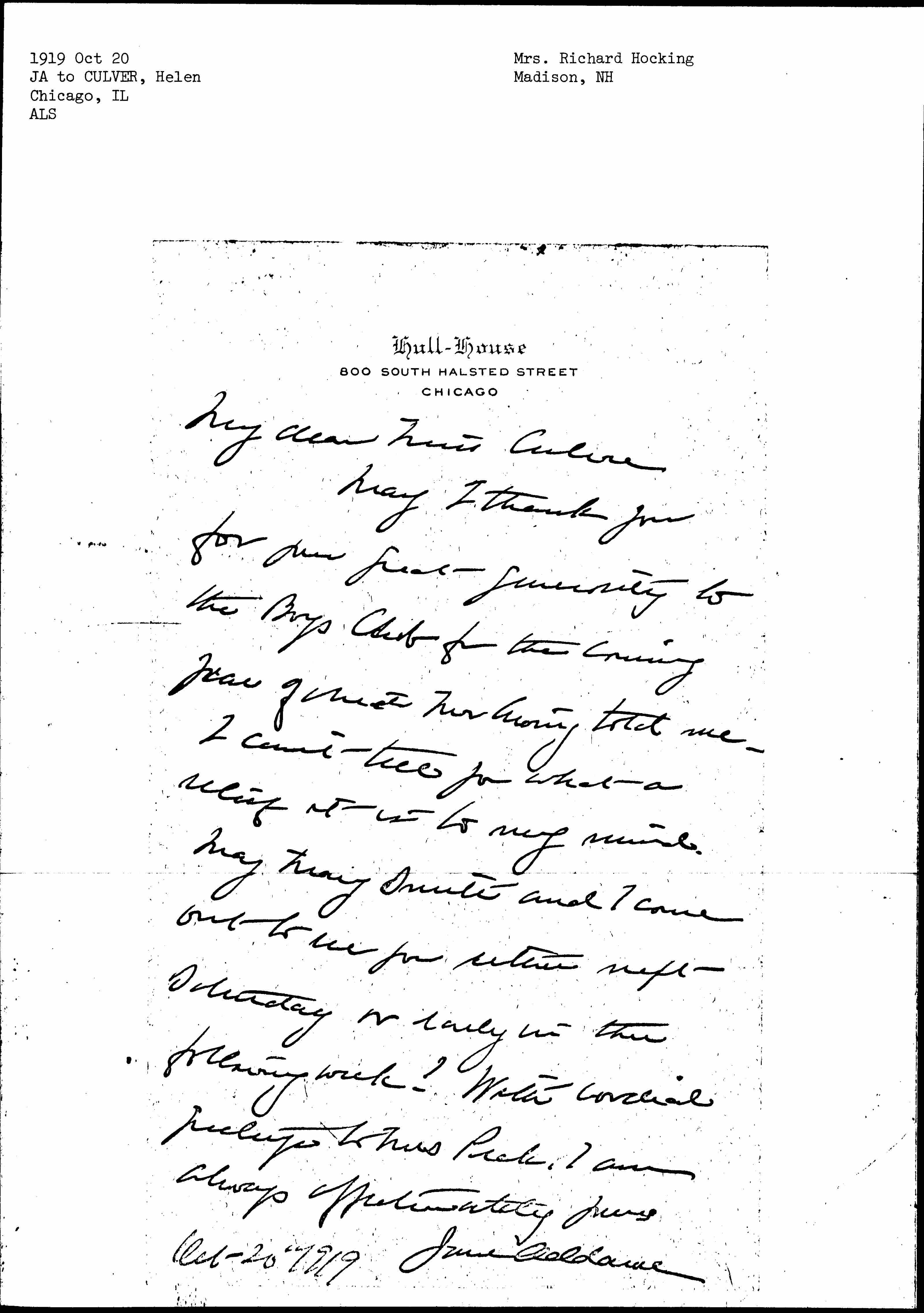 May I thank you for your great generosity to the Boys Club for the coming year of which Mr Ewing told me. I can't tell you what a relief it is to my mind. May Mary Smith and I come out to see you either next Saturday or early in the following week? With cordial greetings to Mrs Peck, I am always affectionately yours