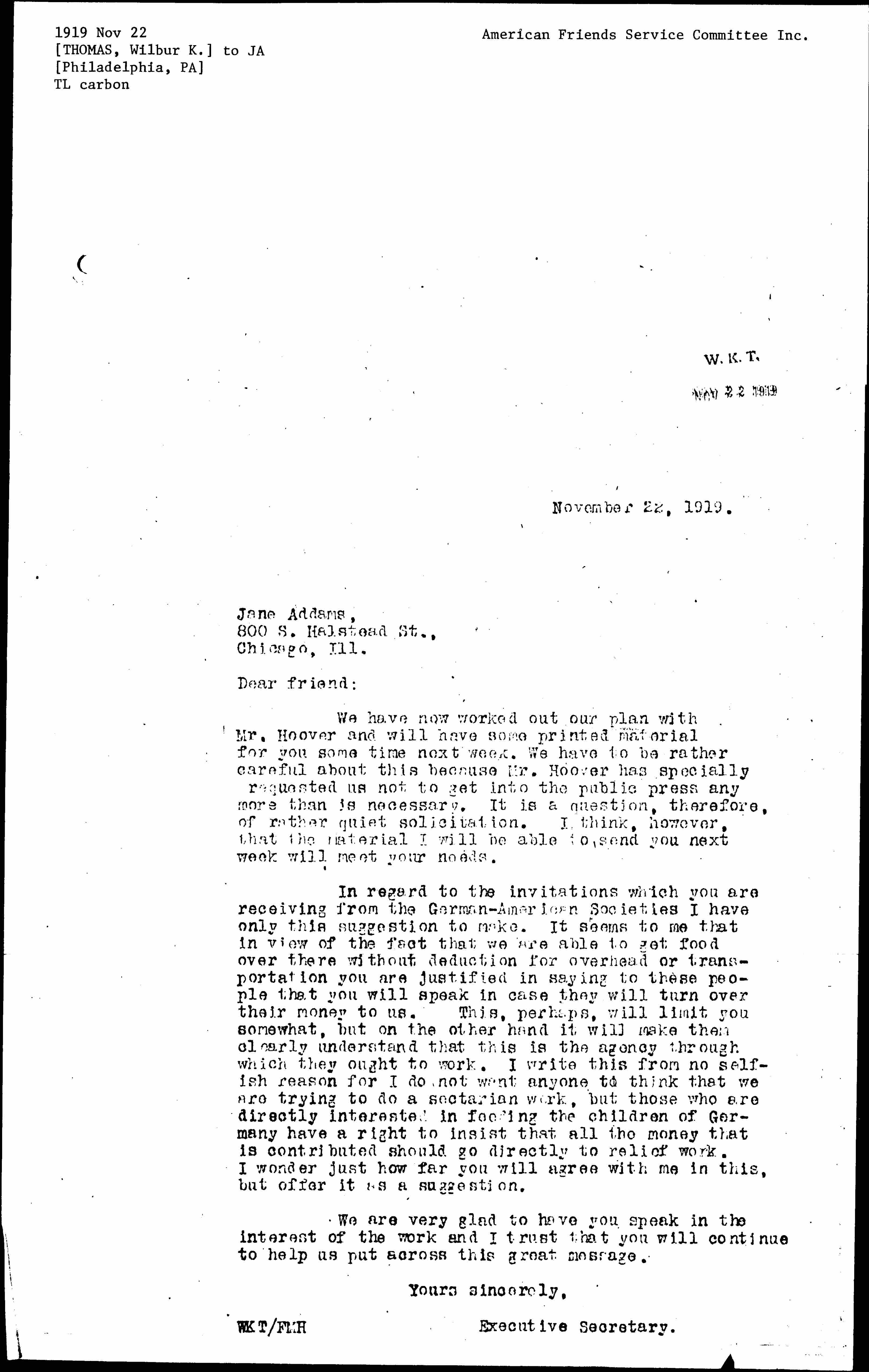 In regard to the invitations which you are receiving from the German-American Societies I have only this suggestion to make. It seems to me that in view of the fact that we are able to get food over there without deduction for overhead or transportation you are justified in saying to these people that you will speak in case they will turn over their money to us. This, perhaps, will limit you somewhat, but on the other hand it will make them clearly understand that this is the agency through which they ought to work. I write this from no selfish reason for I do not want anyone to think that we are trying to do a sectarian work, but those who are directly interested in feeding the children of Germany have a right to insist that all the money that is contributed should go directly to relief work. I wonder just how far you will agree with me in this, but offer it as a suggestion.