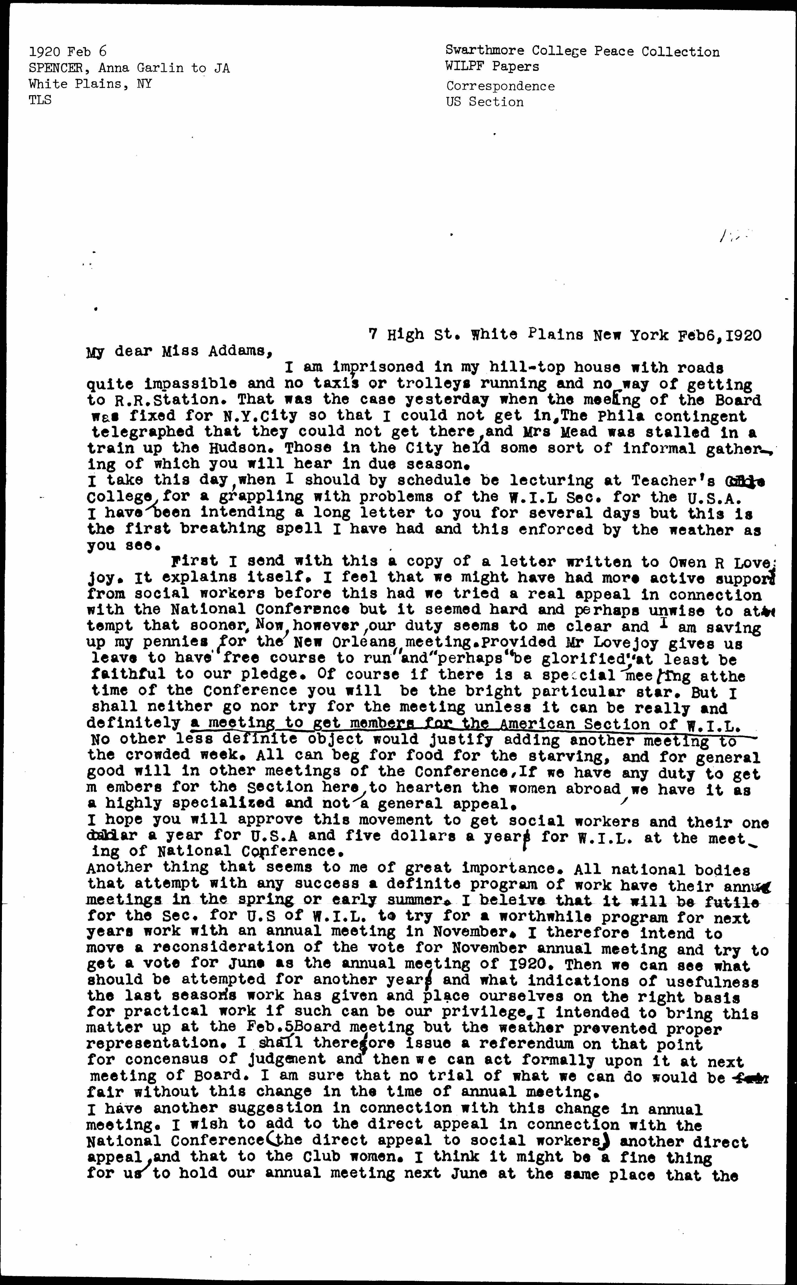 First I send with this a copy of a letter written to Owen R Lovejoy. It explains itself. I feel that we might have had more active support from social workers before this had we tried a real appeal in connection with the National Conference but it seemed hard and perhaps unwise to attempt that sooner. Now, however, our duty seems to me clear and I am saving up my pennies for the New Orleans meeting. Provided Mr Lovejoy gives us leave to have "free course to run" and perhaps “be glorified,” at least be faithful to our pledge. Of course if there is a special meeting at the time of the Conference you will be the bright particular star. But I shall neither go nor try for the meeting unless it can be really and definitely a meeting to get members for the American Section of W.I.L. No other less definite object would justify adding another meeting to the crowded week. All can beg for food for the starving, and for general good will in other meetings of the Conference. If we have any duty to get members for the Section here, to hearten the women abroad, we have it as a highly specialized and not a general appeal.