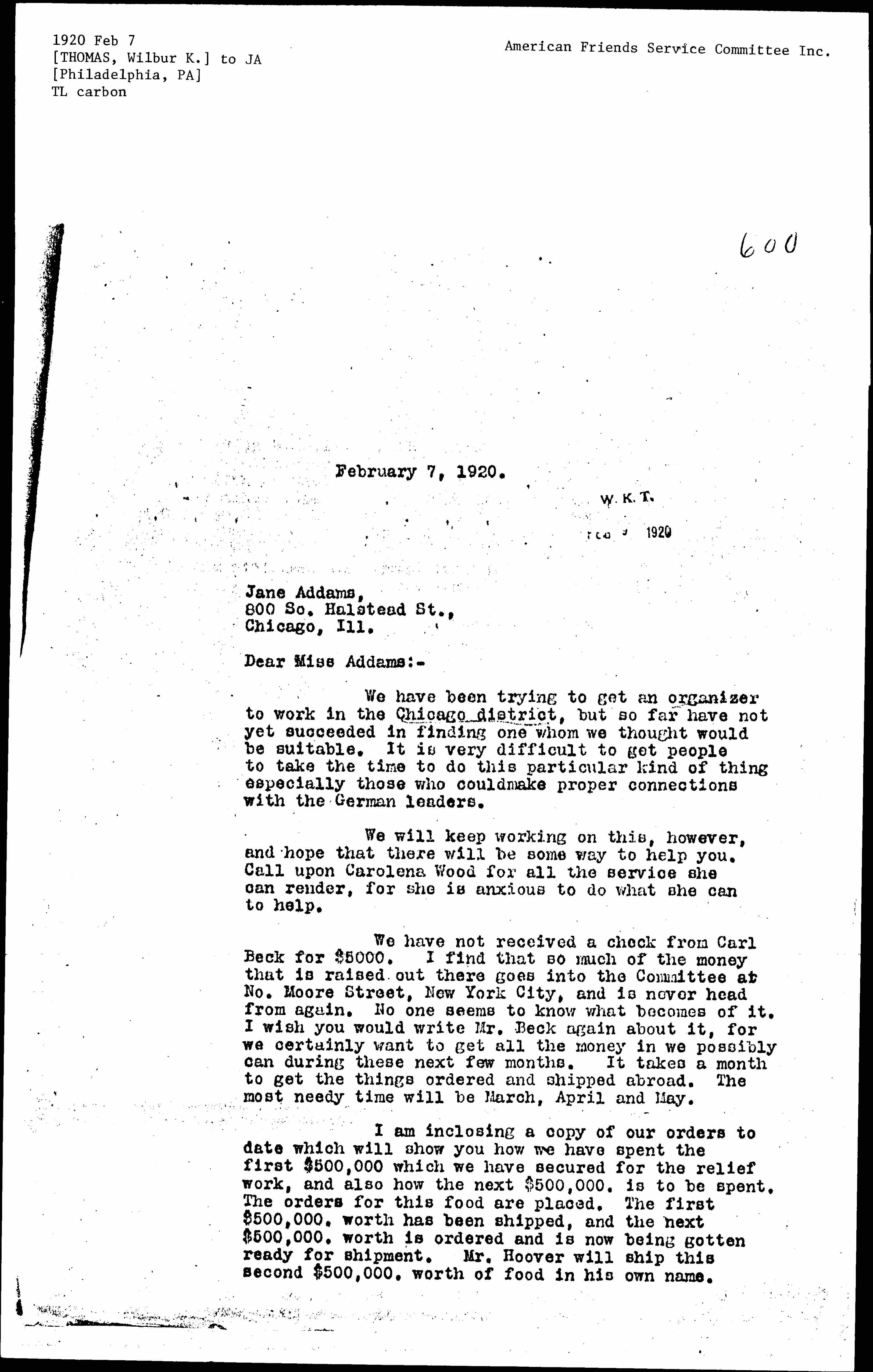 We have not received a check from Carl Beck for $5000. I find that so much of the money that is raised out there goes into the Committee at No. Moore Street, New York City, and is never [heard] from again. No one seems to know what becomes of it. I wish you would write Mr. Beck again about it, for we certainly want to get all the money in we possibly can during these next few months. It takes a month to get the things ordered and shipped abroad. The most needy time will be March, April and May.